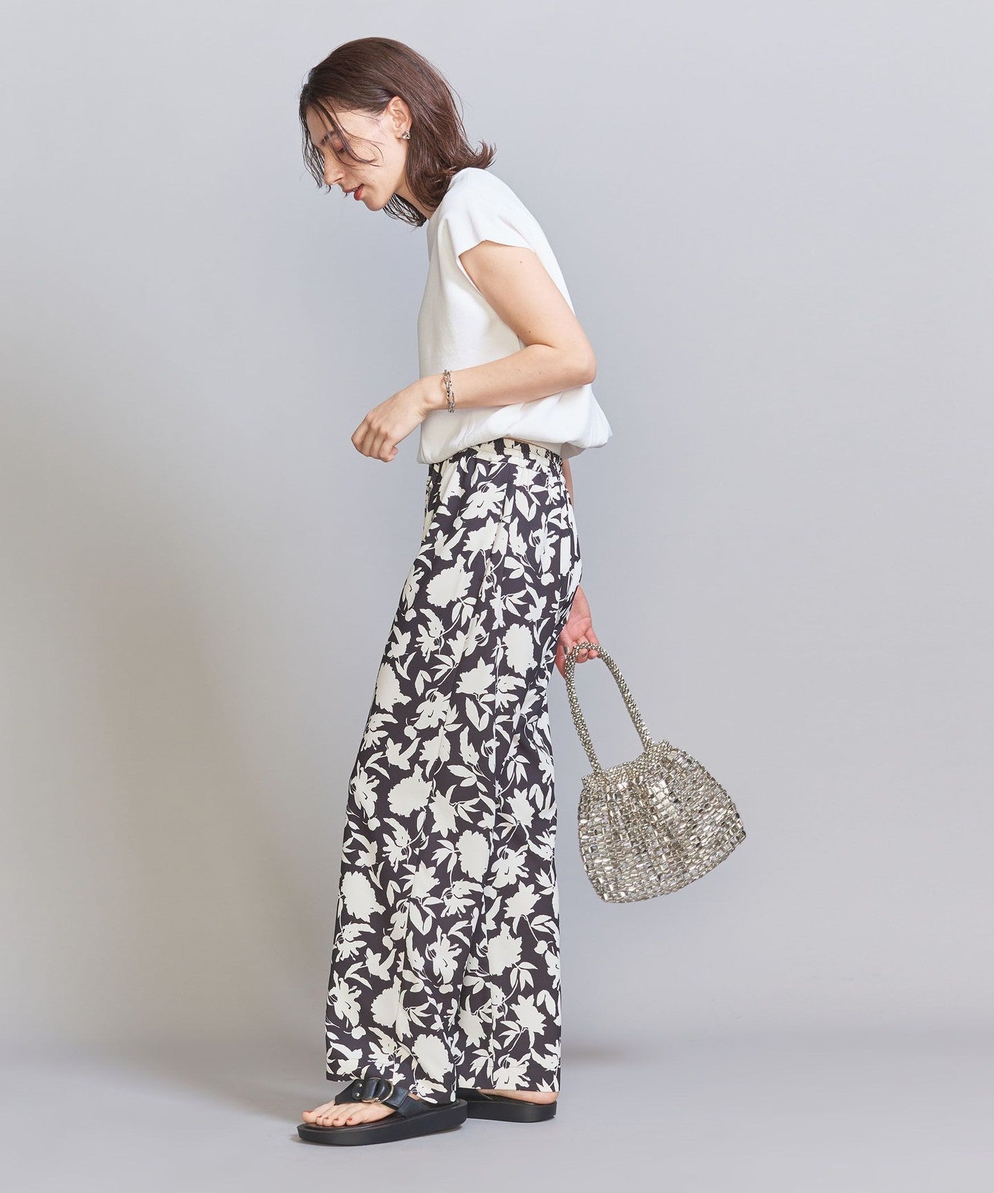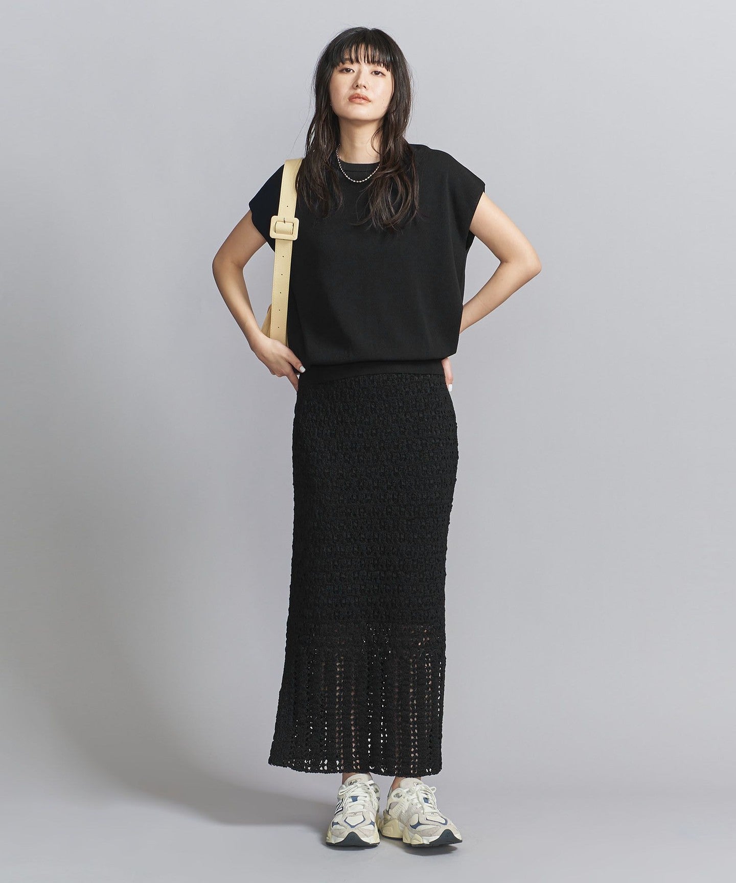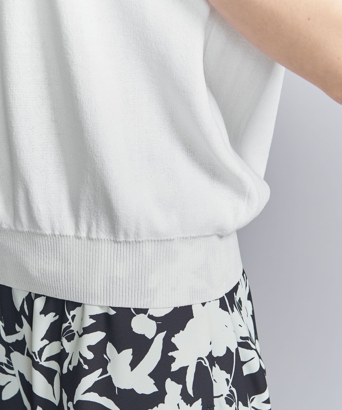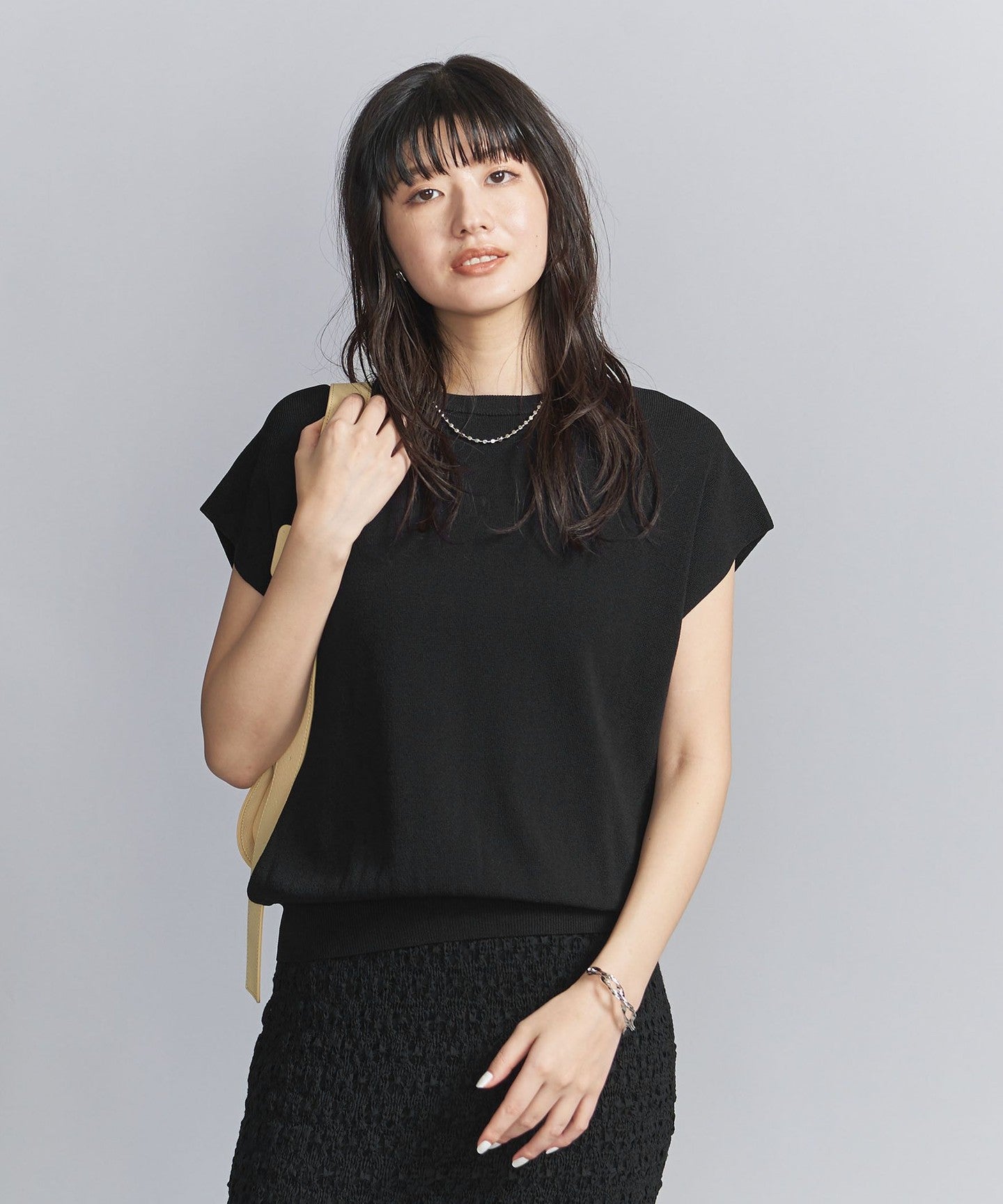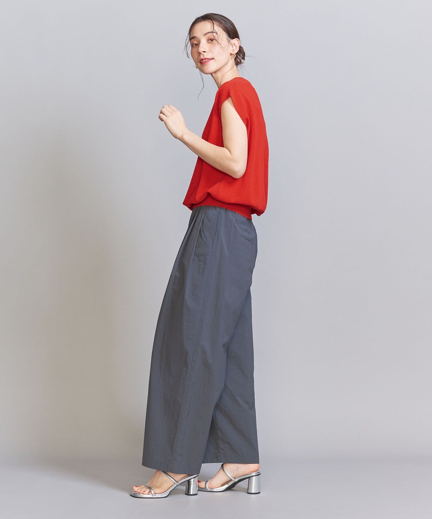 It goes well with a wide range of items, from voluminous pants to patterned bottoms and neat I-line skirts.
