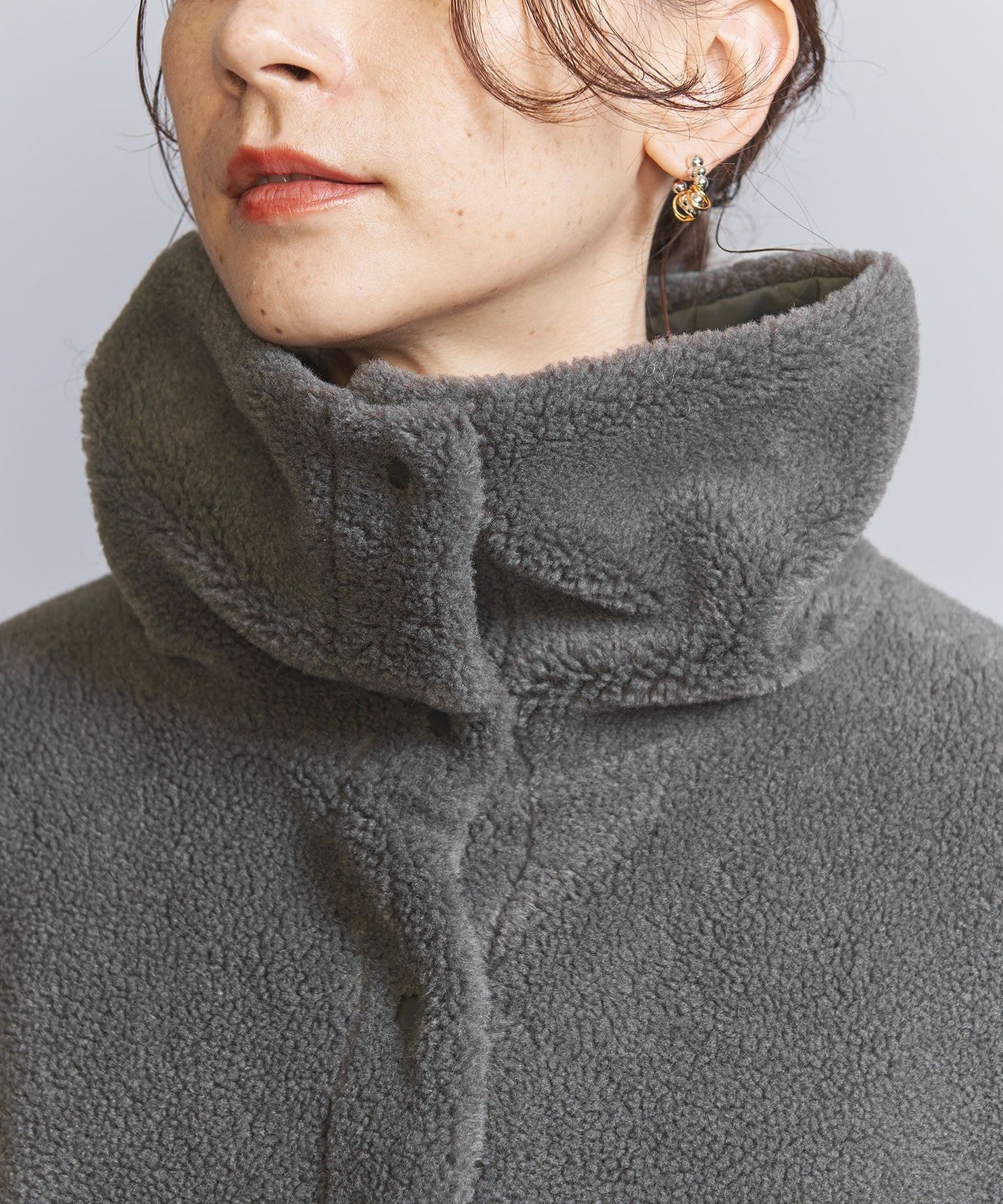 This popular outerwear with eye-catching contrasting boa now comes in a stand-collar design.
