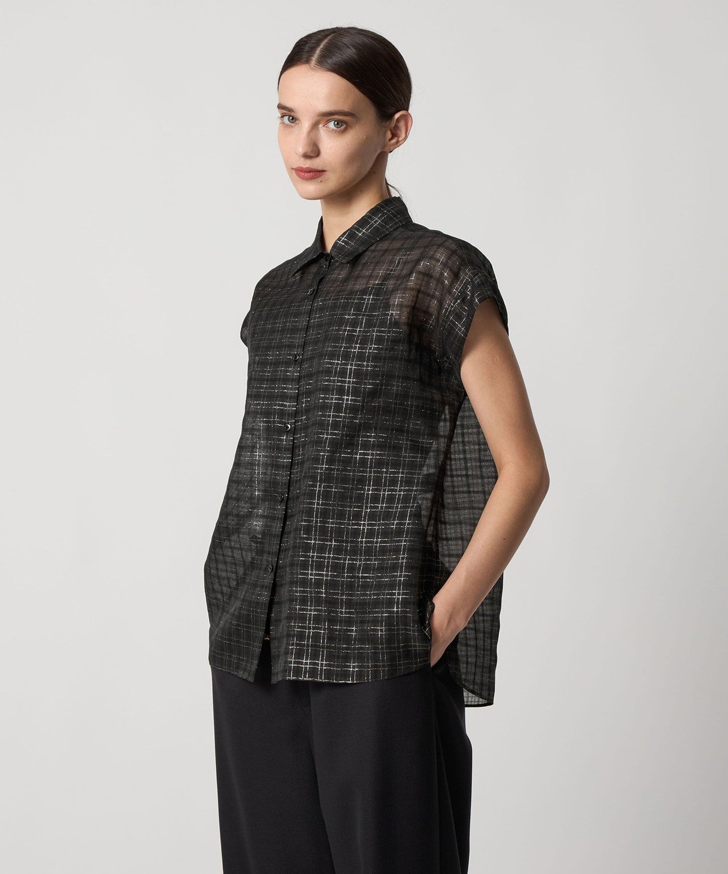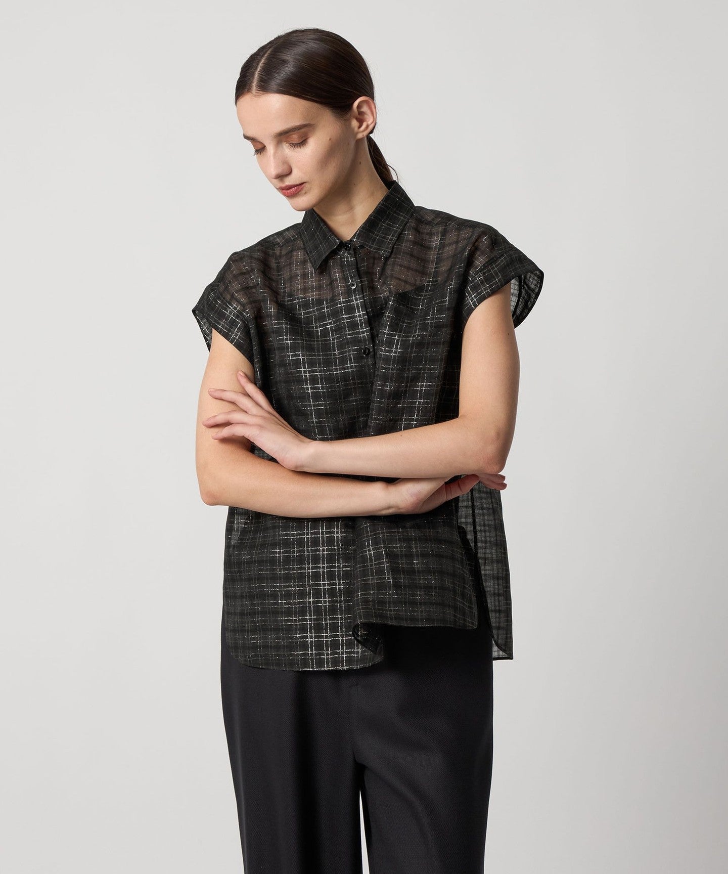 DRAWERPRE Glitter Check French Sleeve Blouse
