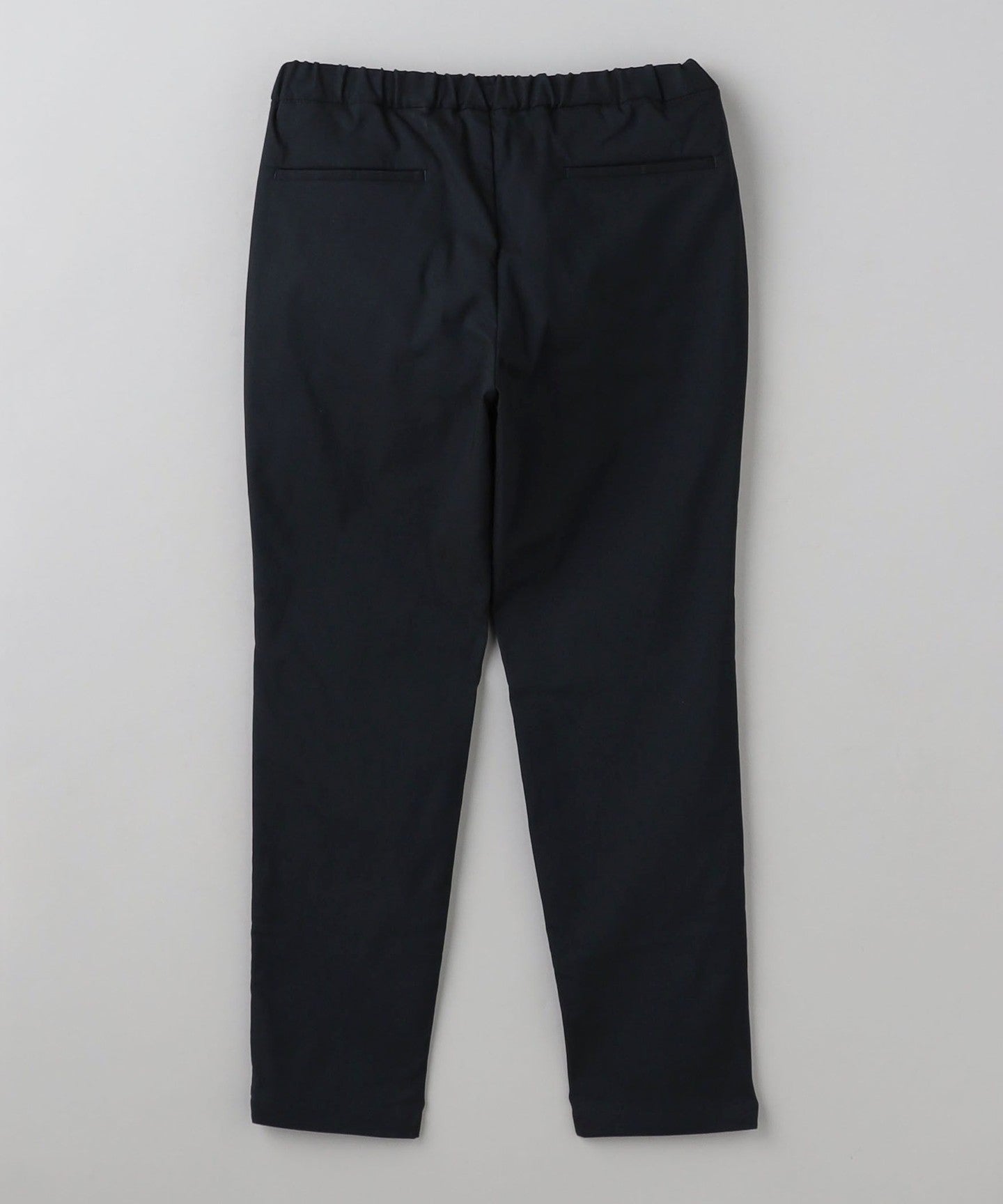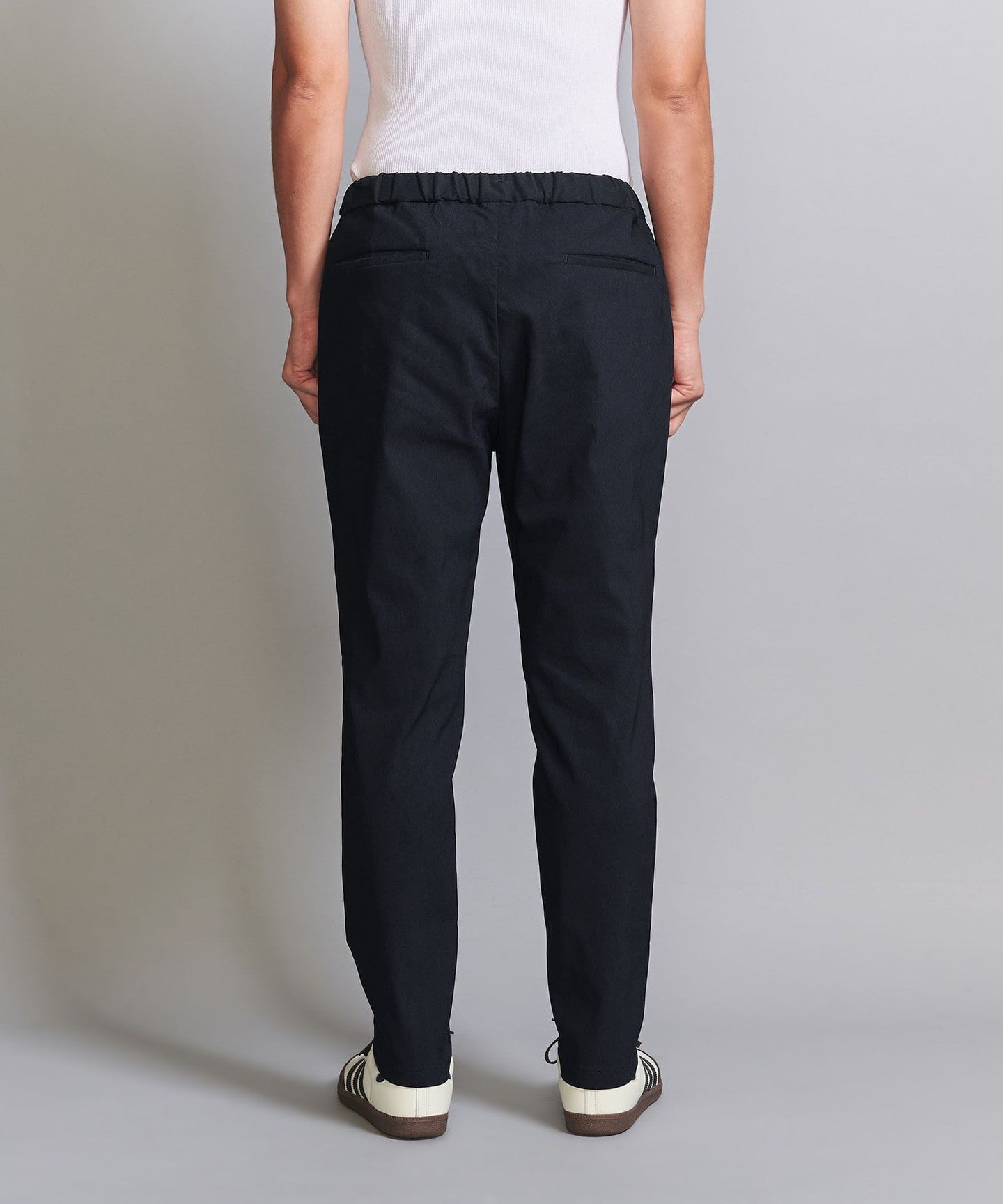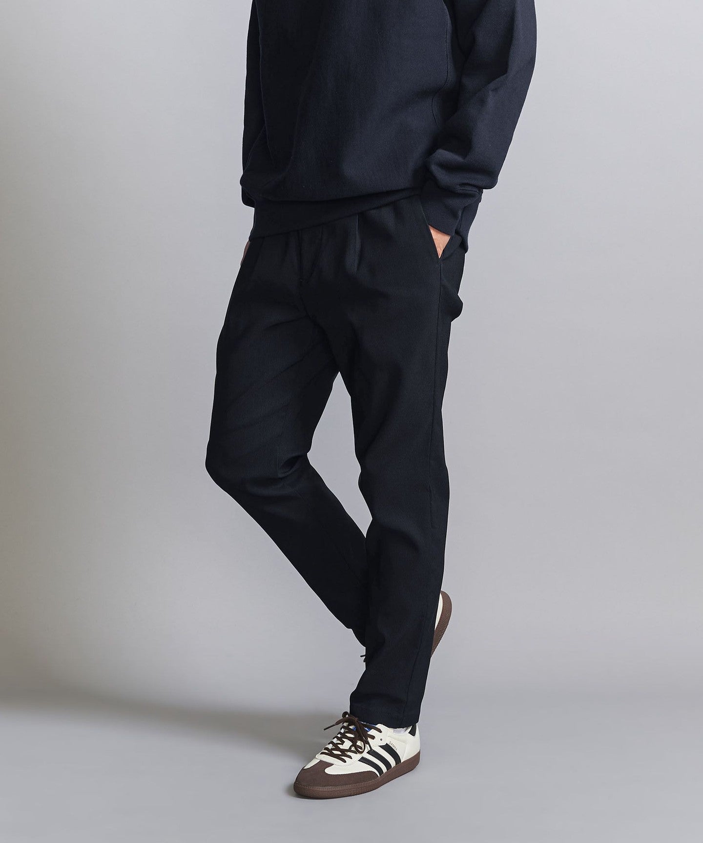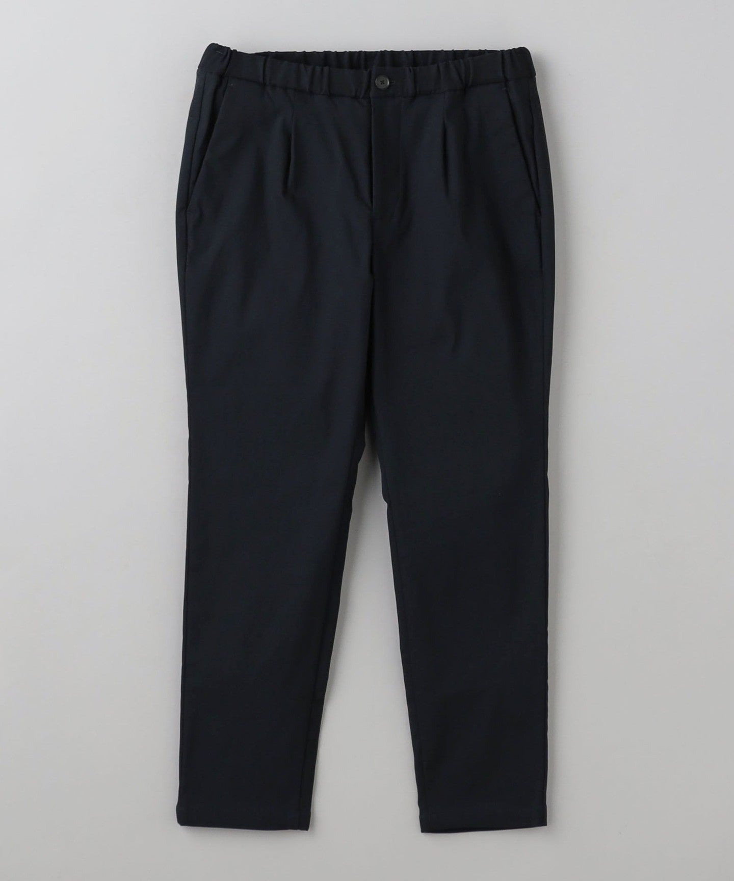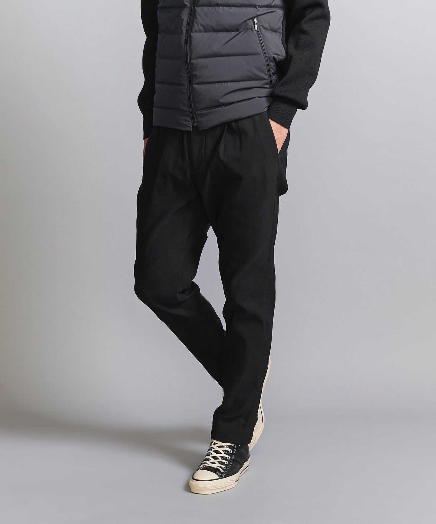 By adding tucks to create room around the waist, thighs, and hips, and tapering towards the hem, the silhouette is elegant and clean-looking.