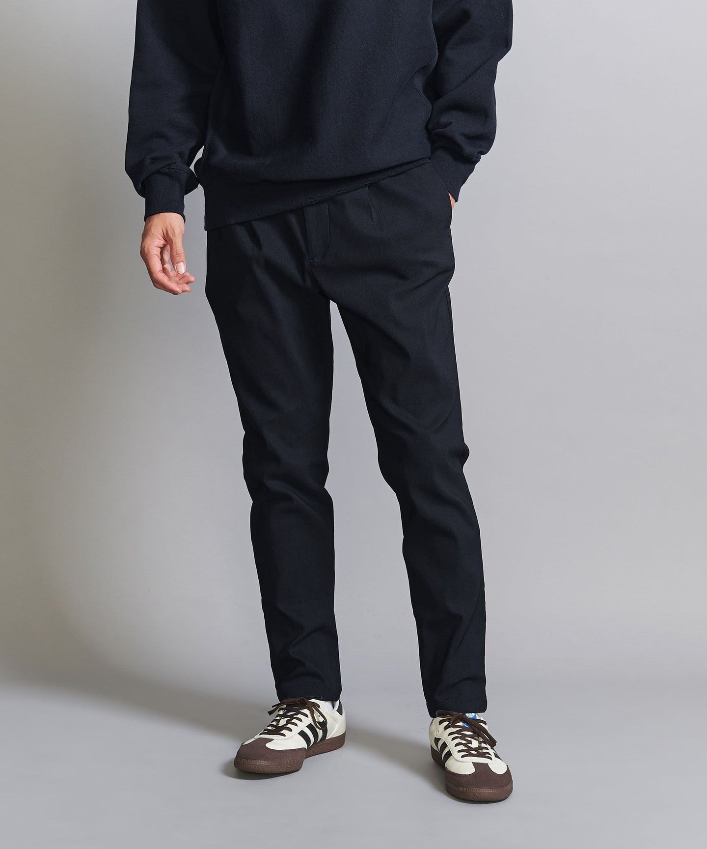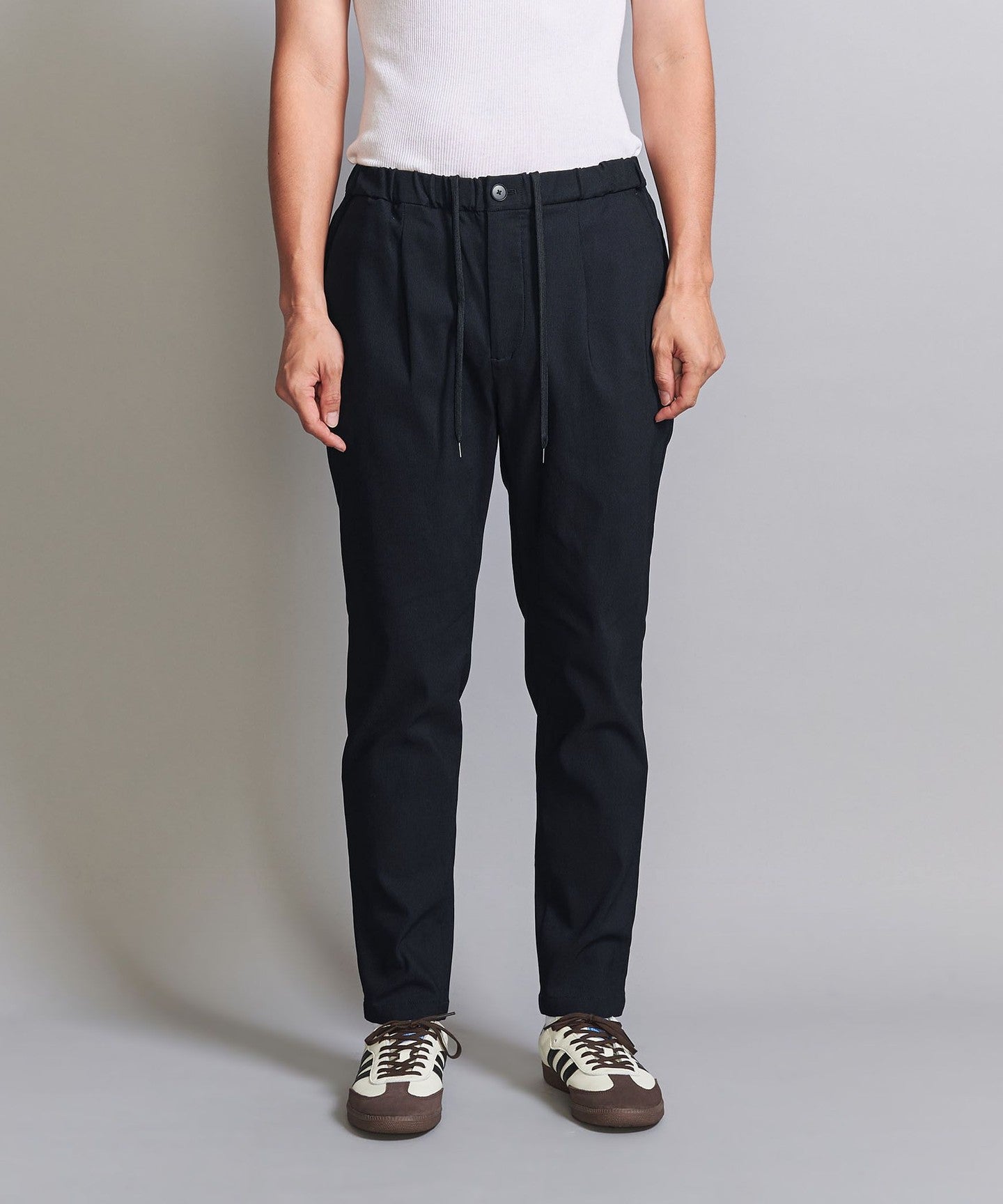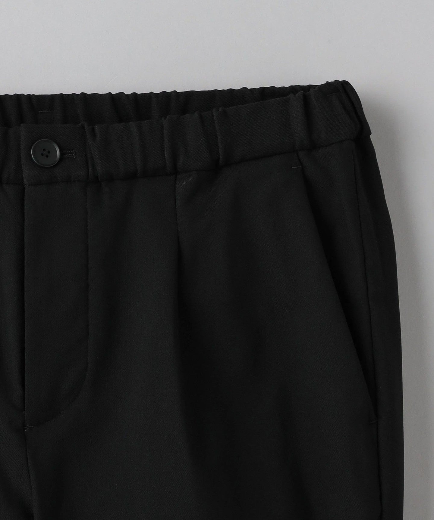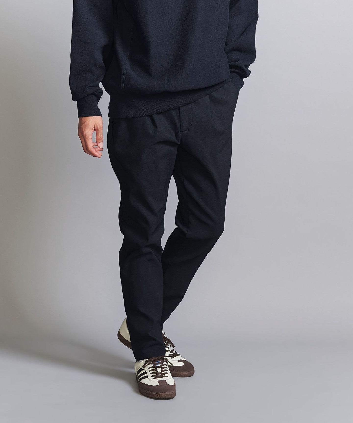 By adding tucks to create room around the waist, thighs, and hips, and tapering towards the hem, the silhouette is elegant and clean-looking.