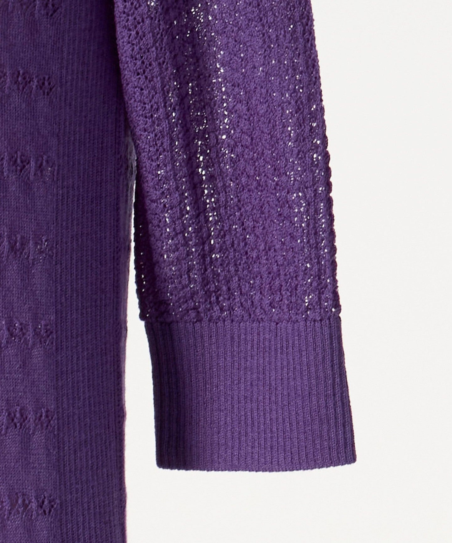 A sheer lace-patterned knit material made from crisp, tightly twisted wool yarn.