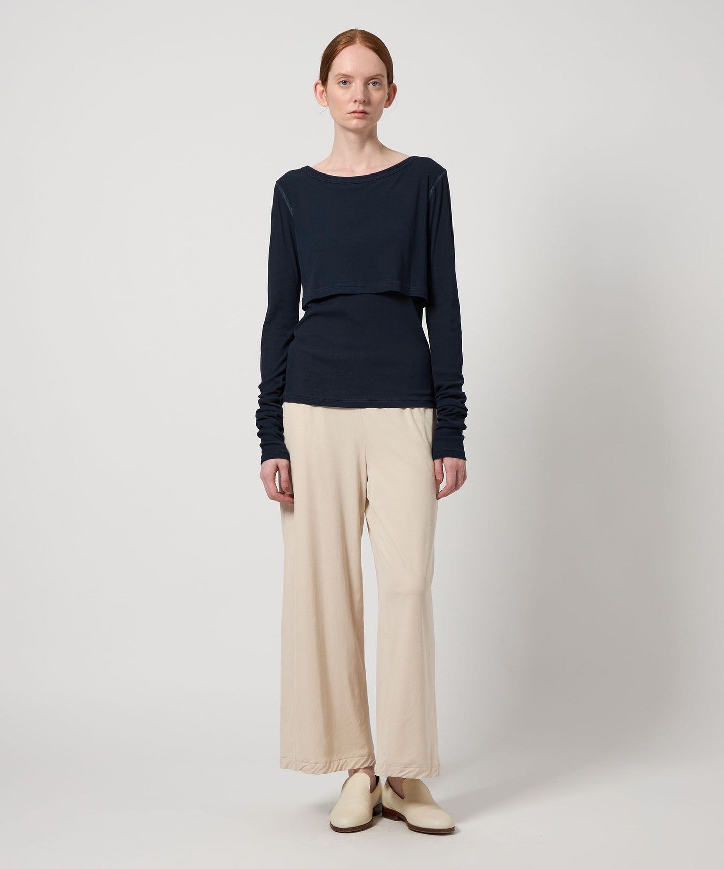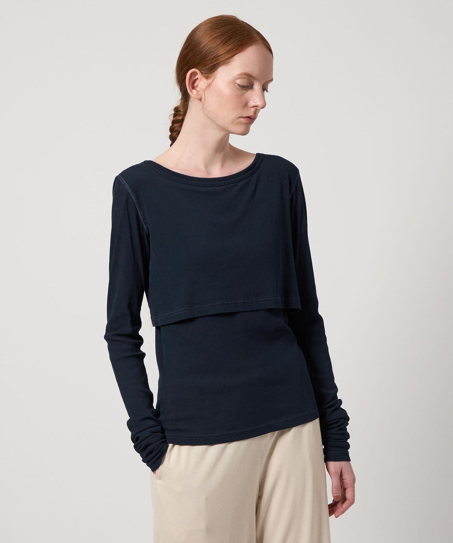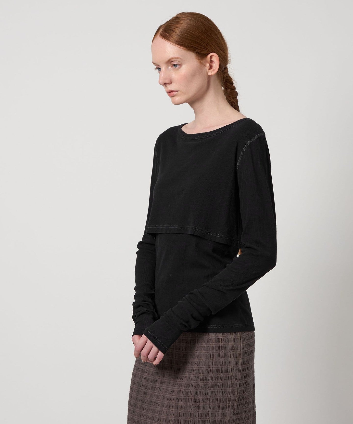 A long-sleeved cut-and-sew featuring a relaxed layered design.