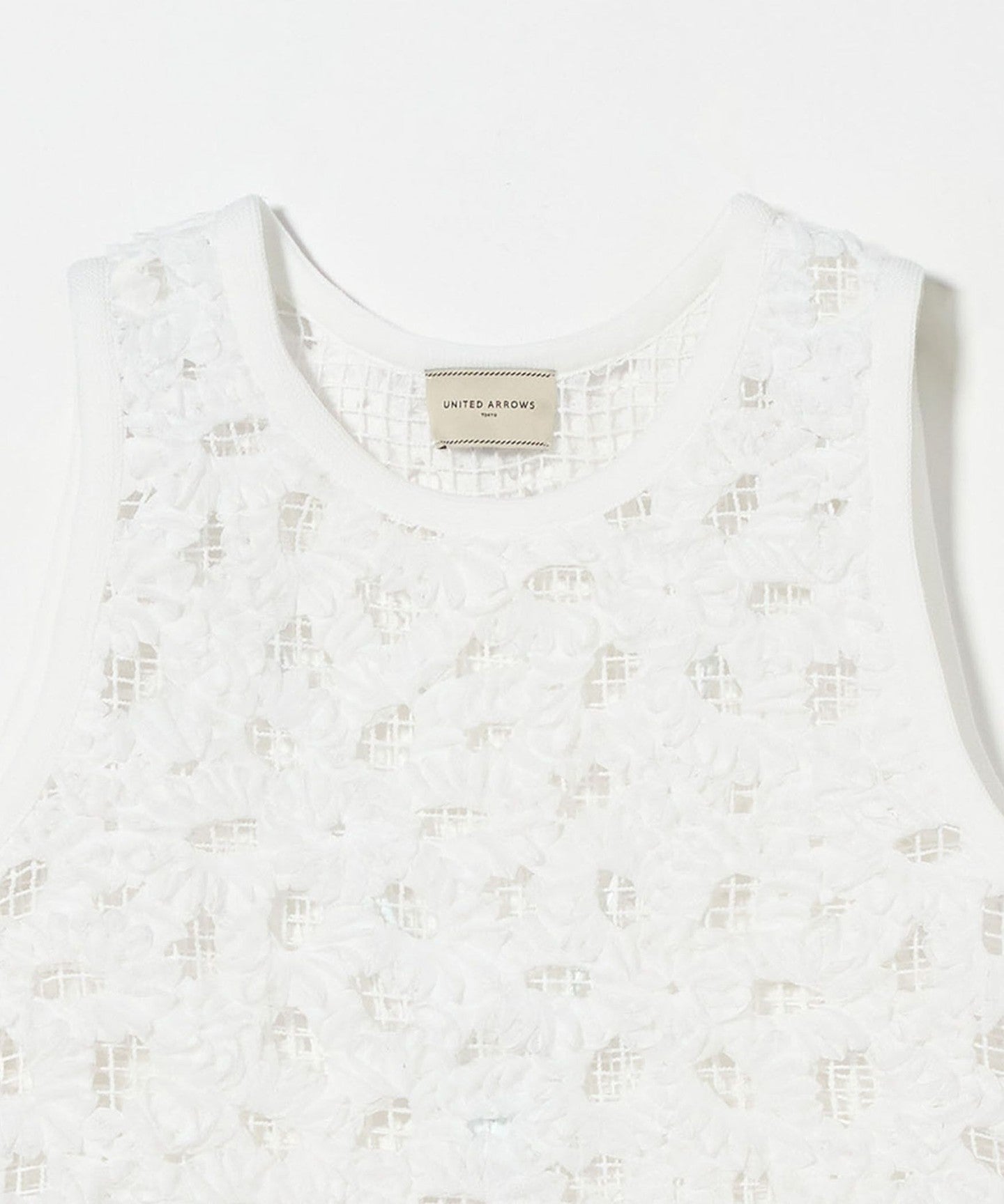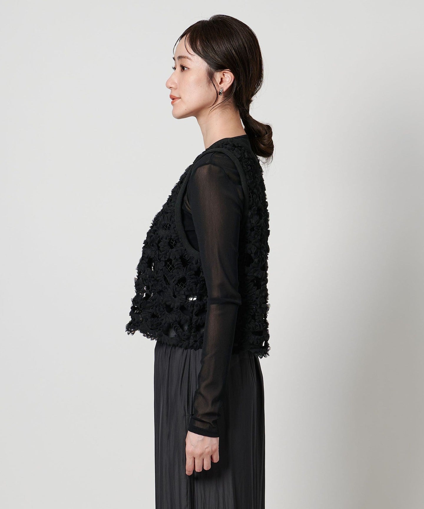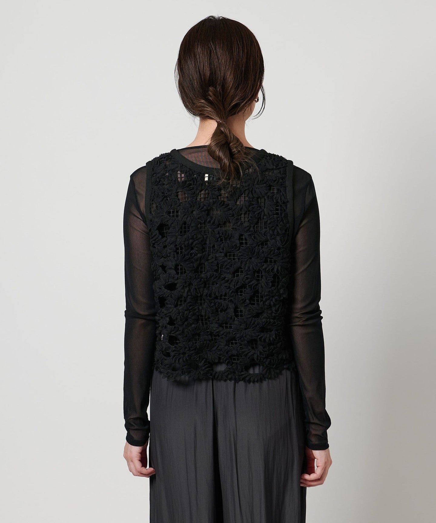This vest features a three-dimensional motif made from layered tulle embroidery and mesh.