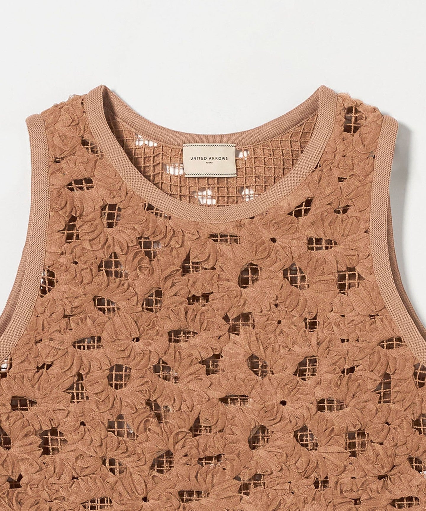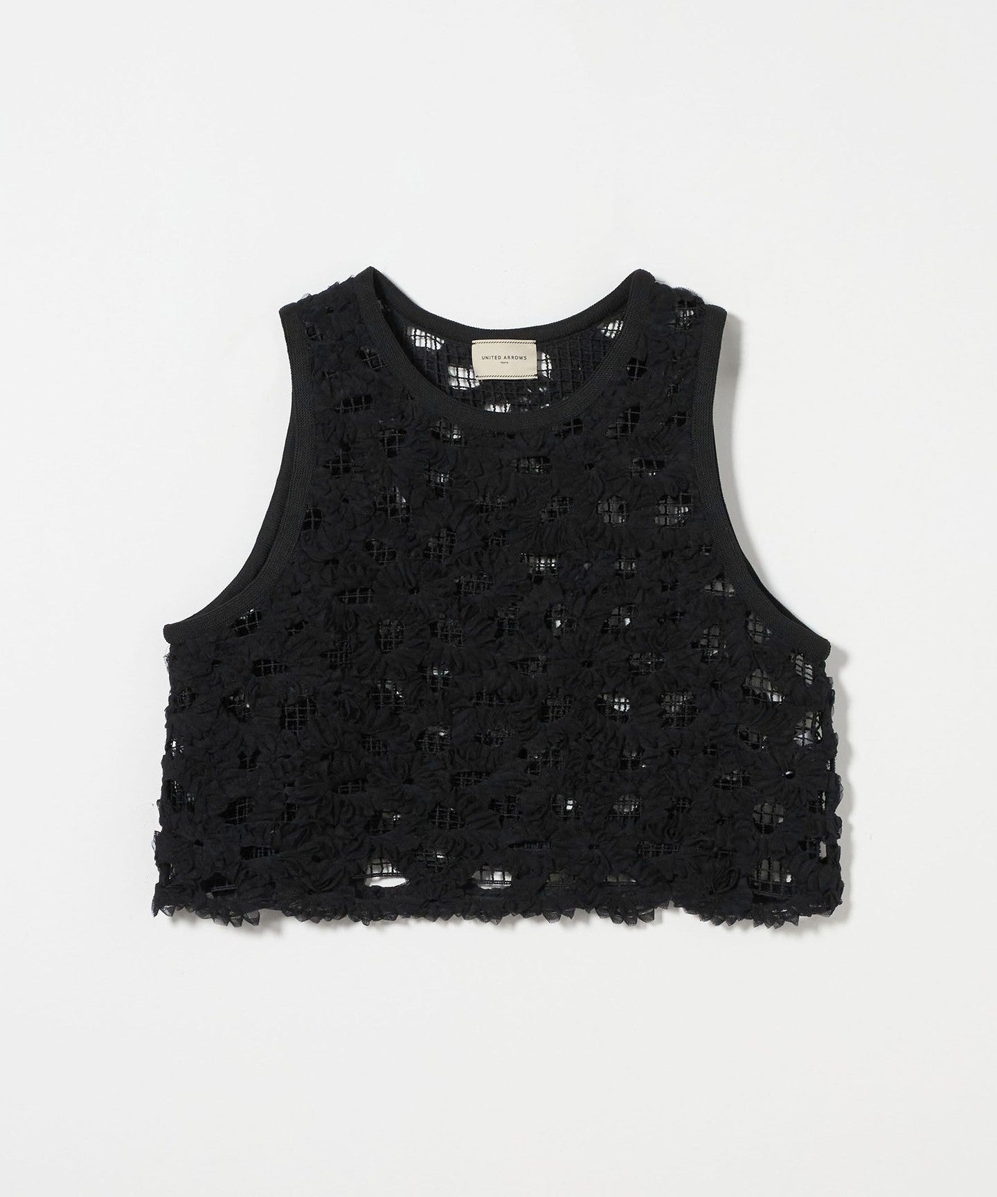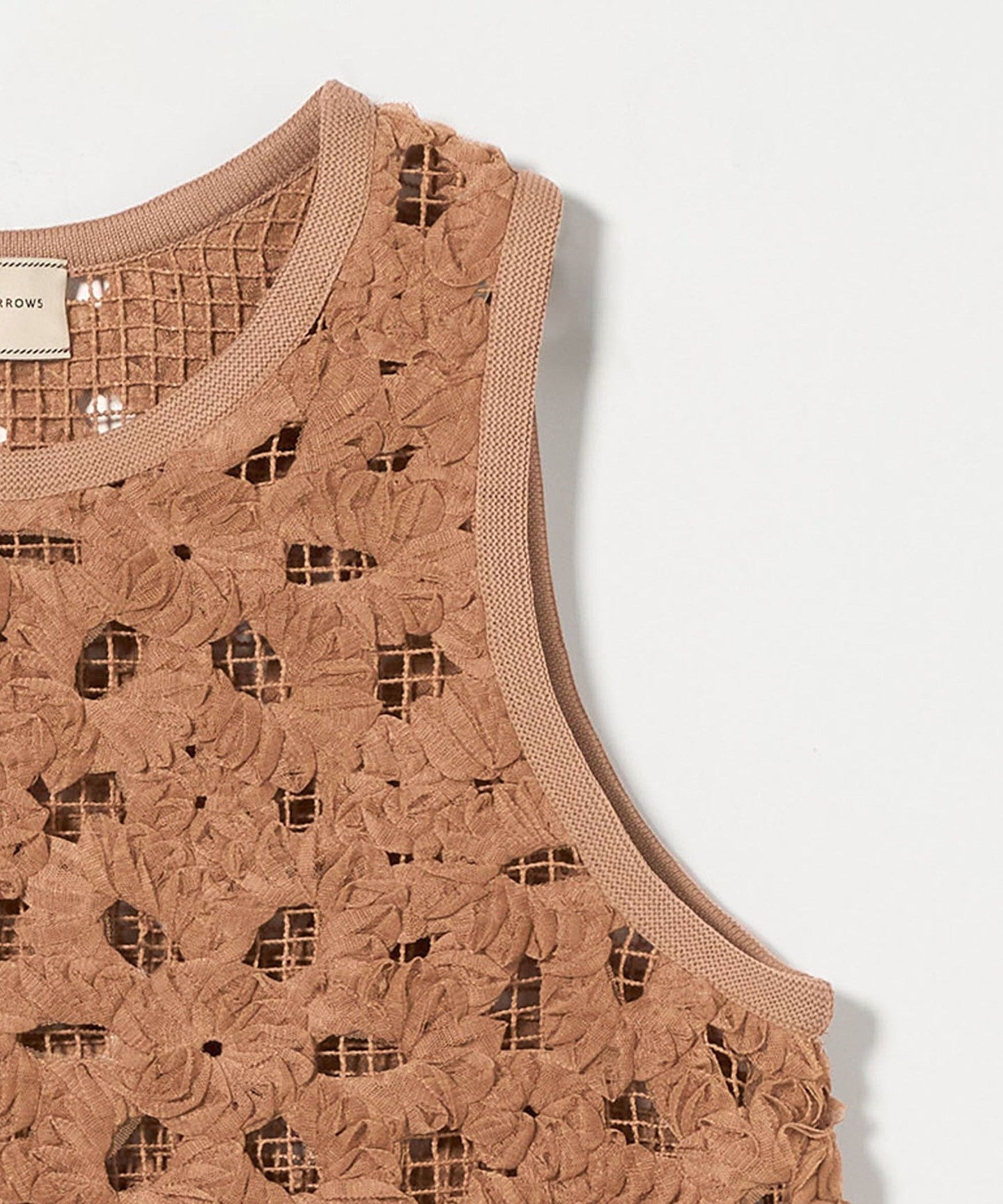 This vest features a three-dimensional motif made from layered tulle embroidery and mesh.