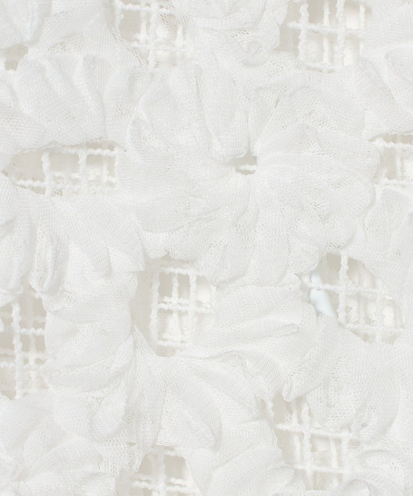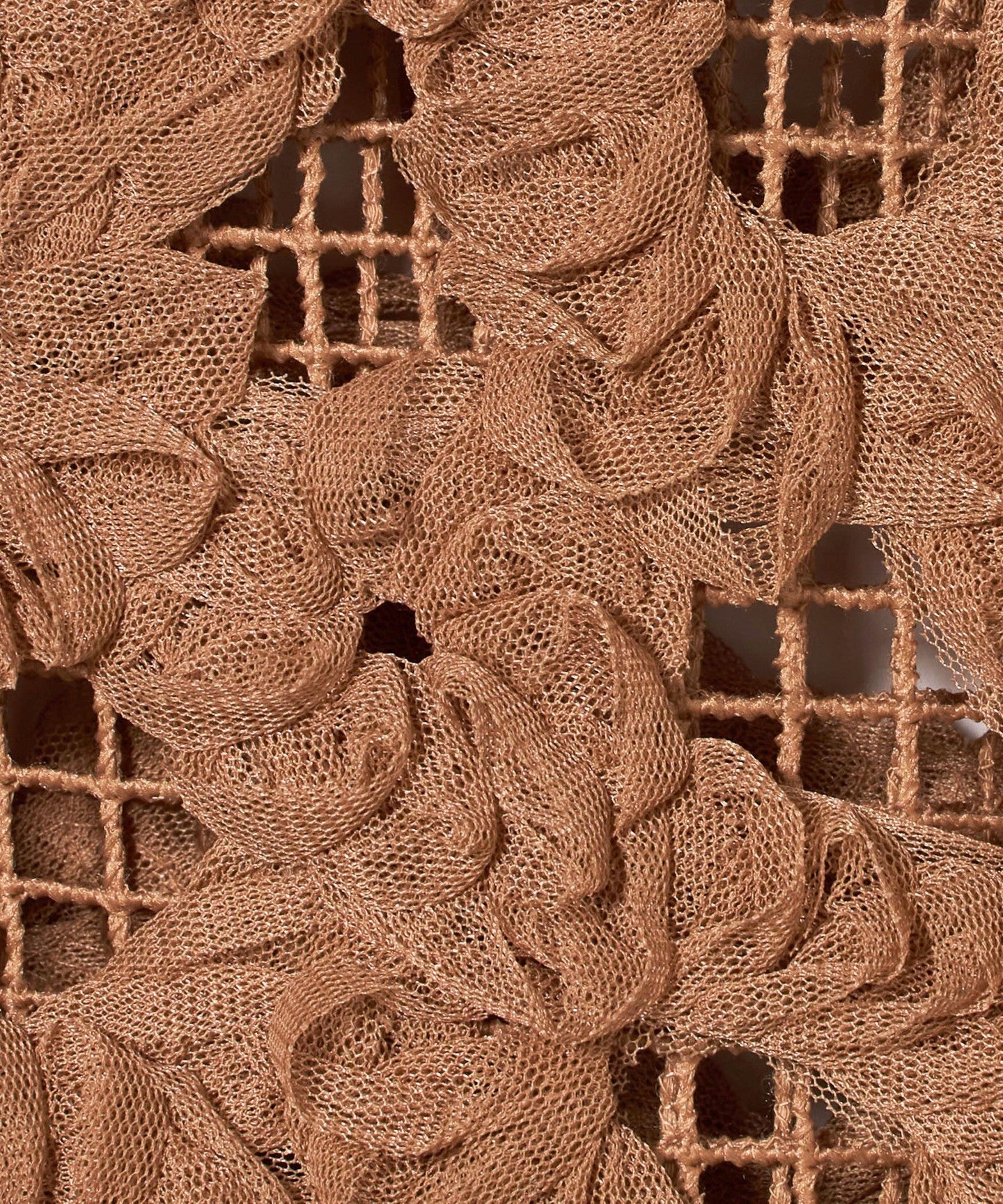 A three-dimensional material made by layering original tulle tape embroidered parts on top of polyester square mesh.