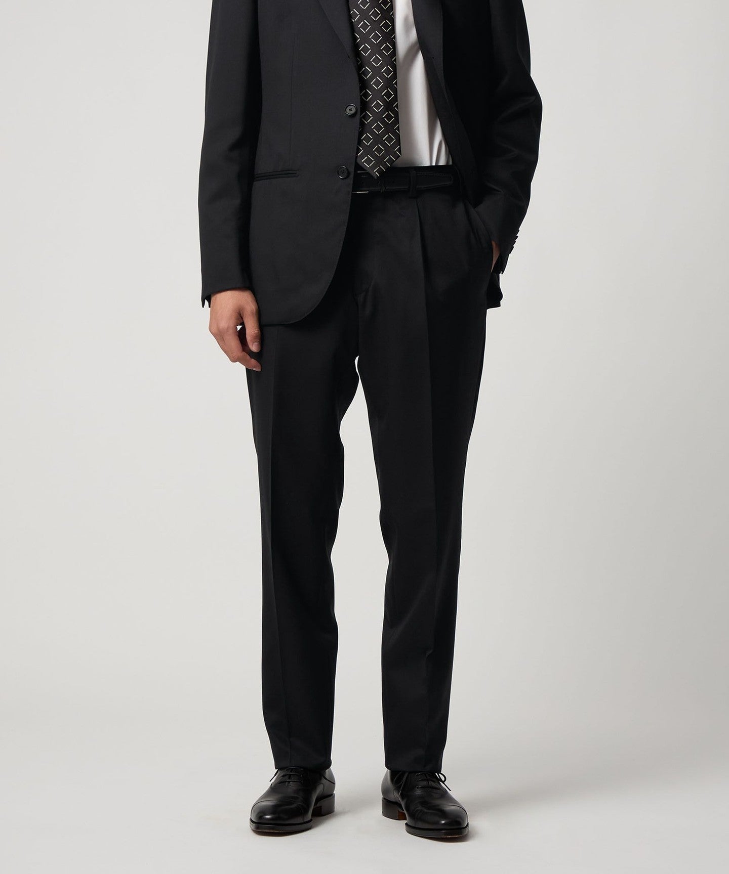 The pants have deep pleats and ample room around the waist, creating a tapered silhouette that balances well with the jacket.
