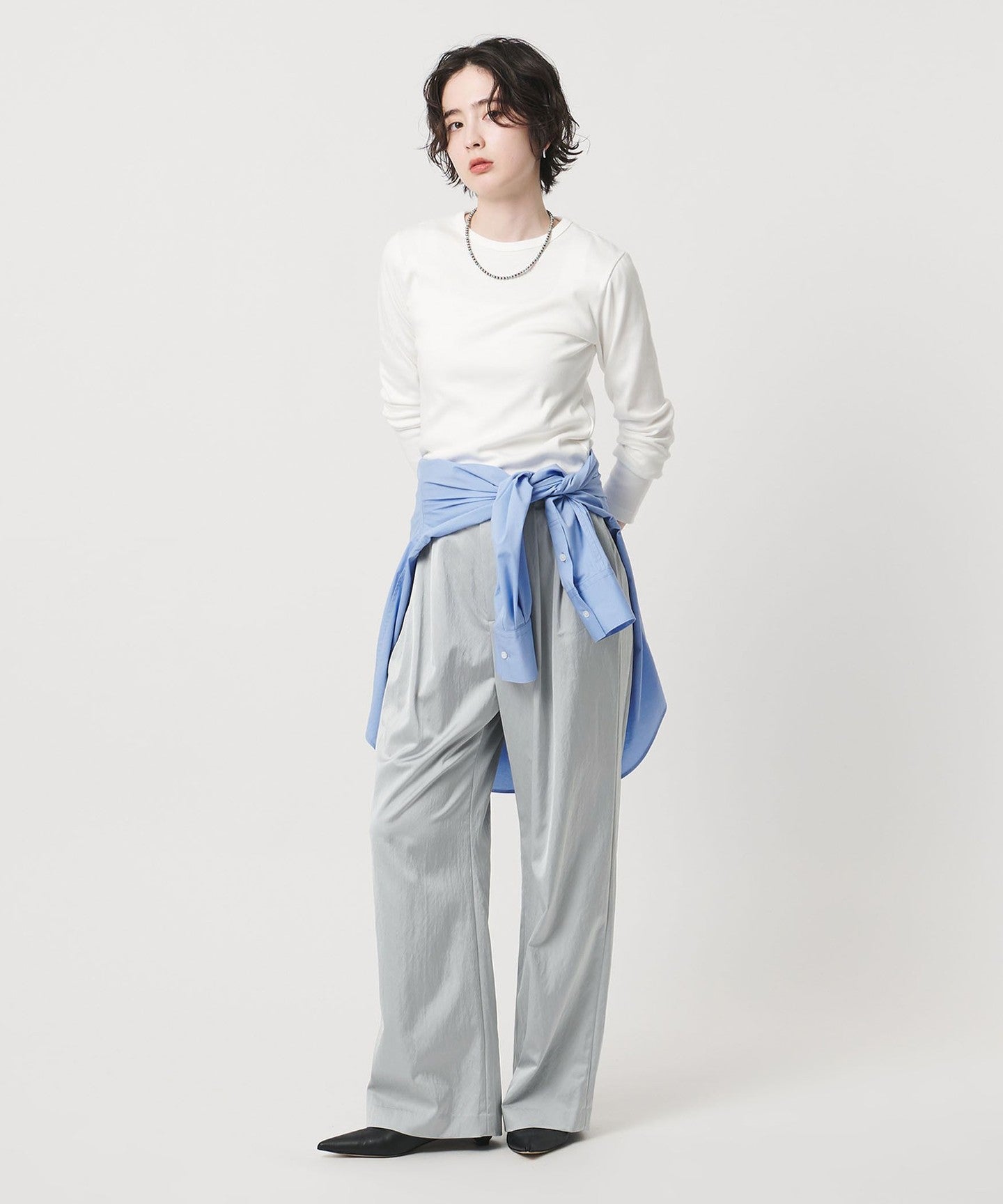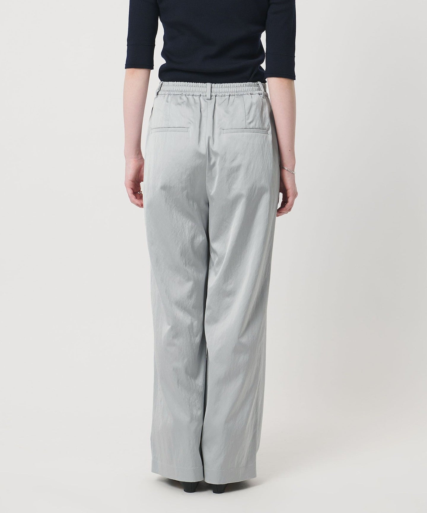 立体感のあるサテン素材が、着こなしに奥行きをプラス