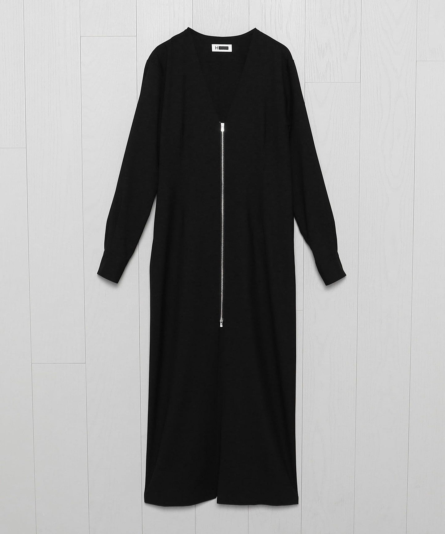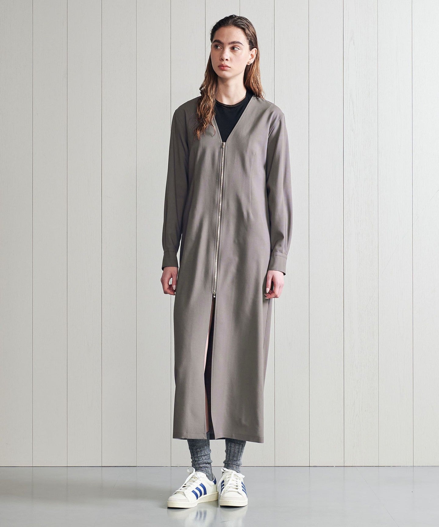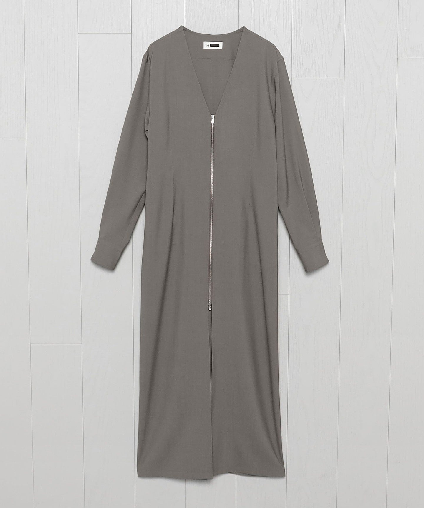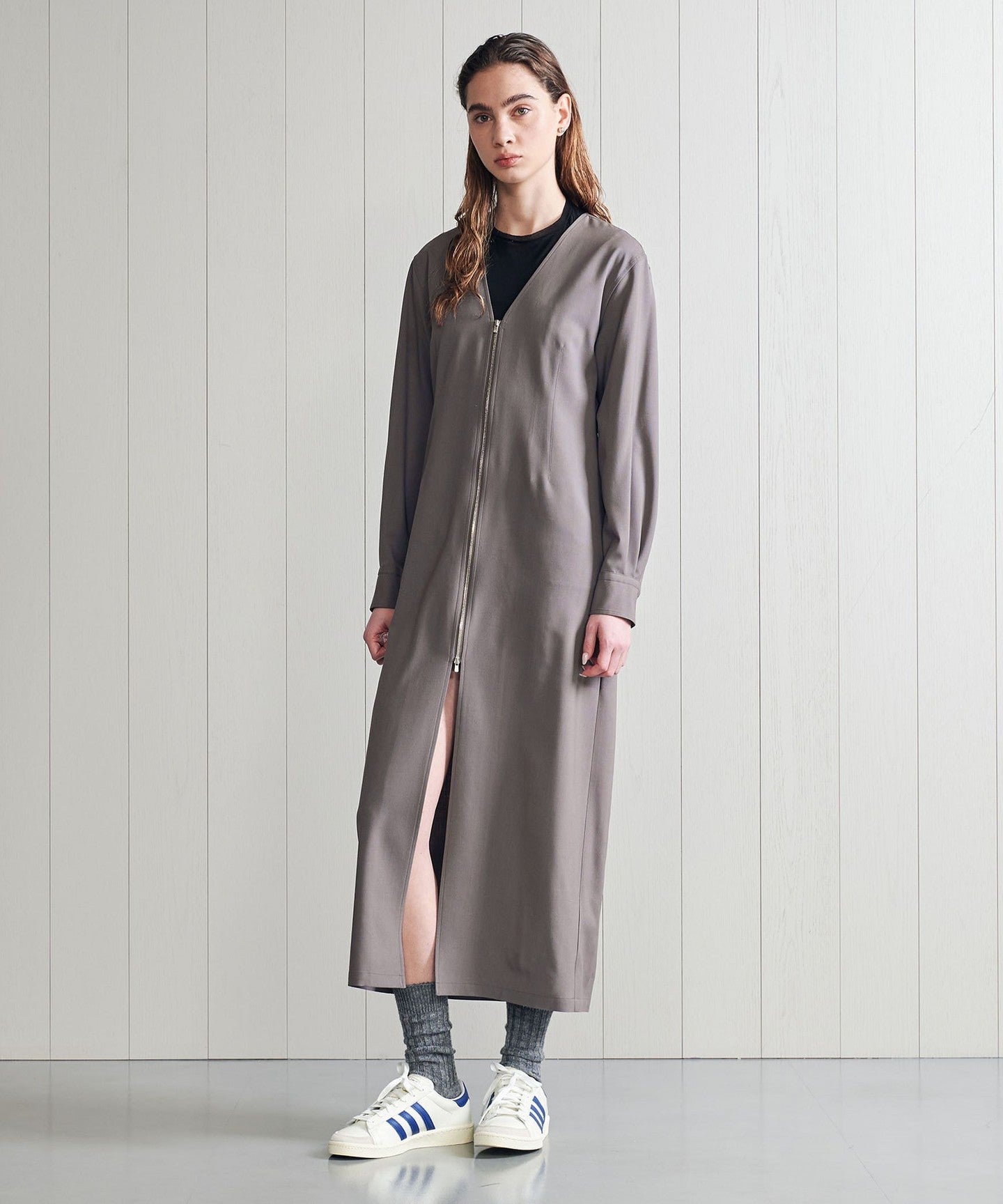 This maxi-length dress is crafted from a supple, draped tropical fabric. The sharp front zipper adds an edgy accent to the elegant fabric. The functional double zipper allows for versatile styling, while the design can also be worn open and worn as a jacket. It pairs well with a turtleneck underneath, or with jeans and leggings. The clean V-neck and deep slit add a relaxed touch to the sharp look, making it perfect for layering on its own or in a variety of other styles.