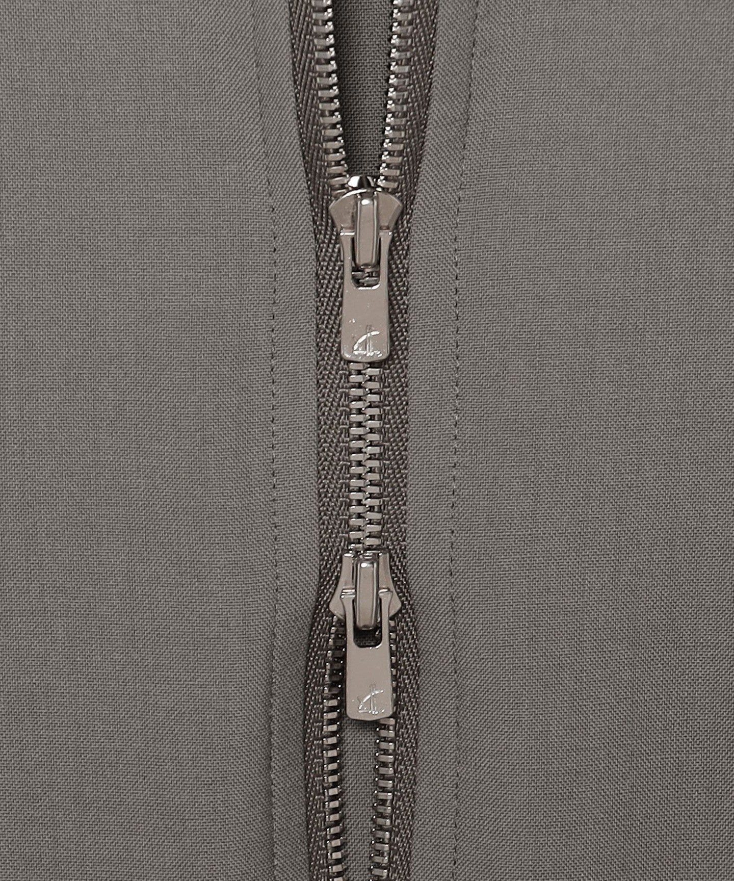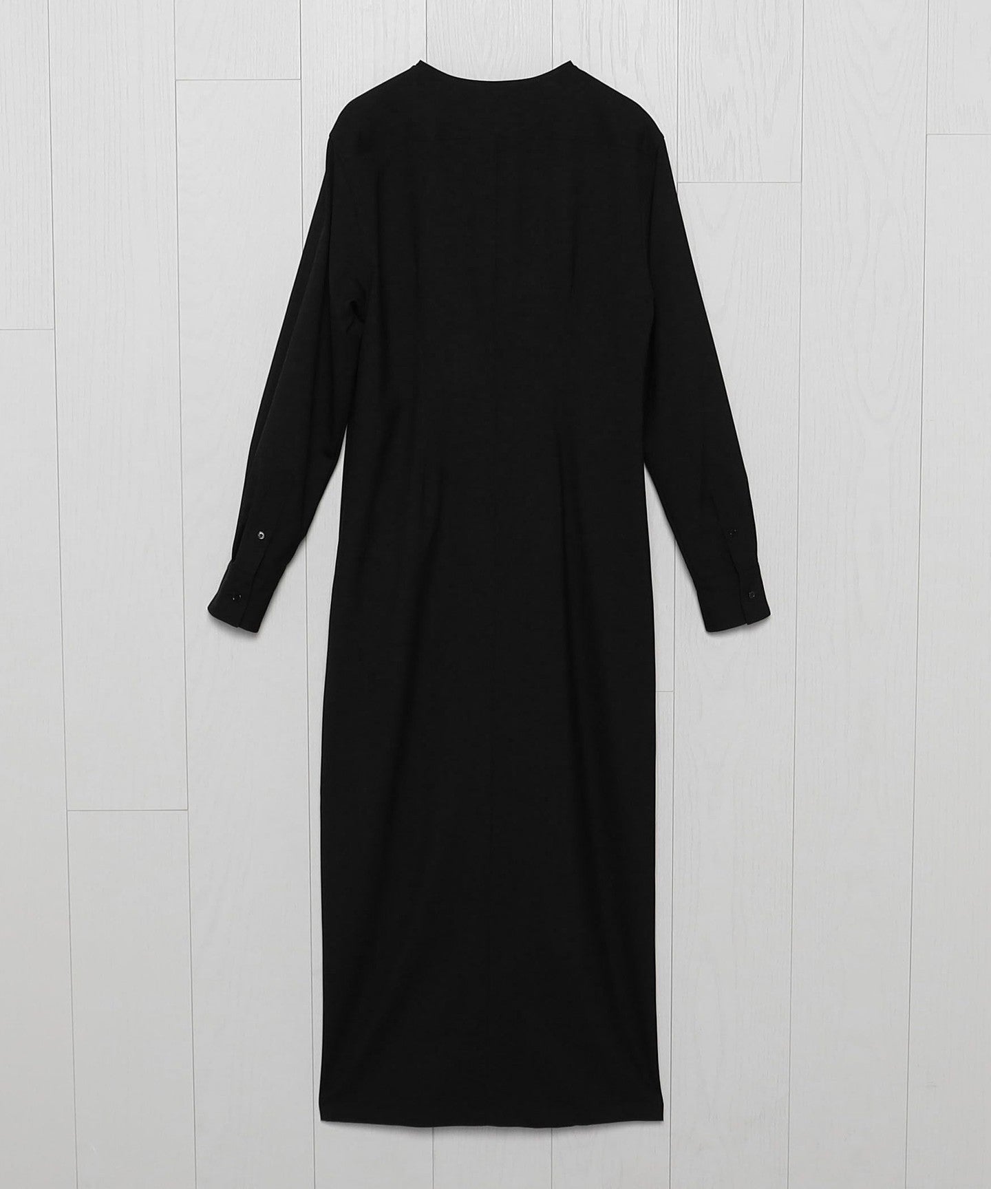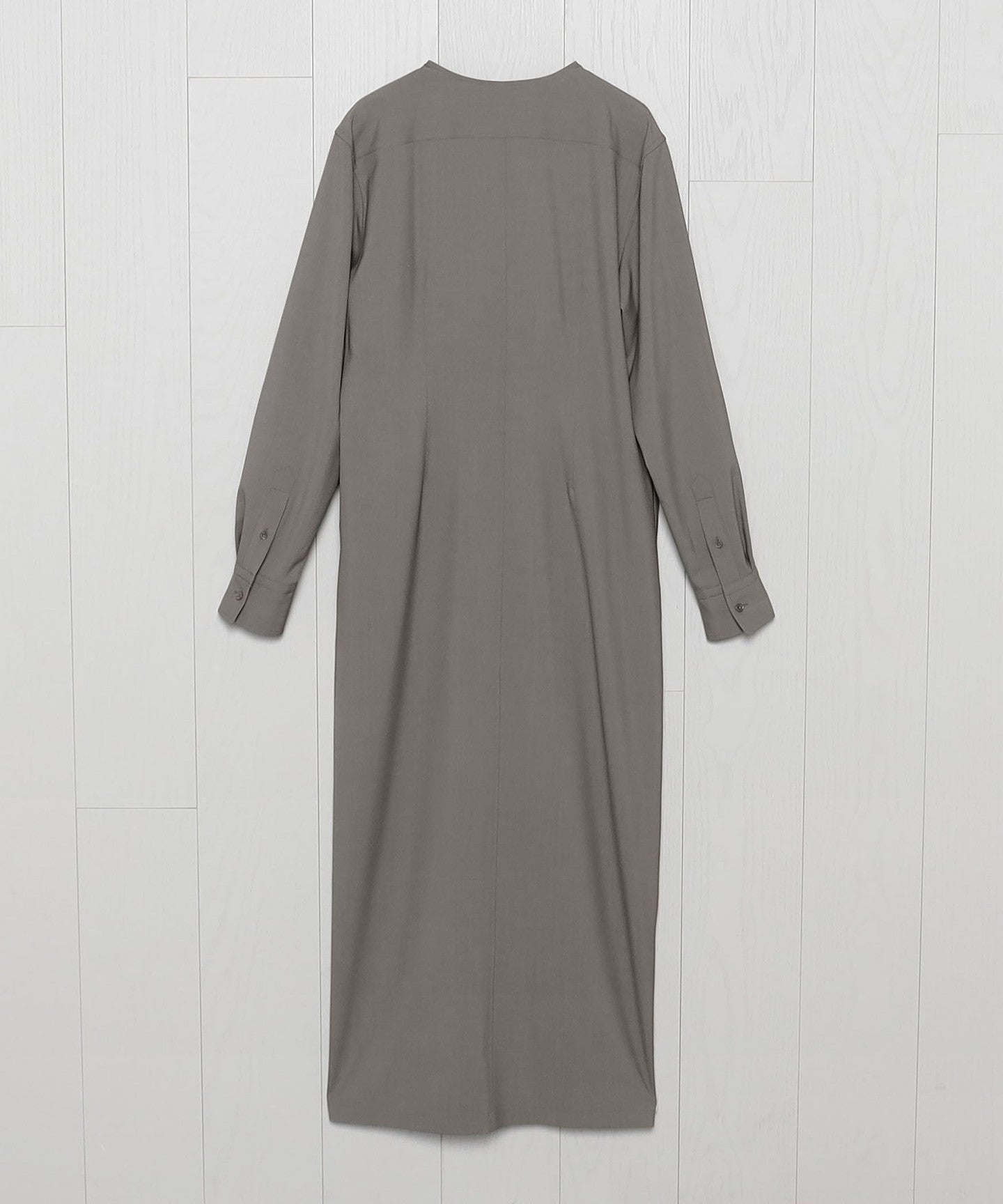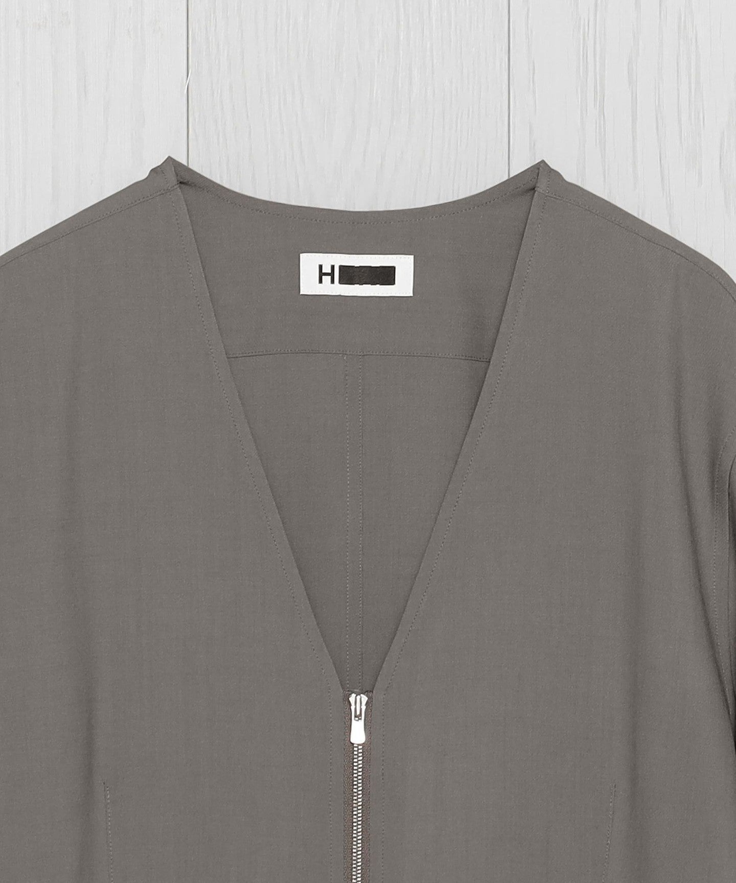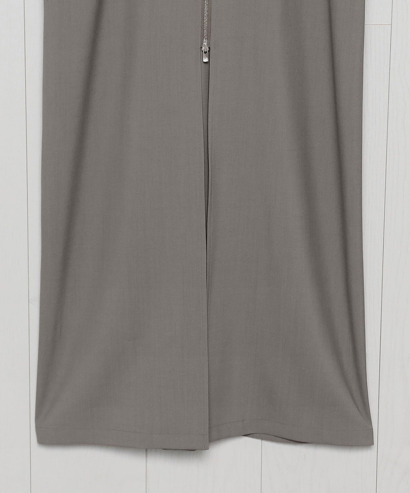 This maxi-length dress is crafted from a supple, draped tropical fabric. The sharp front zipper adds an edgy accent to the elegant fabric. The functional double zipper allows for versatile styling, while the design can also be worn open and worn as a jacket. It pairs well with a turtleneck underneath, or with jeans and leggings. The clean V-neck and deep slit add a relaxed touch to the sharp look, making it perfect for layering on its own or in a variety of other styles.