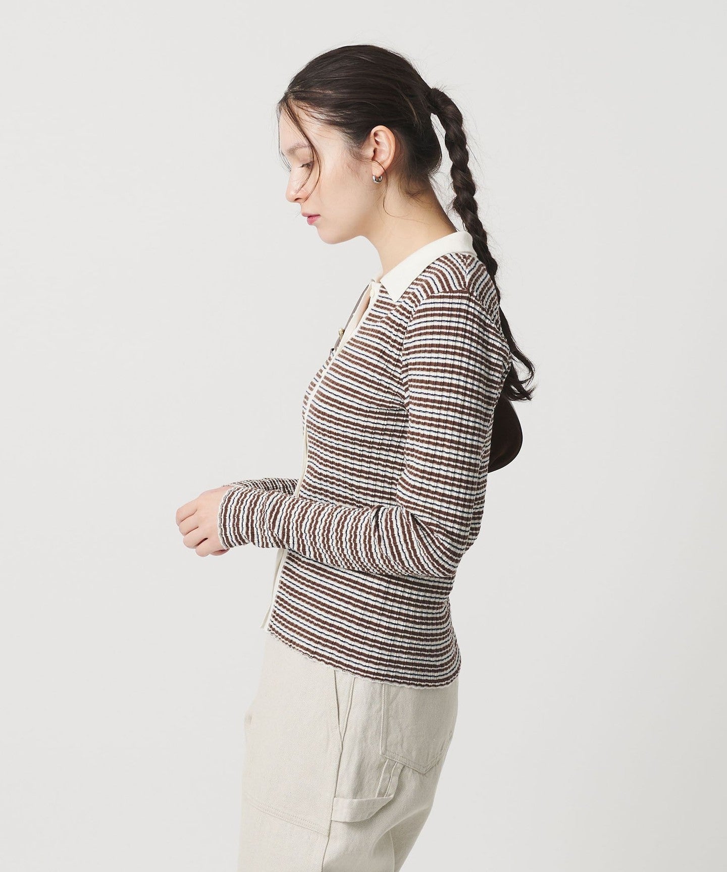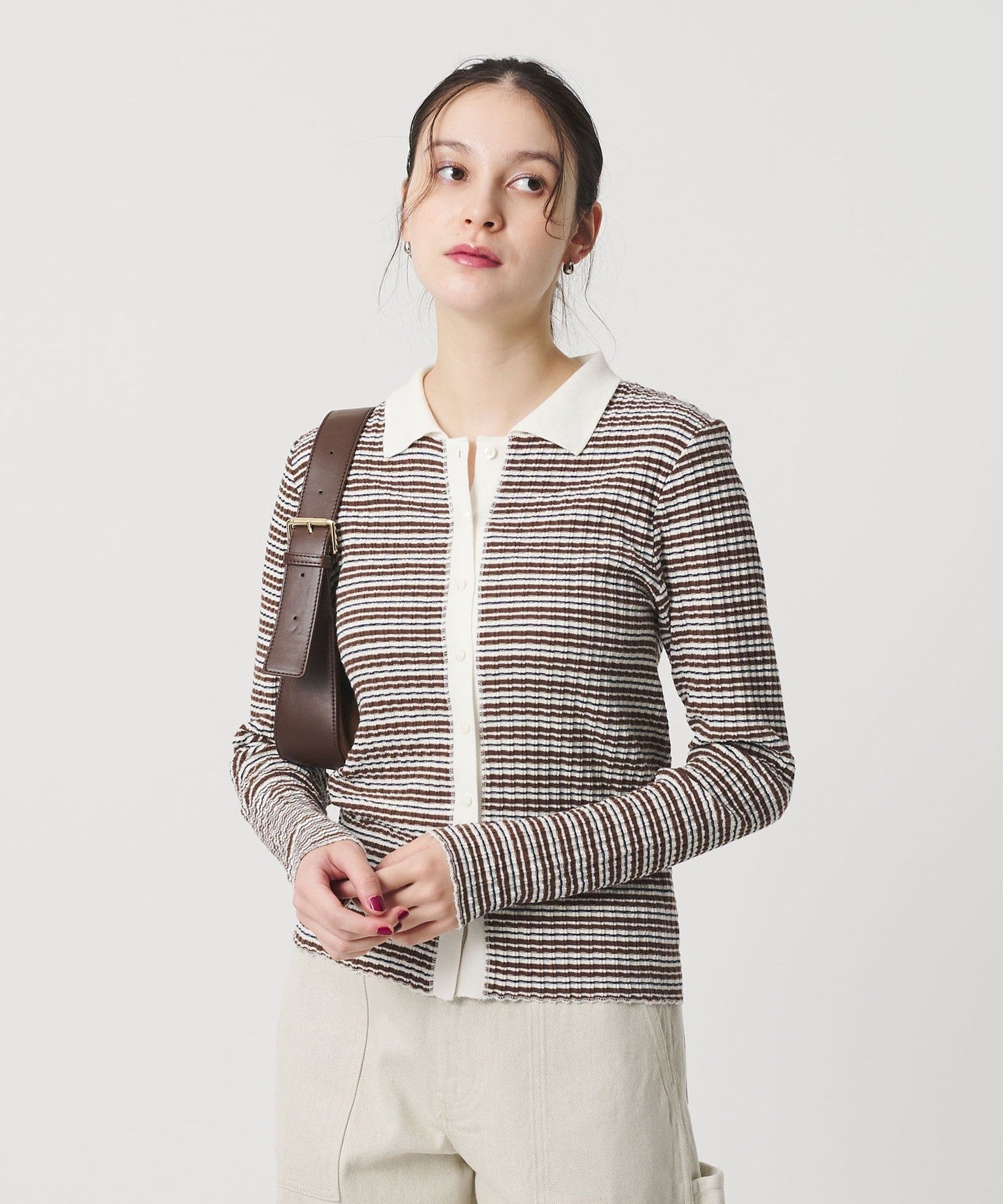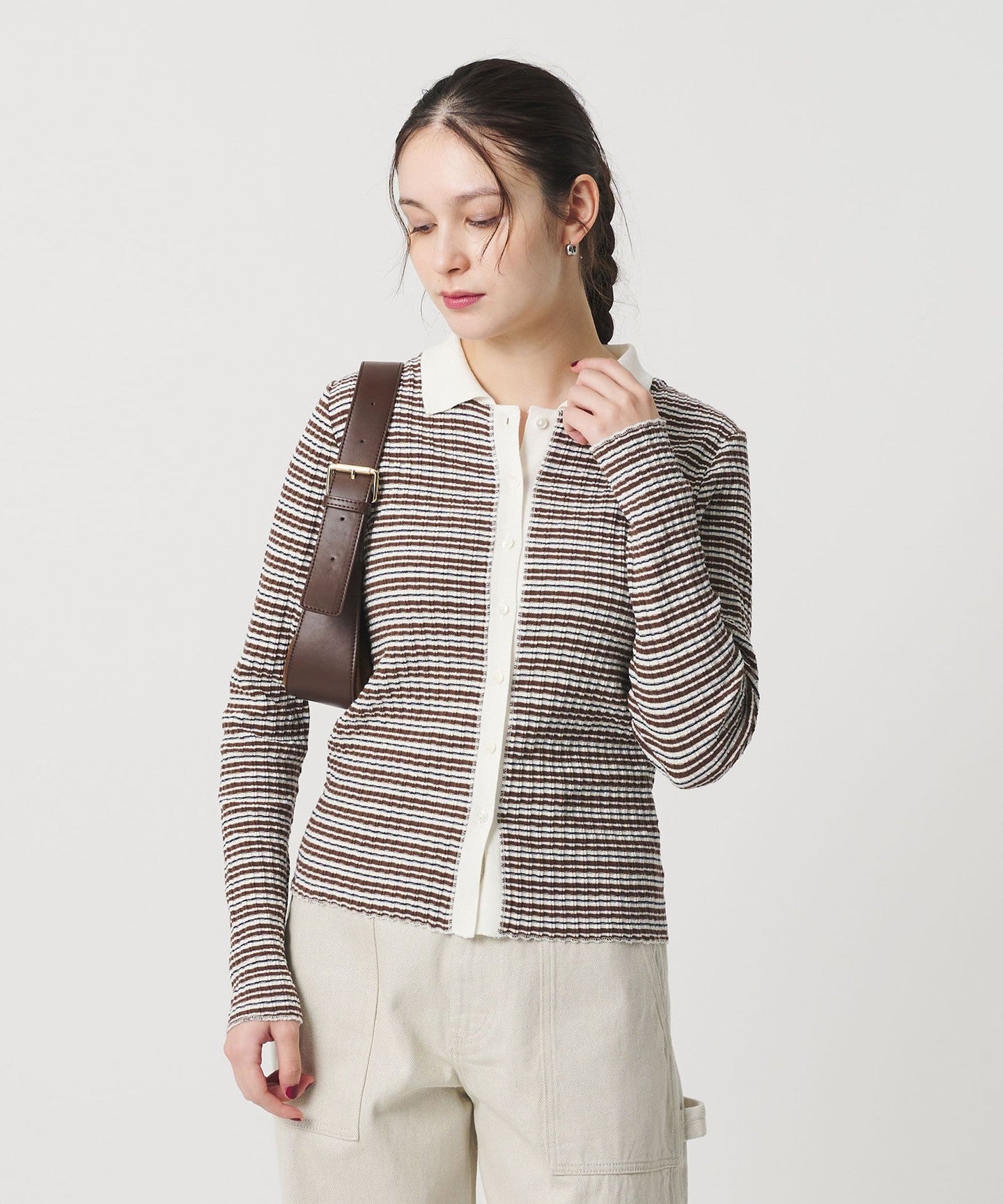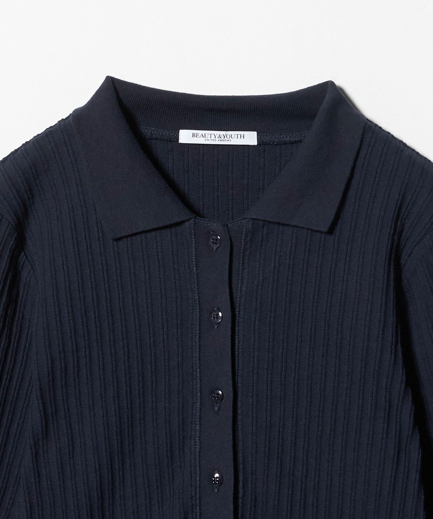 A collared cardigan featuring the uneven texture of deformed ribbing.