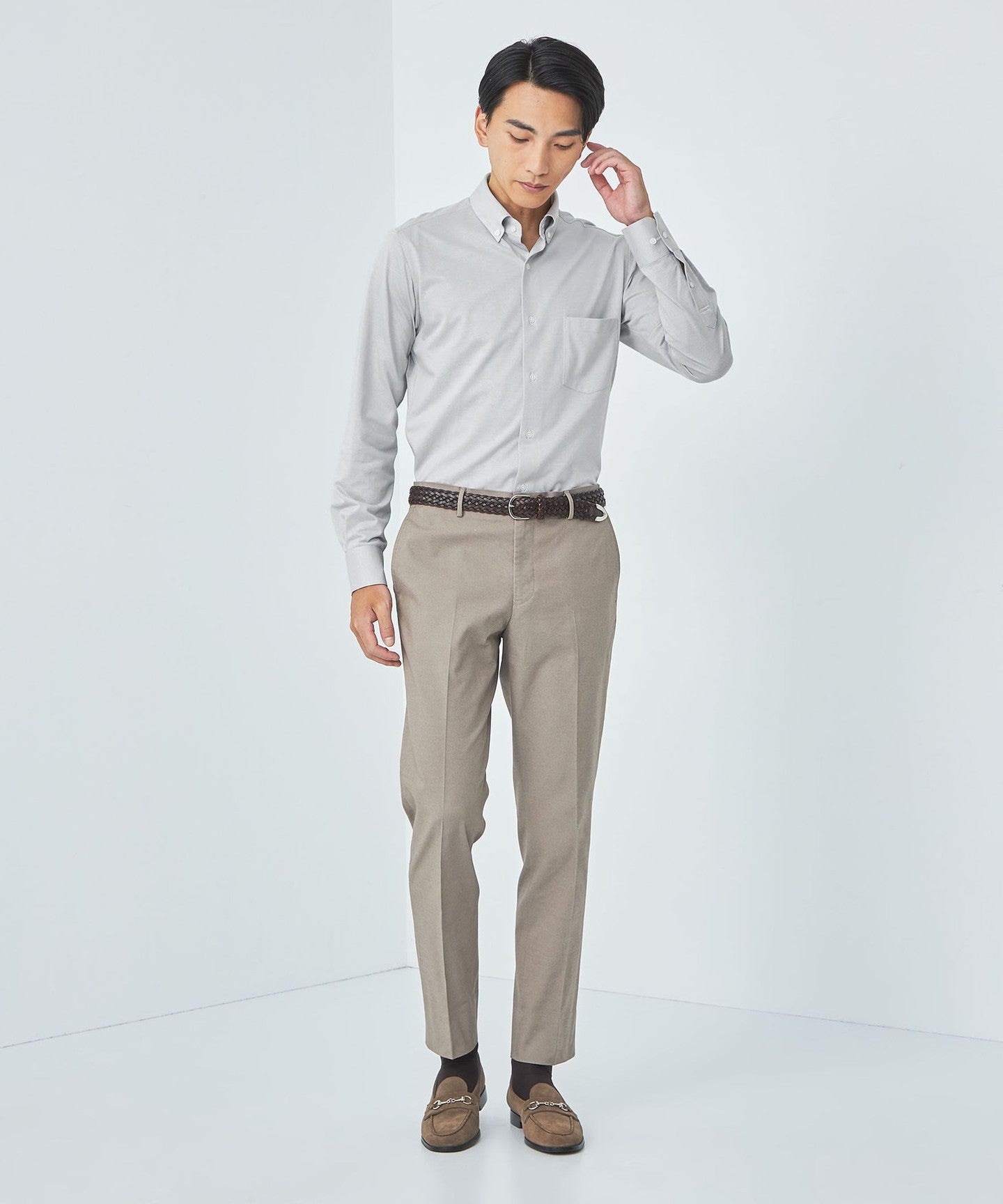 Pairing wool slacks with leather shoes will give you a neat look, while pairing easy slacks with sneakers will give you a relaxed, sporty look.