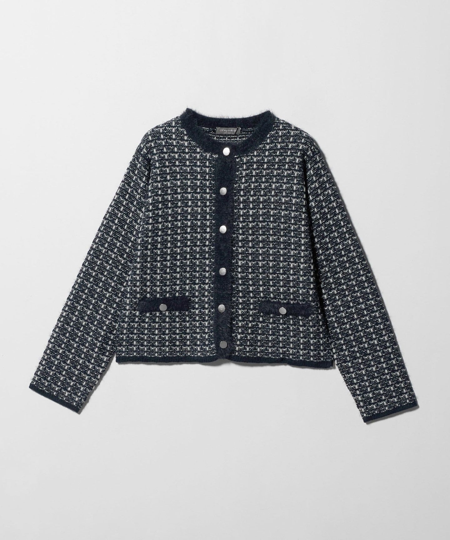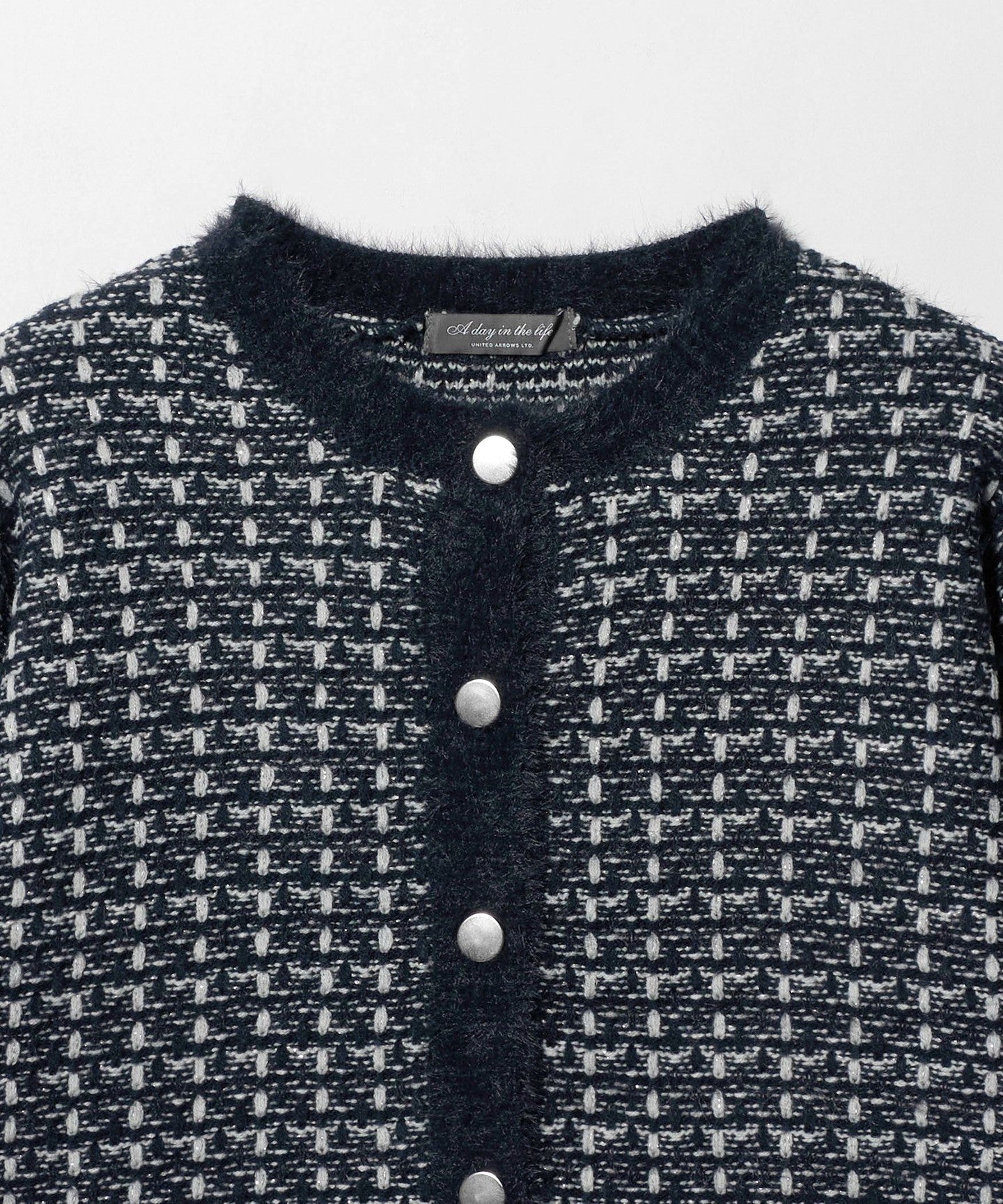 The collar, placket, and pocket openings are made with feather yarn to accentuate the fluffy texture.