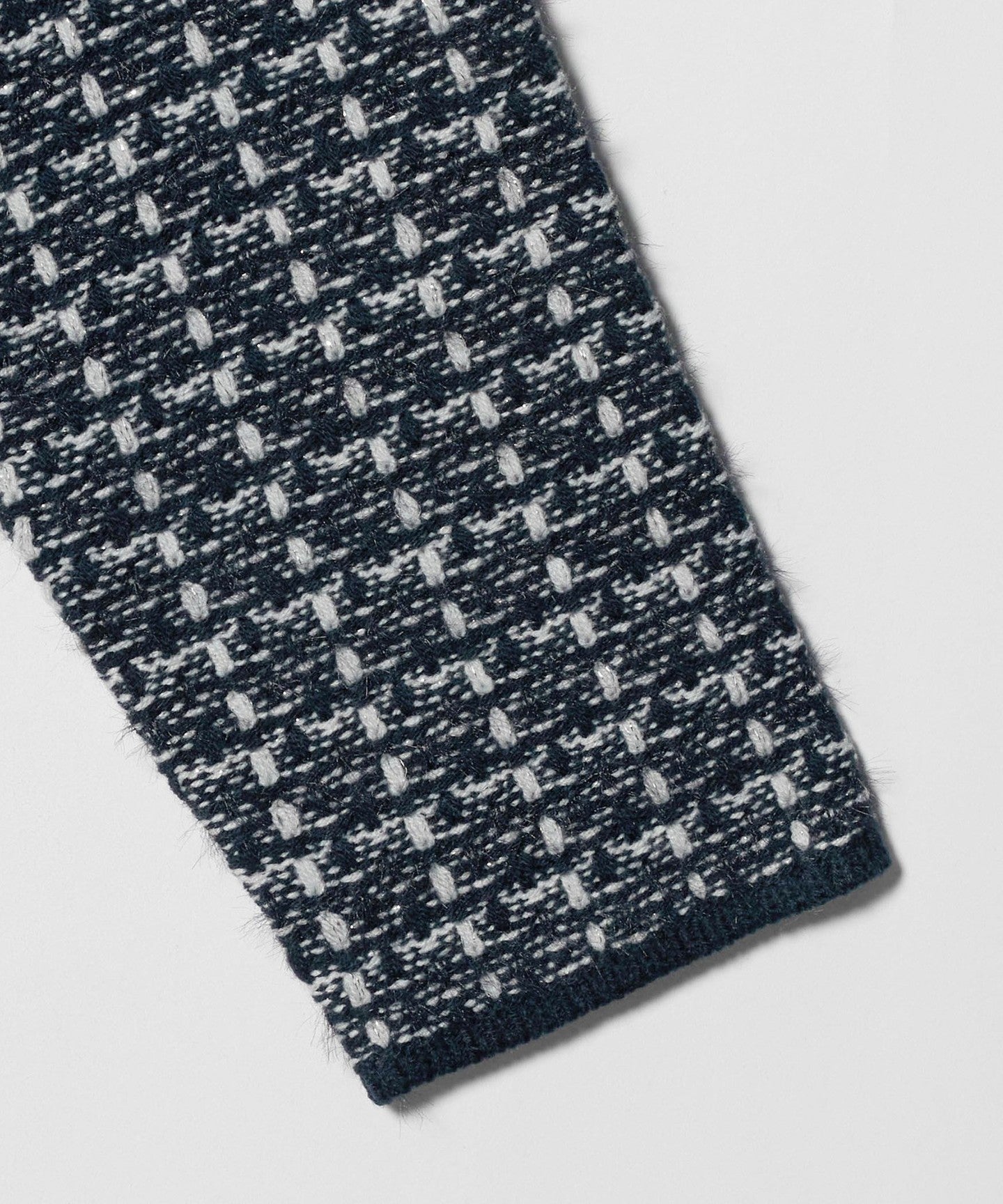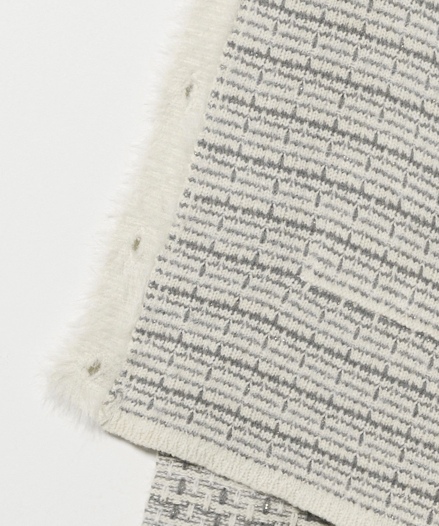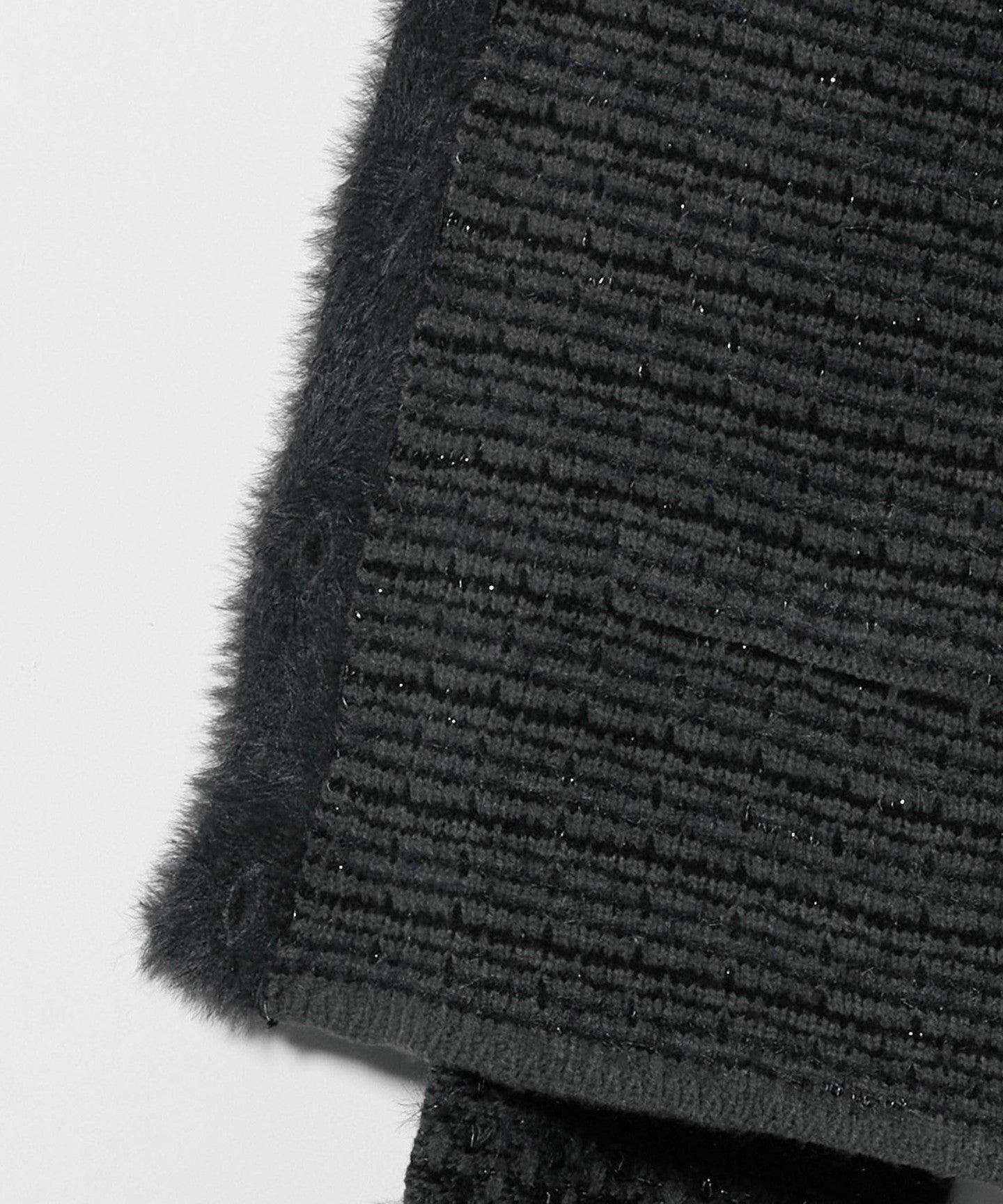 A mix of acrylic yarn, feather yarn, and lame yarn creates a tweed-like knit fabric.