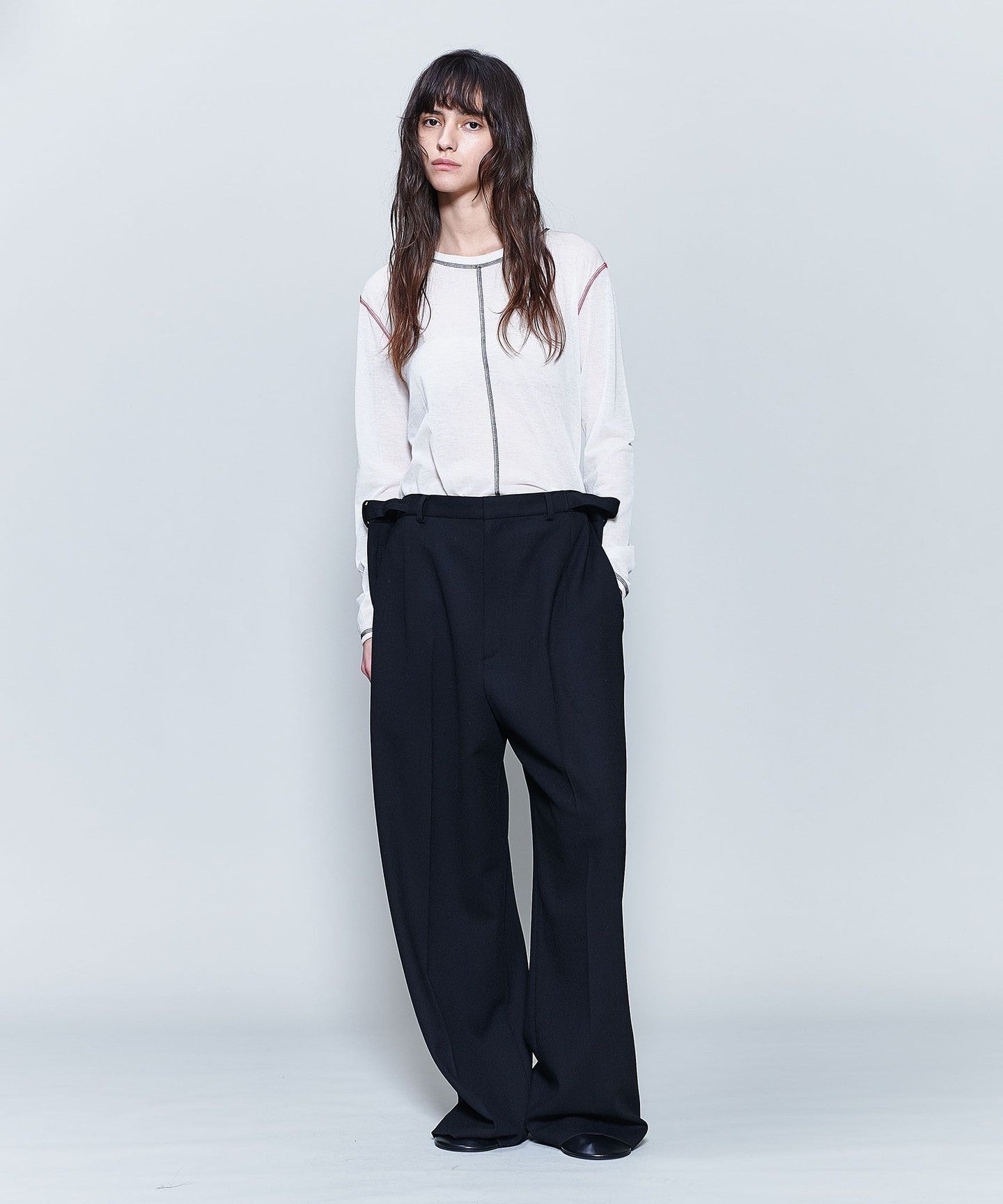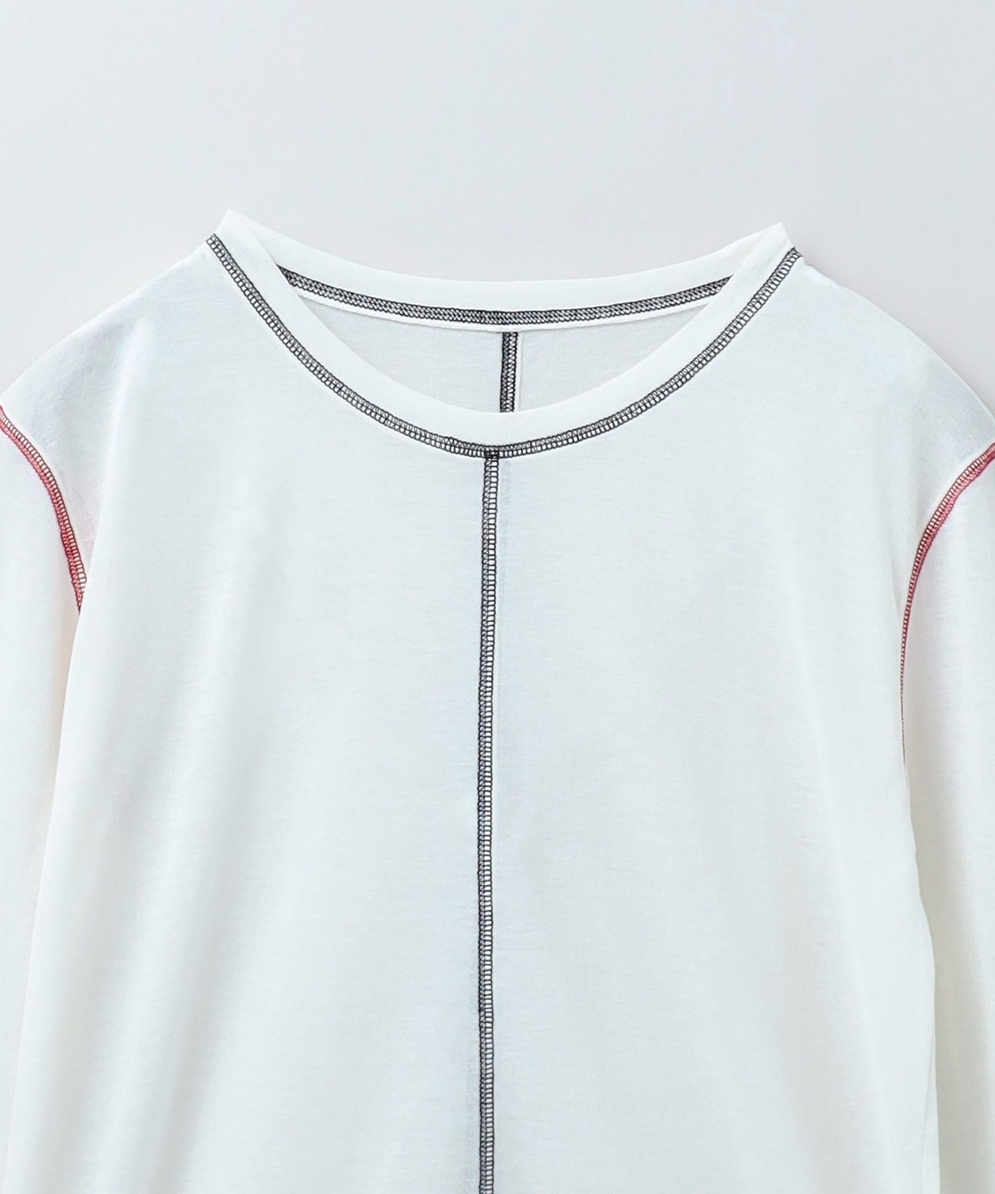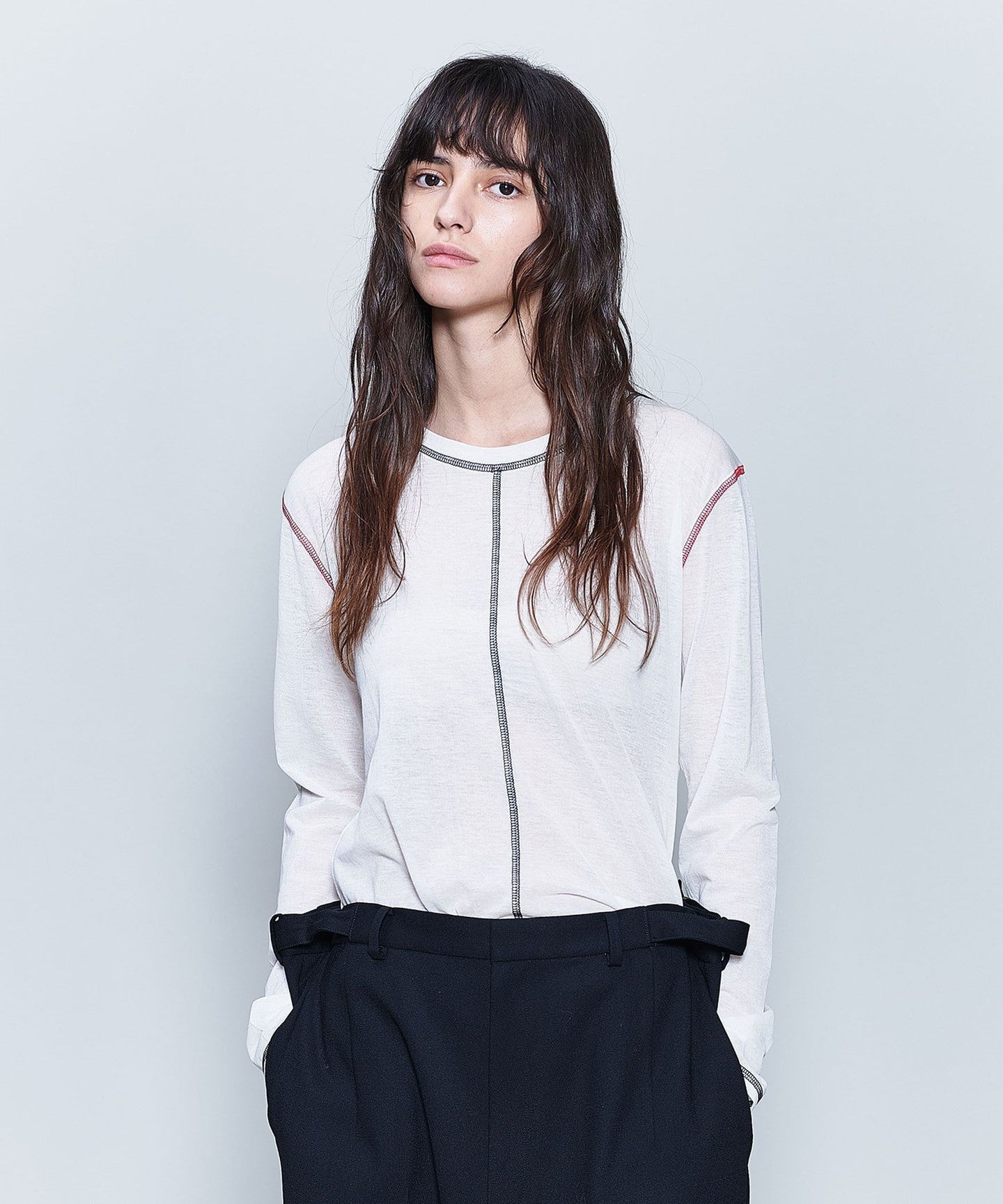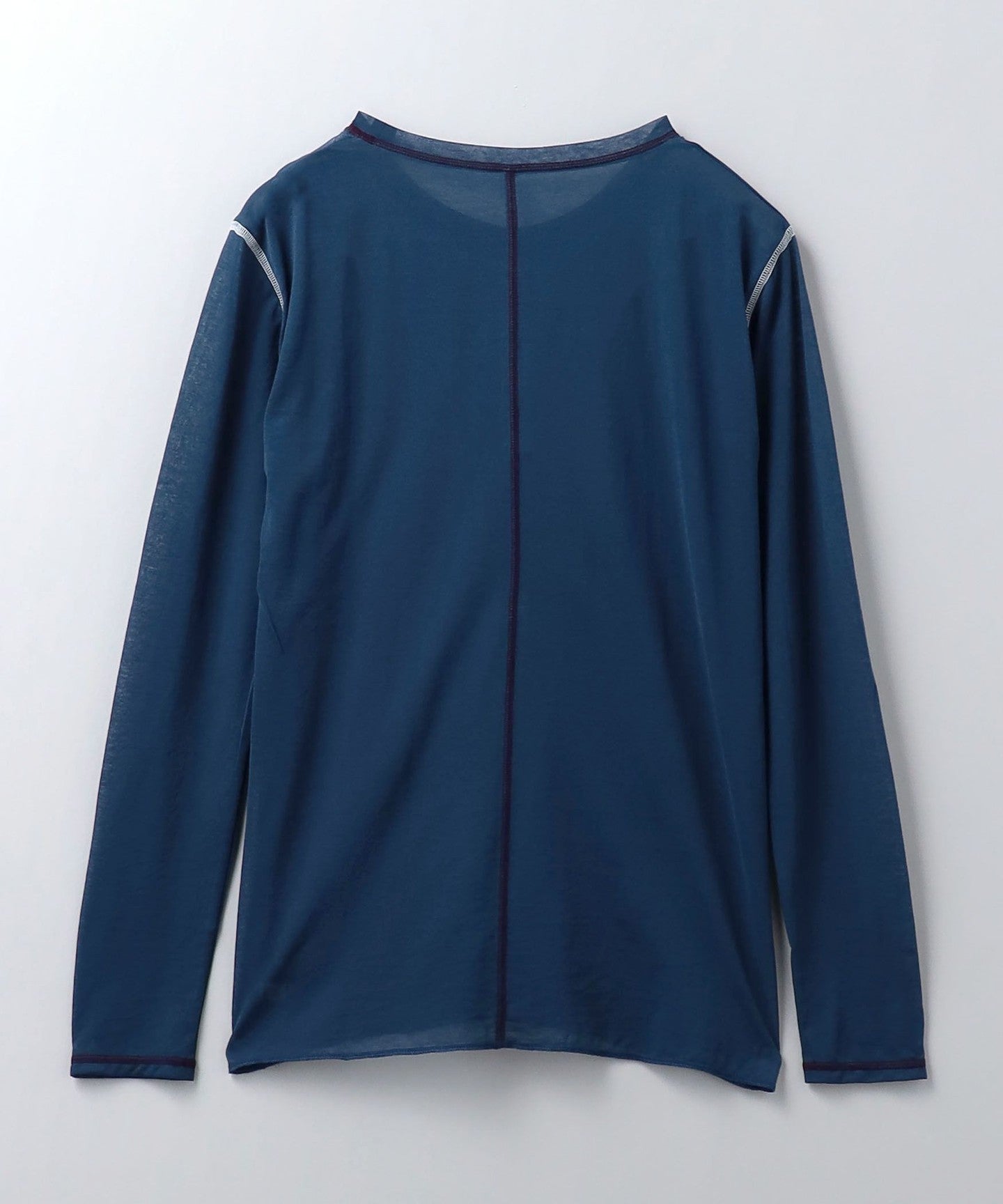 This long-sleeved T-shirt is made from thin cotton thread covered with nylon, giving it a smooth texture and an elegant transparency.