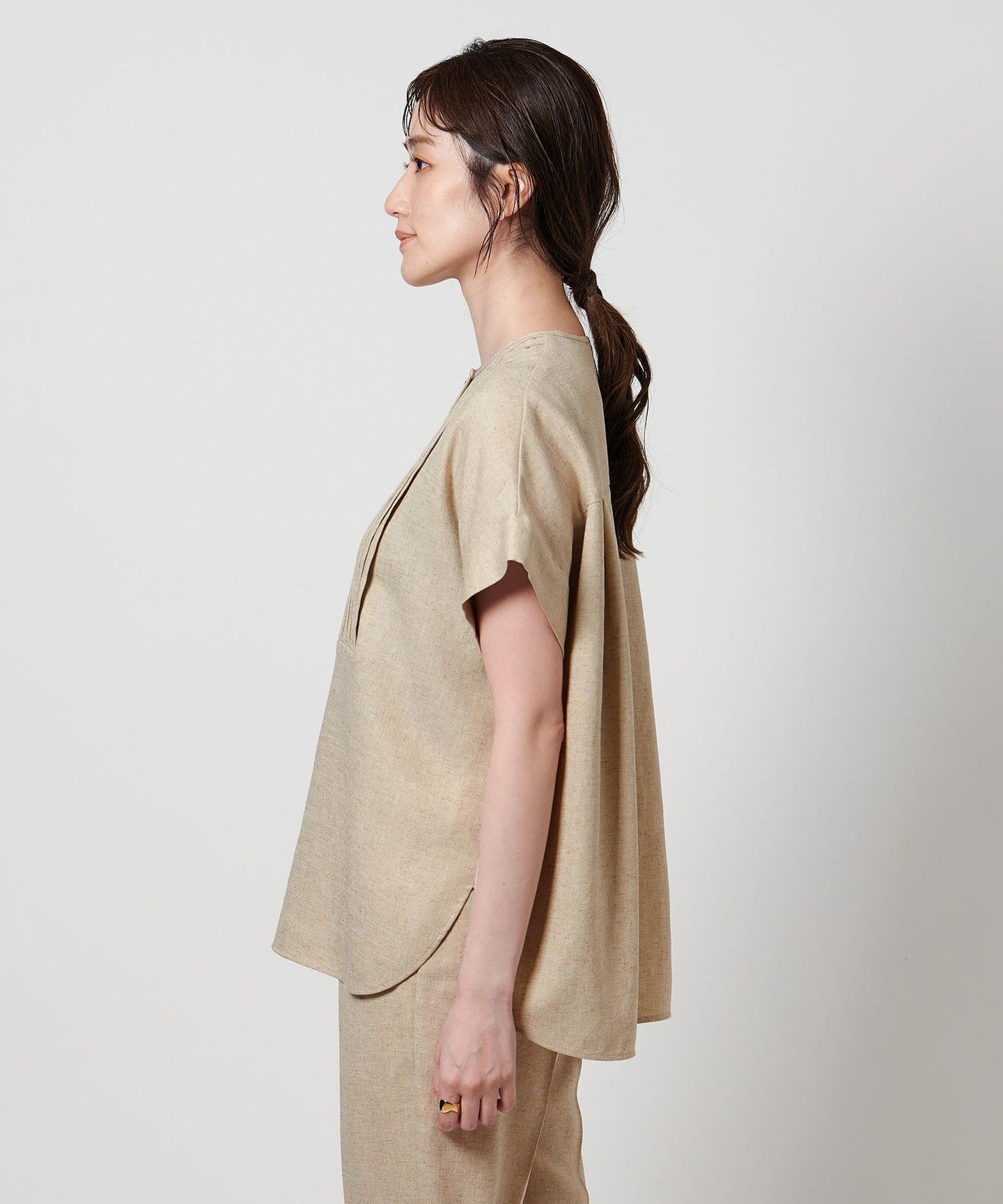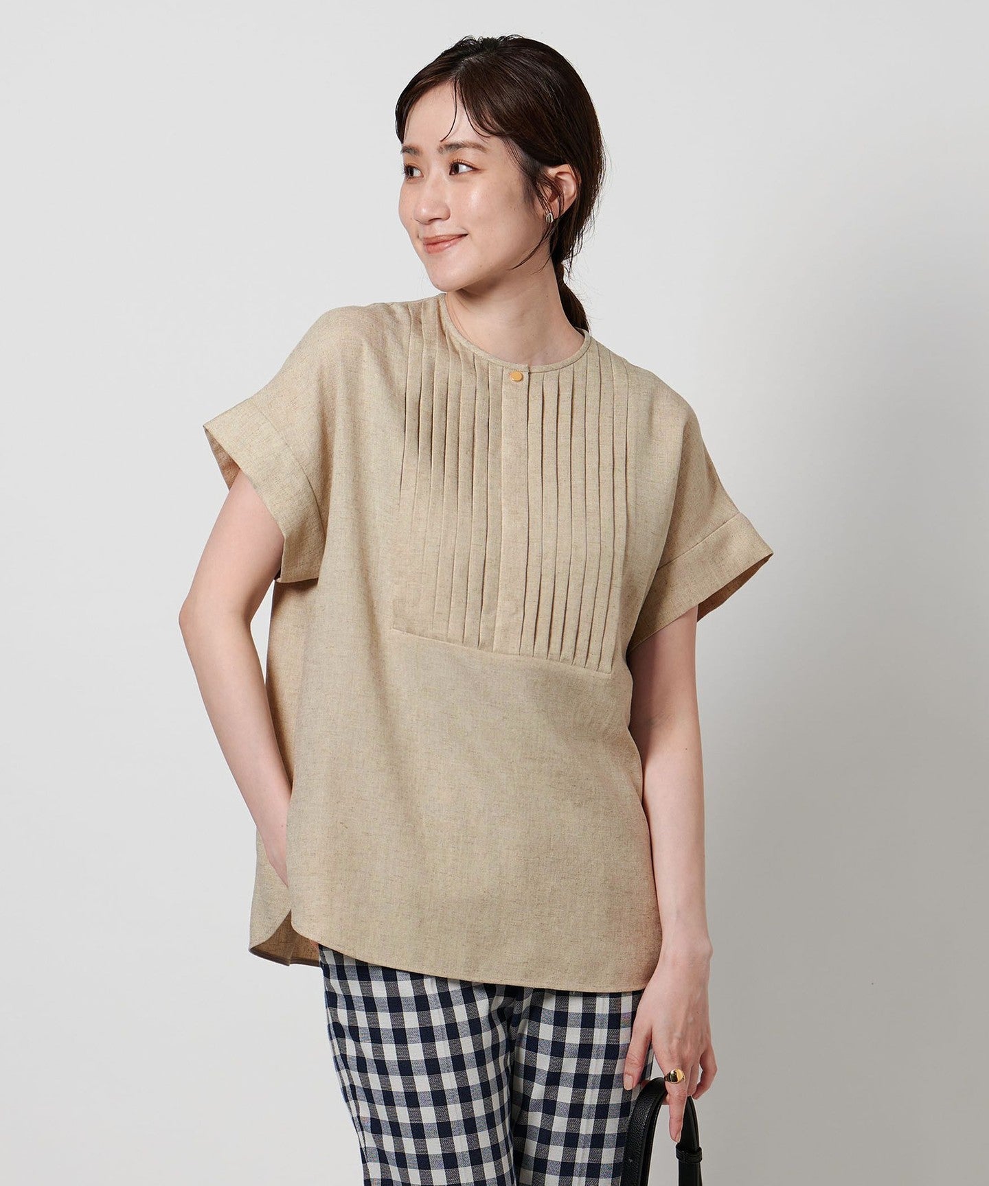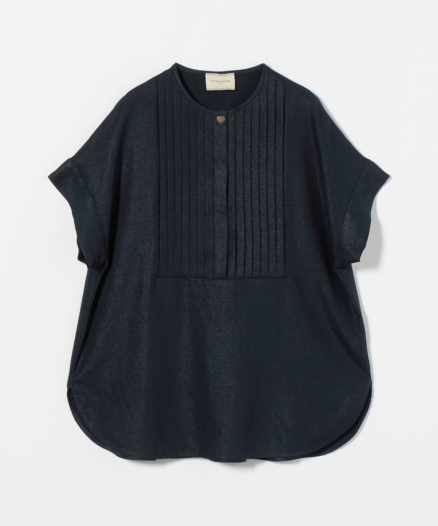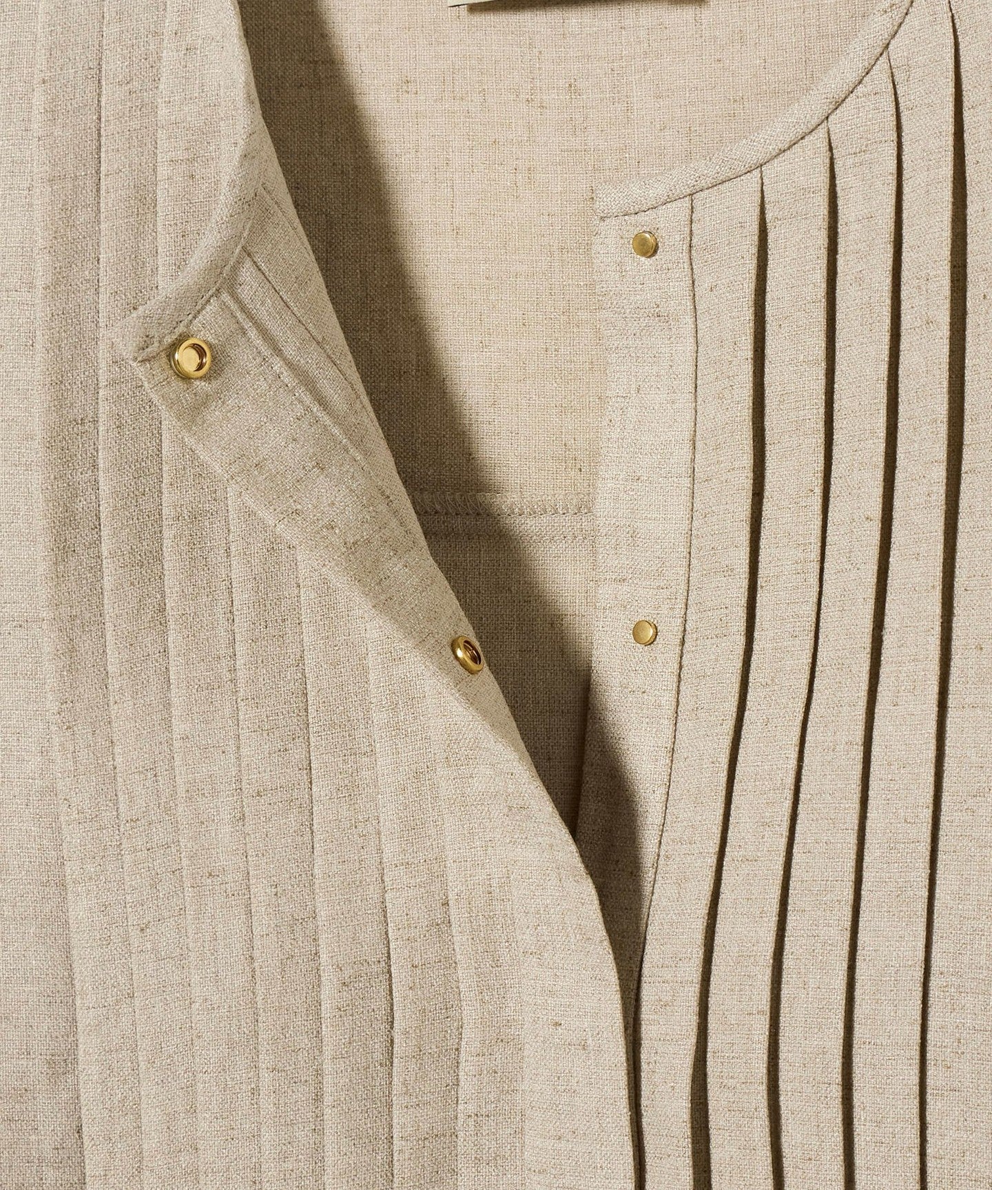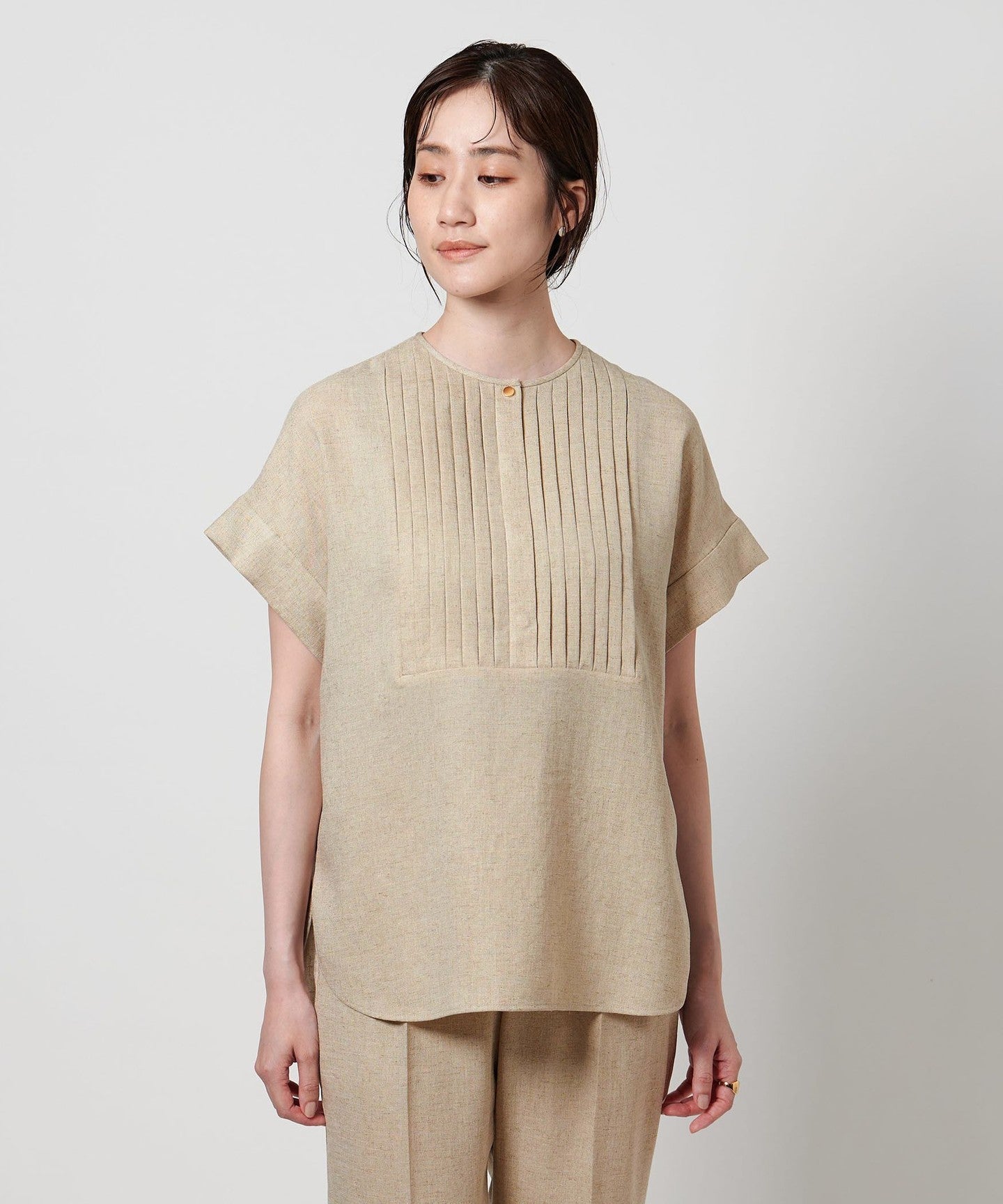 A pullover blouse with a slightly sharp look, featuring a tucked yoke on the front and gold-colored dot buttons.
