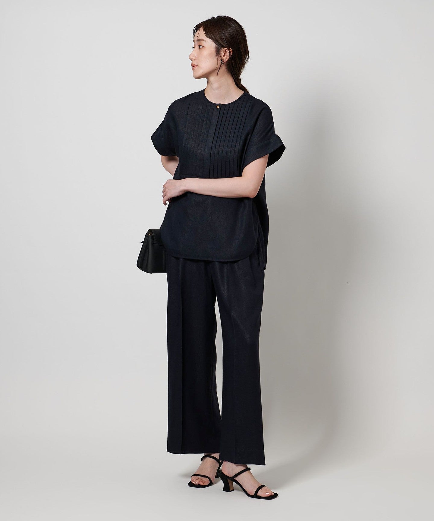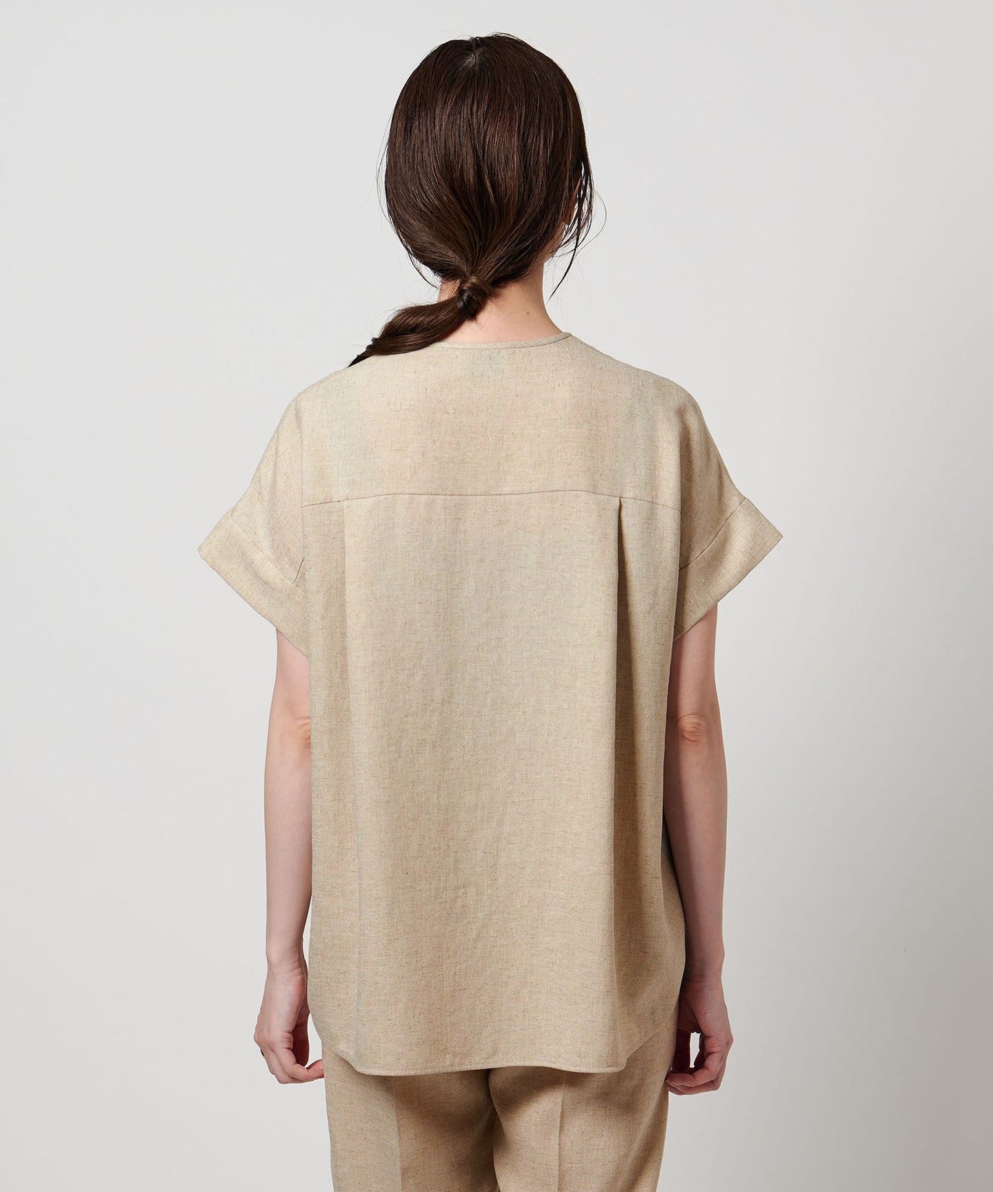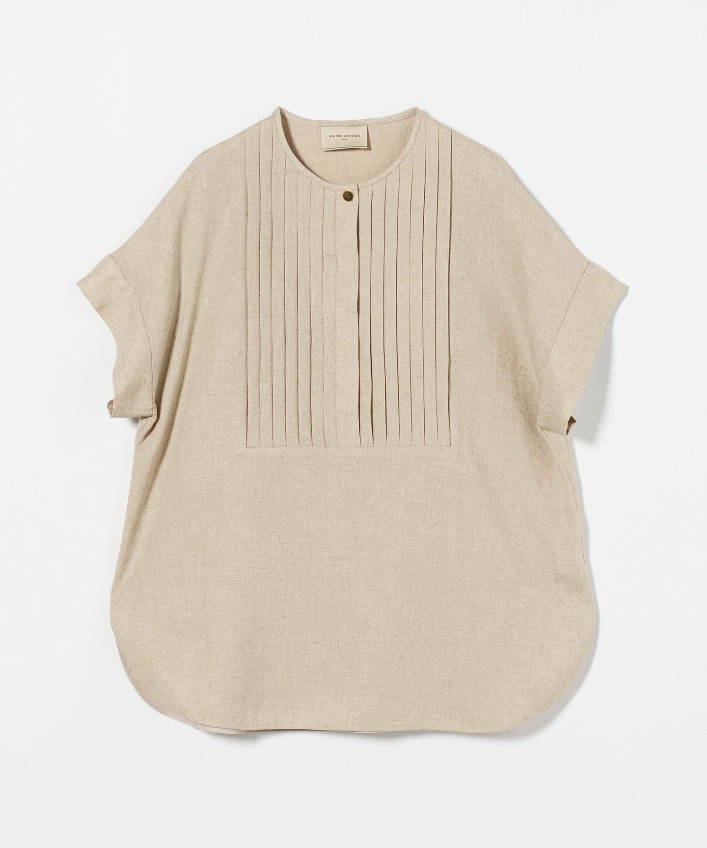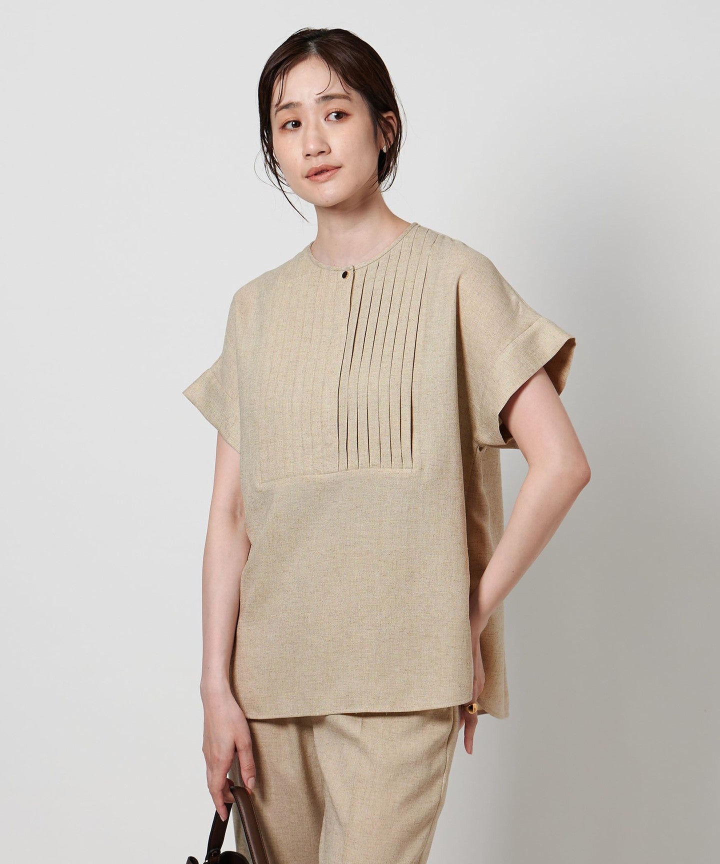 A pullover blouse with a slightly sharp look, featuring a tucked yoke on the front and gold-colored dot buttons.