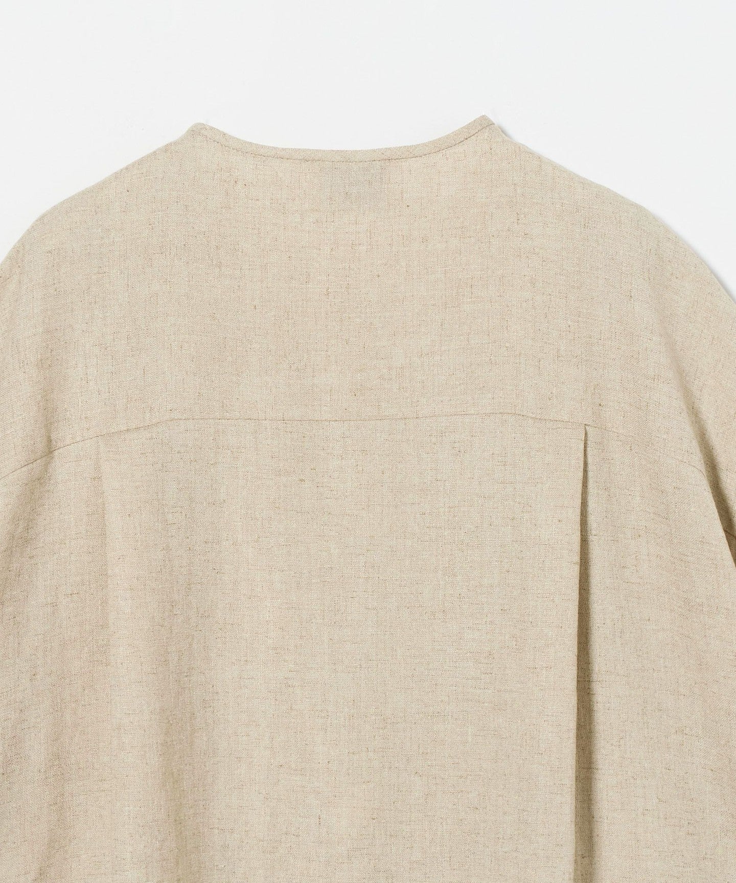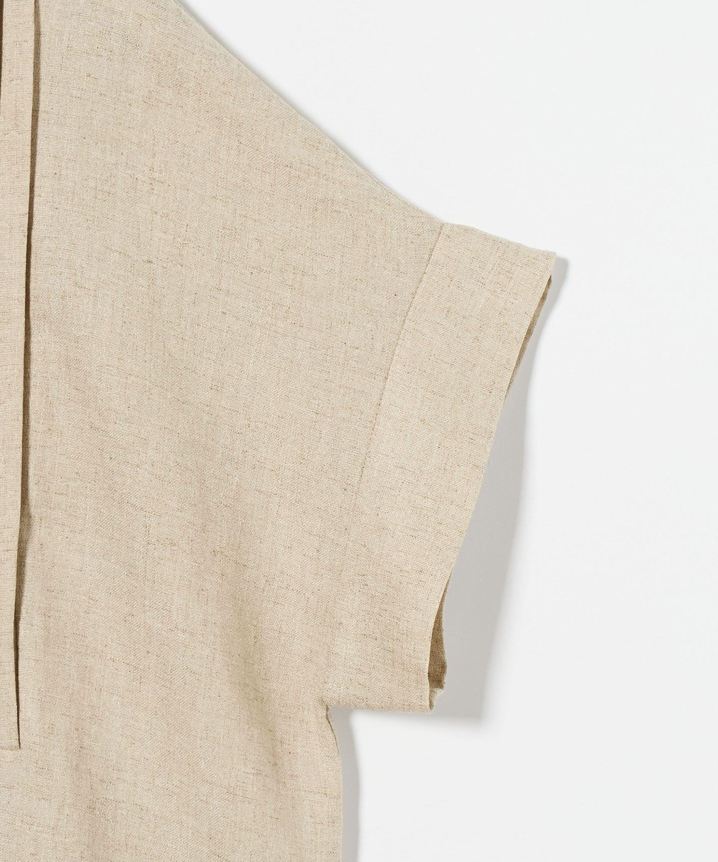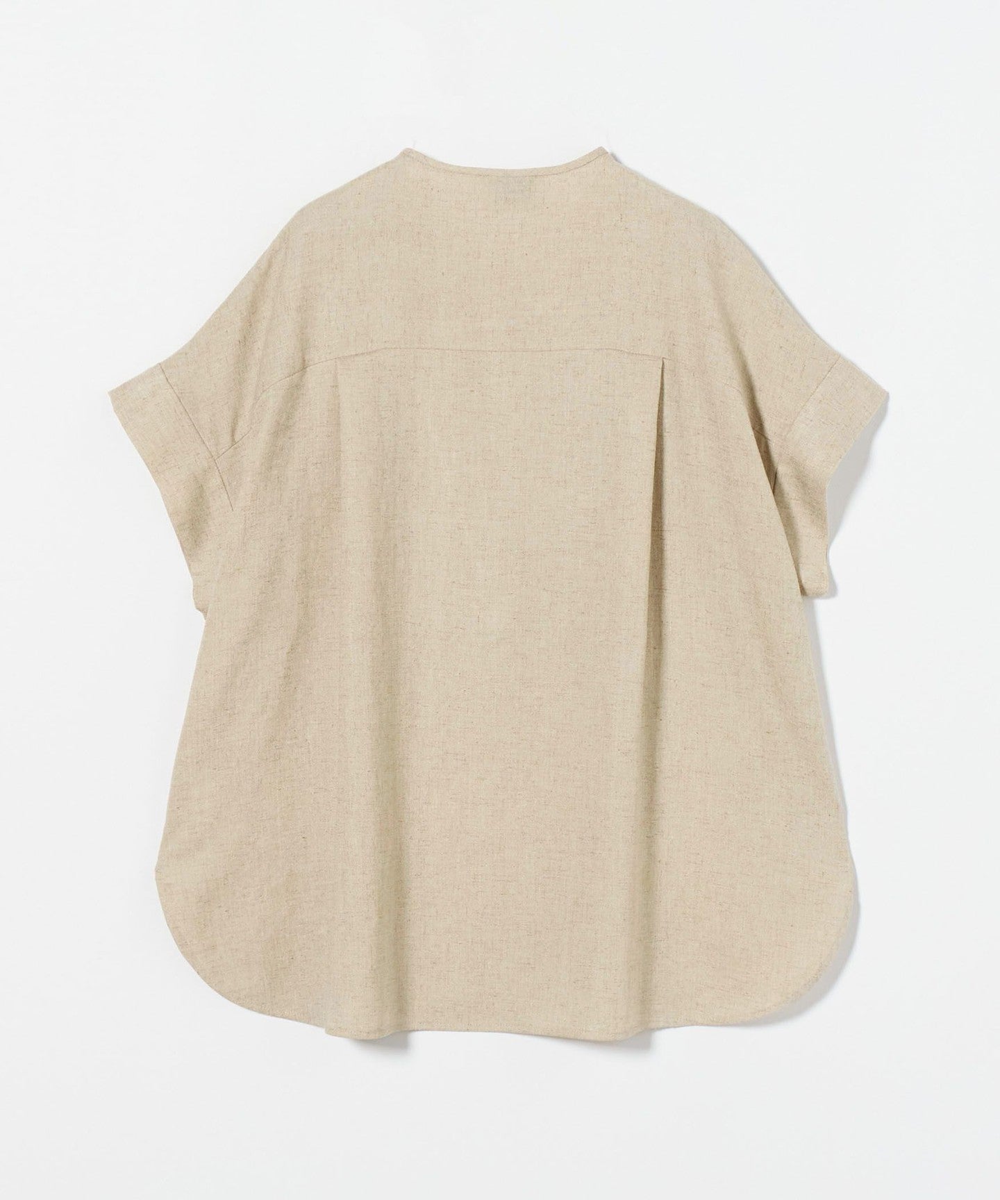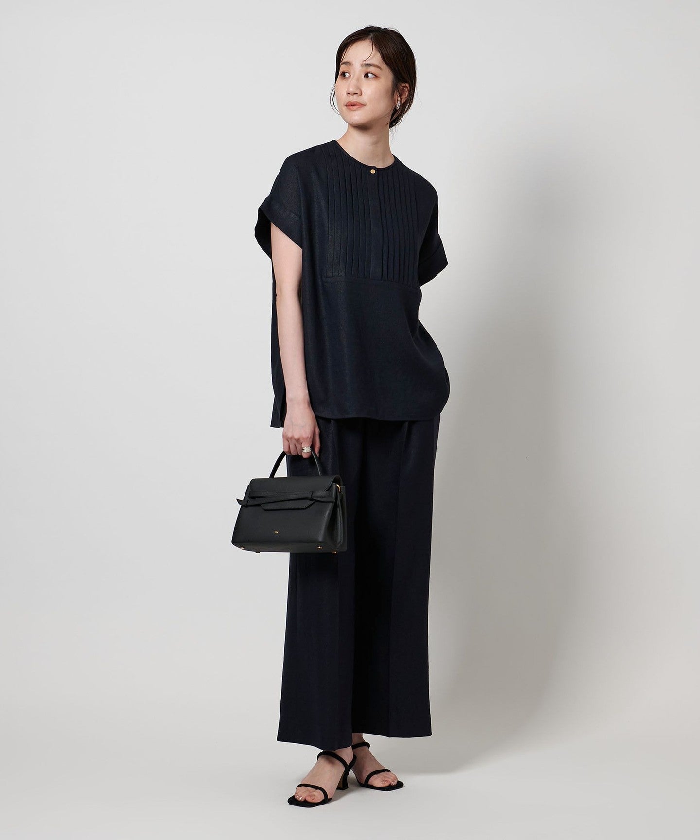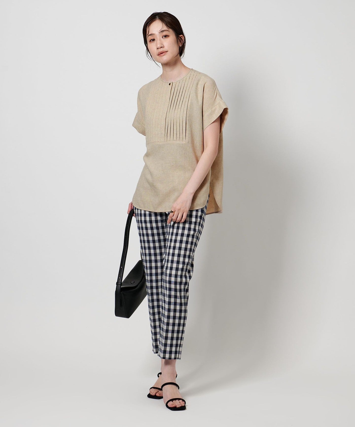 A pullover blouse with a slightly sharp look, featuring a tucked yoke on the front and gold-colored dot buttons.