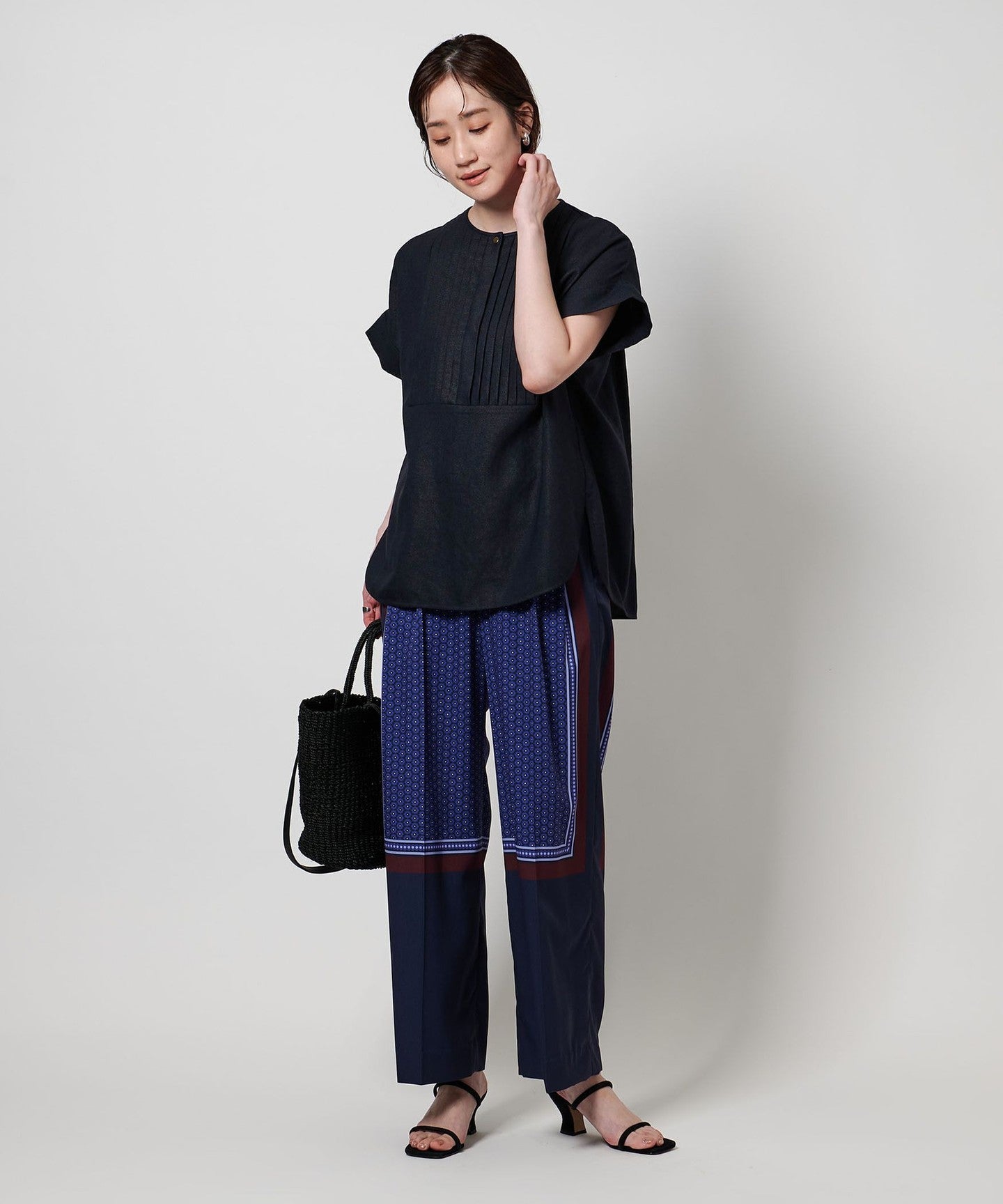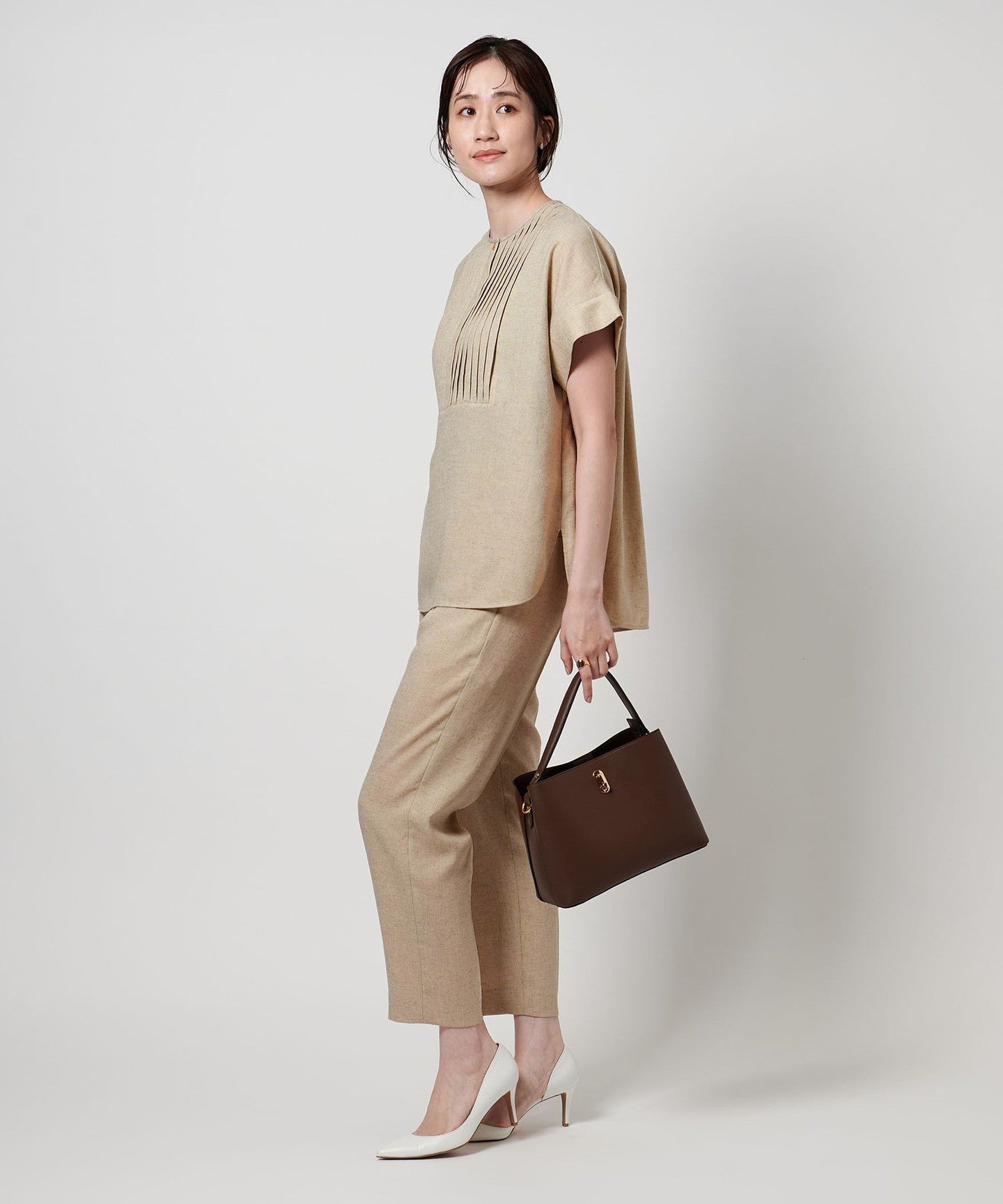 It can be worn as a set with pants made of the same material, and we also recommend pairing it with slim, tapered pants made of other materials.