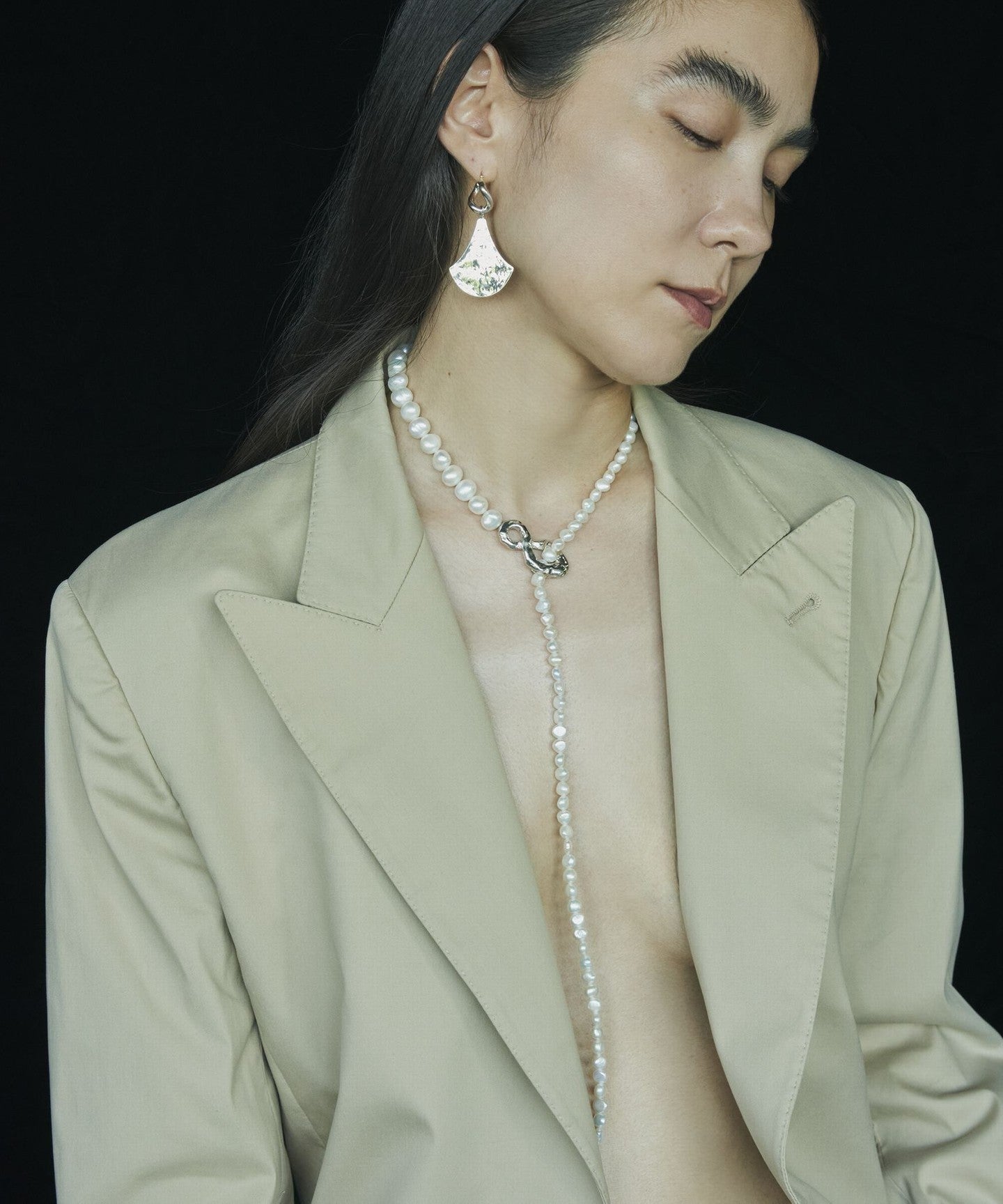 In collaboration with artisans from fine jewelry workshops, the brand's jewelry is characterized by the use of primarily organic materials, such as irregularly shaped baroque pearls and natural stones carved by traditional gemstone carving craftsmen.