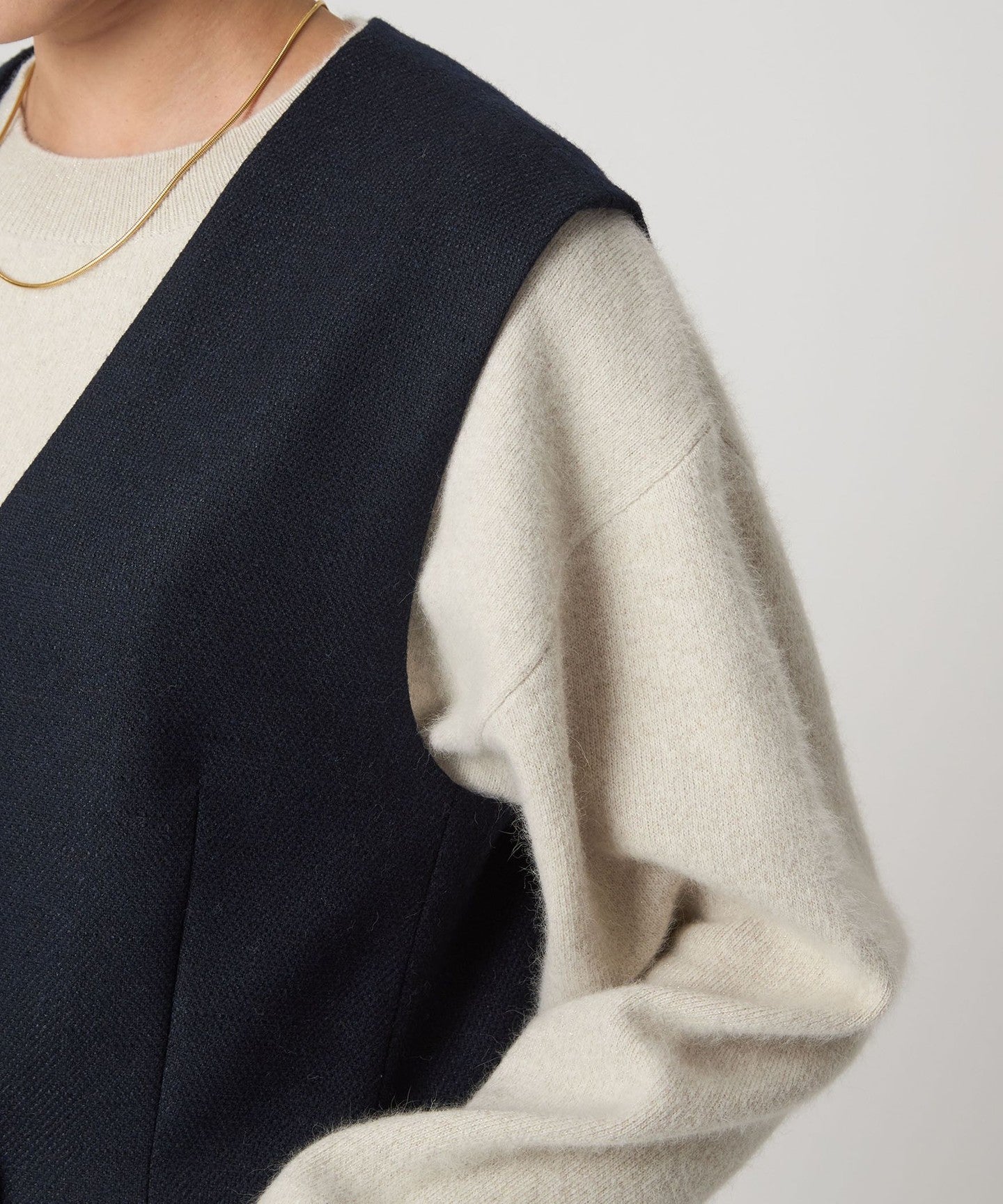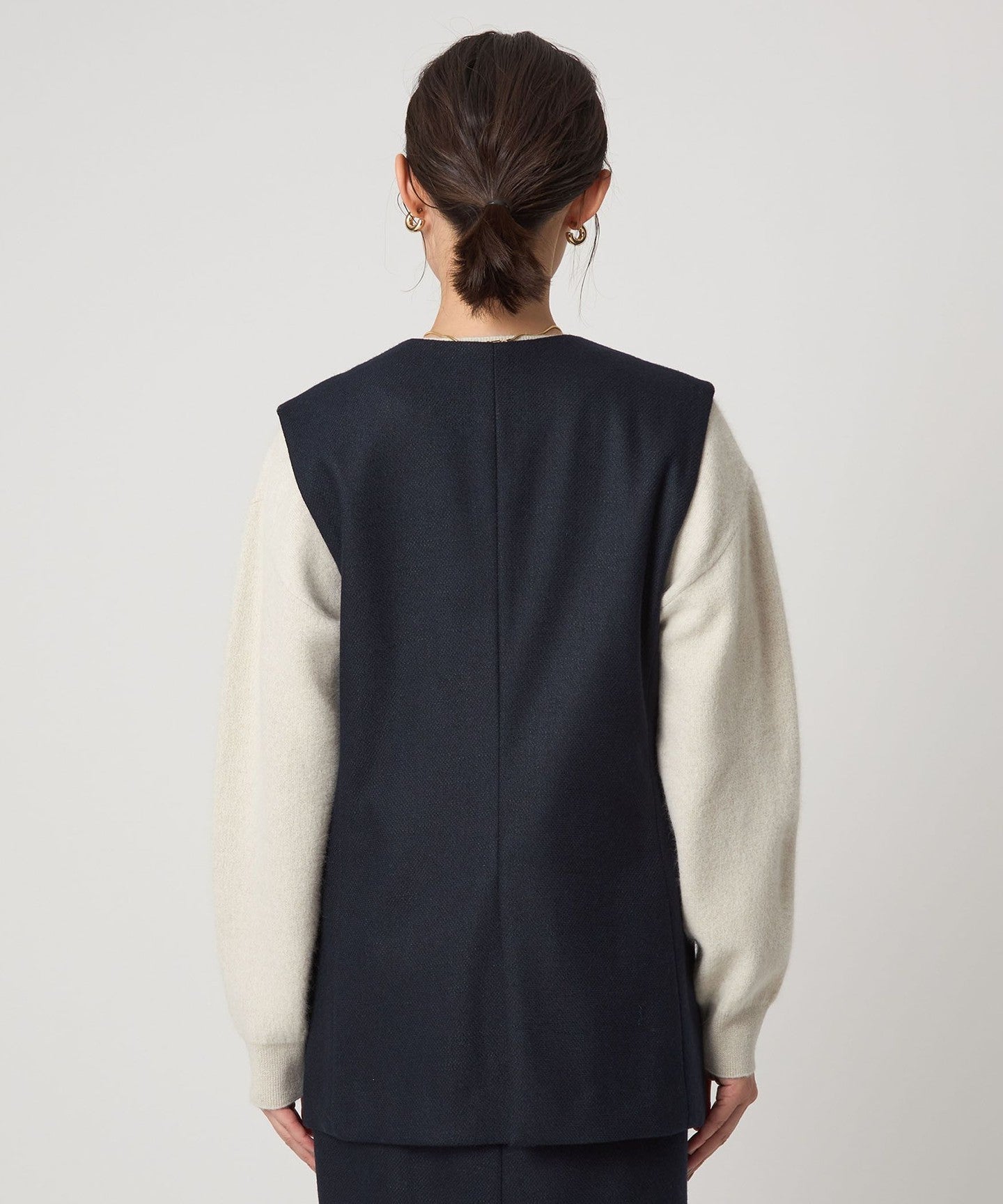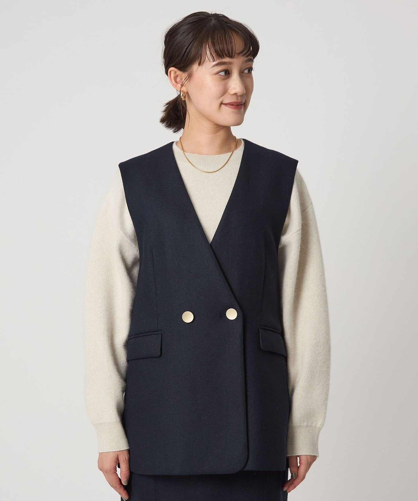 ノーラペルのデザインですっきりと着用いただけるジレ。