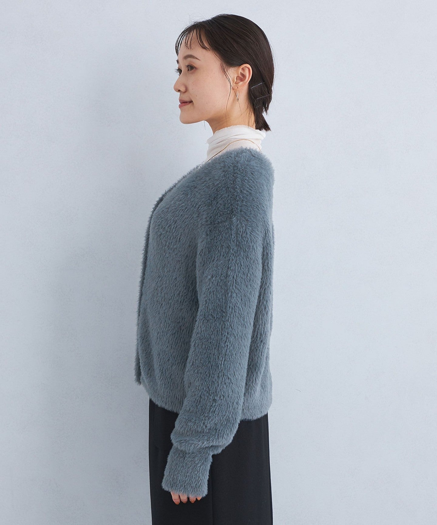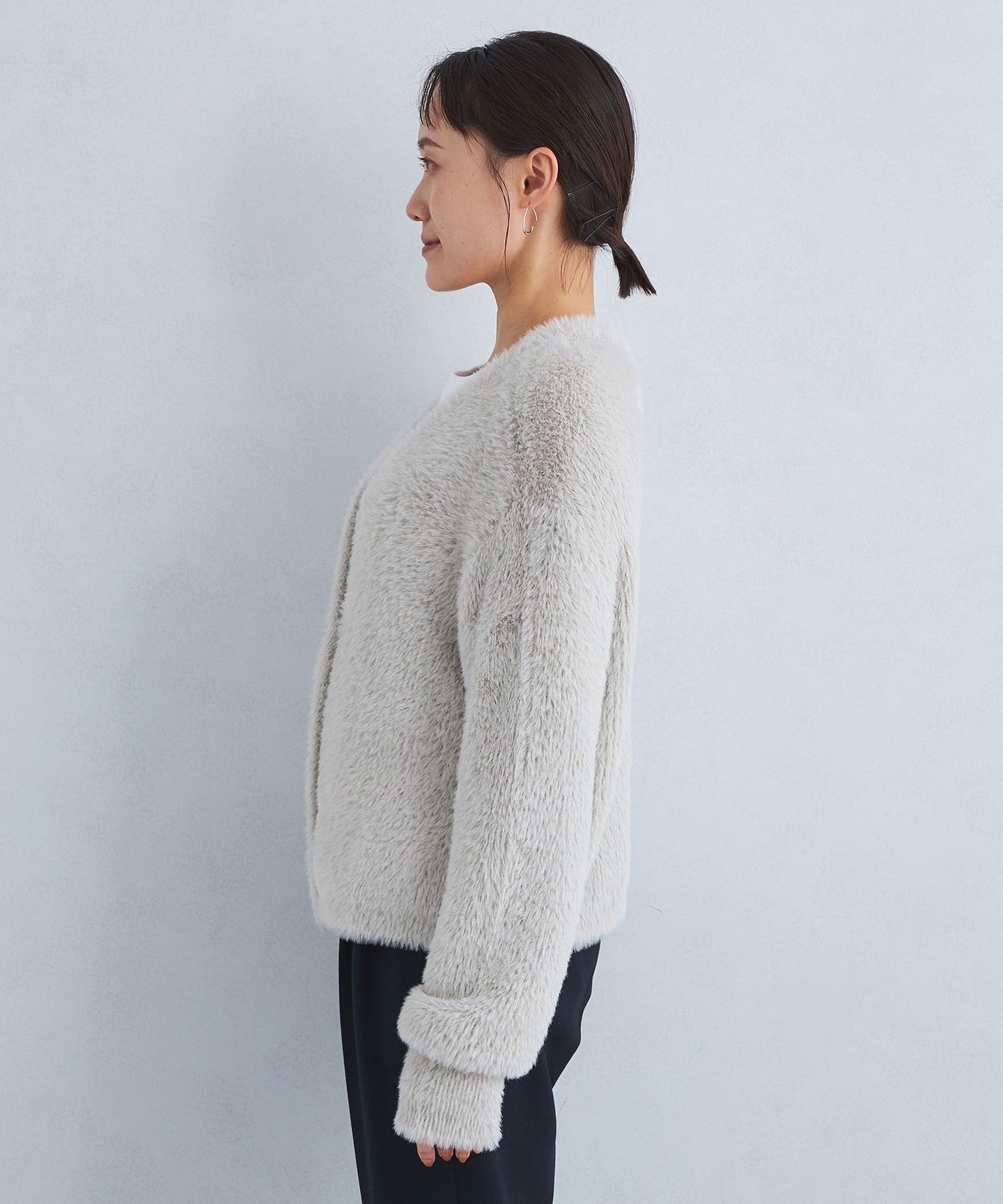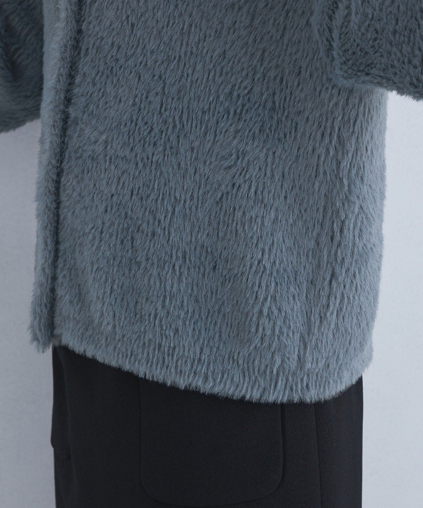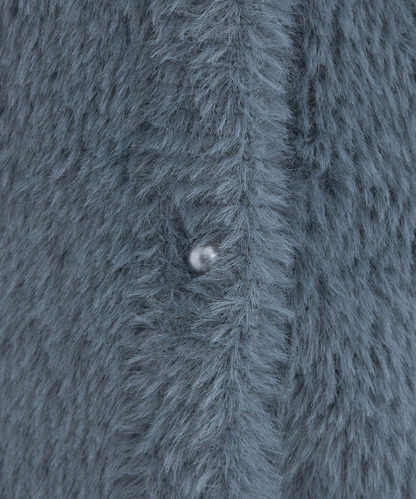 A knit cardigan with an attractive, fluffy, long-pile material.