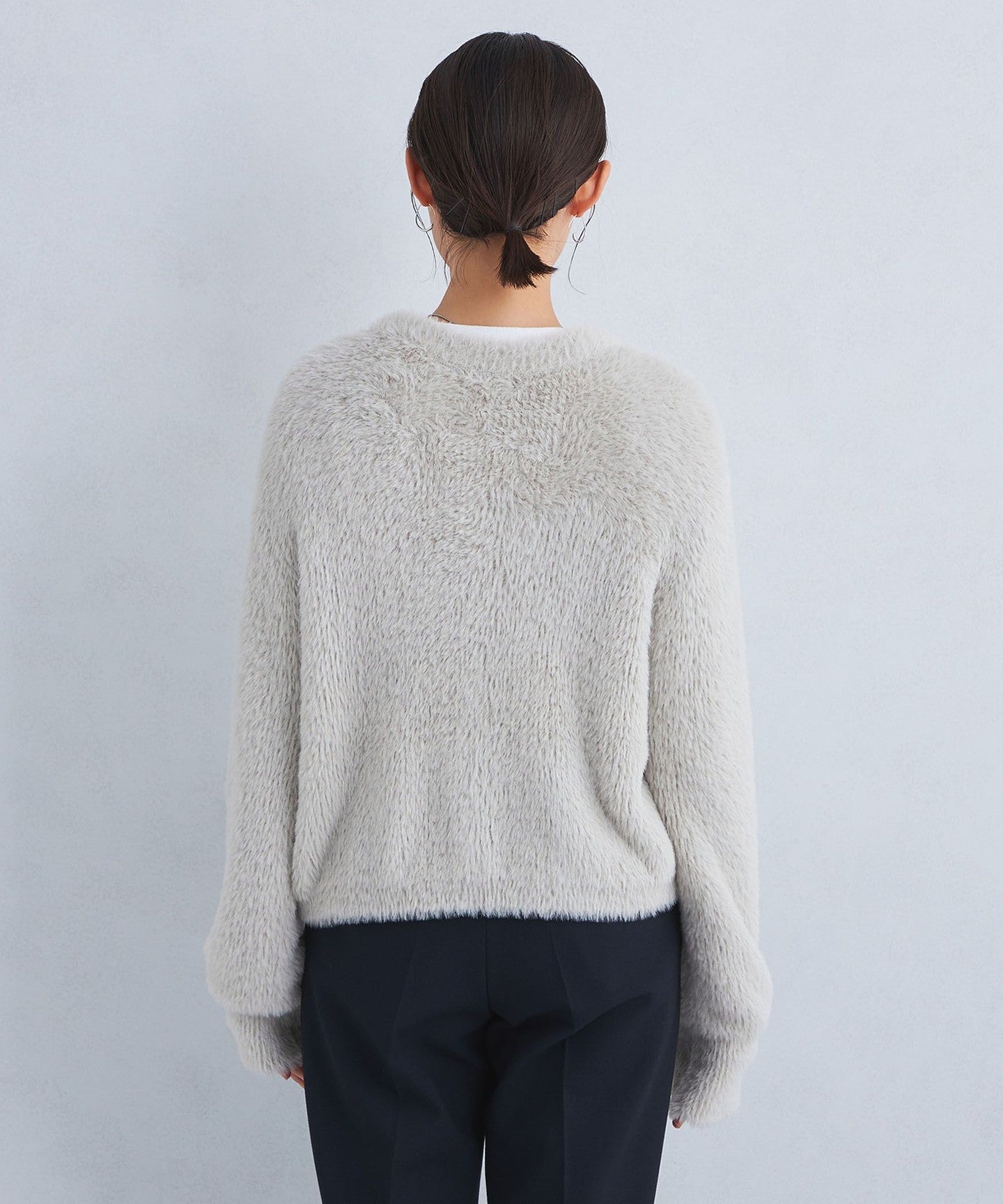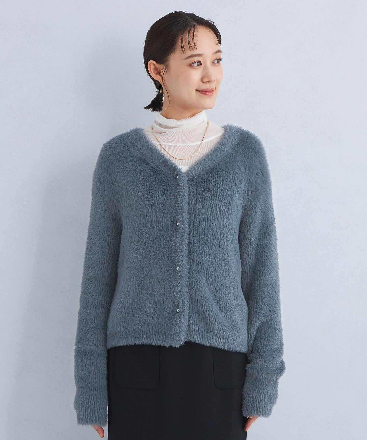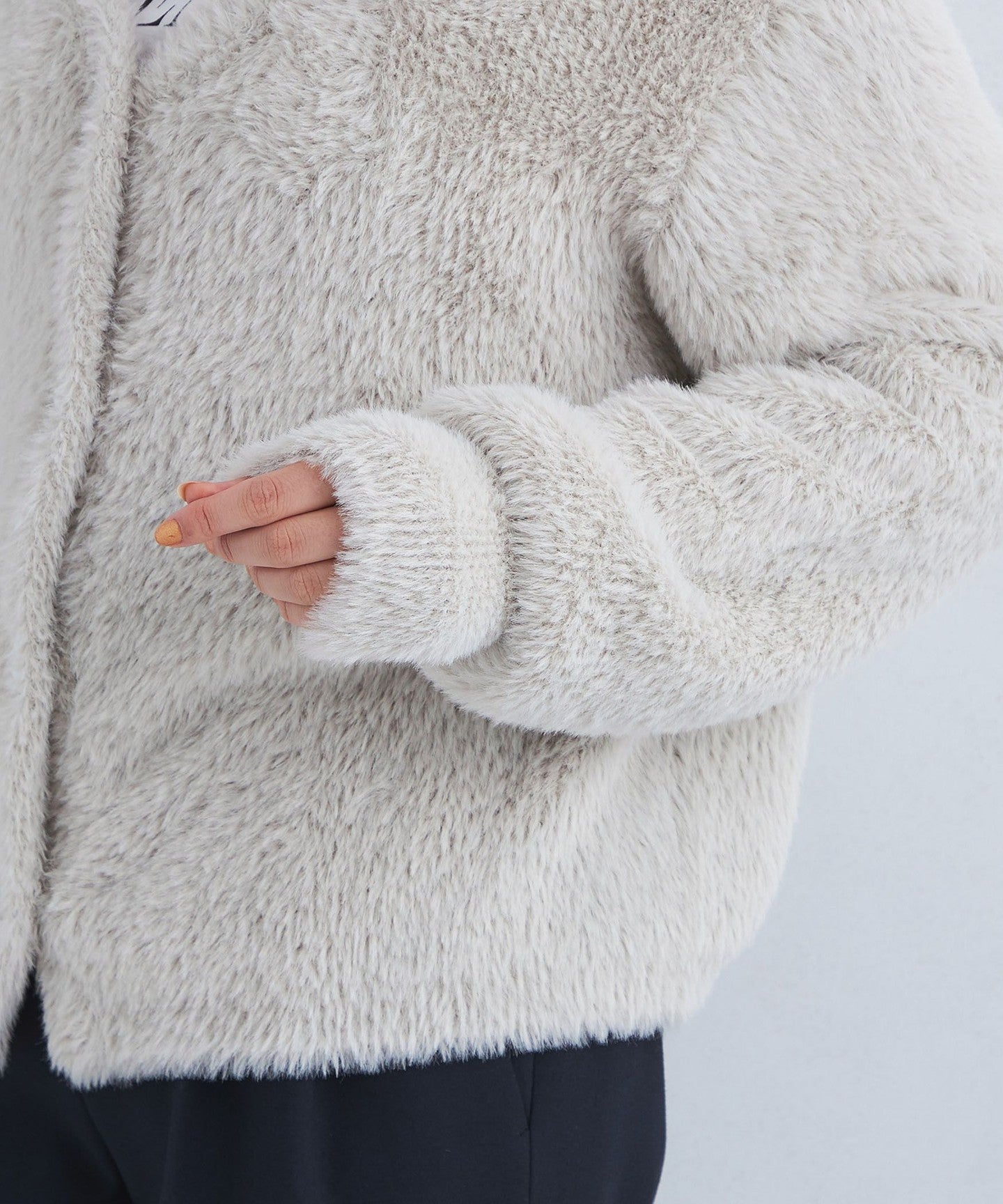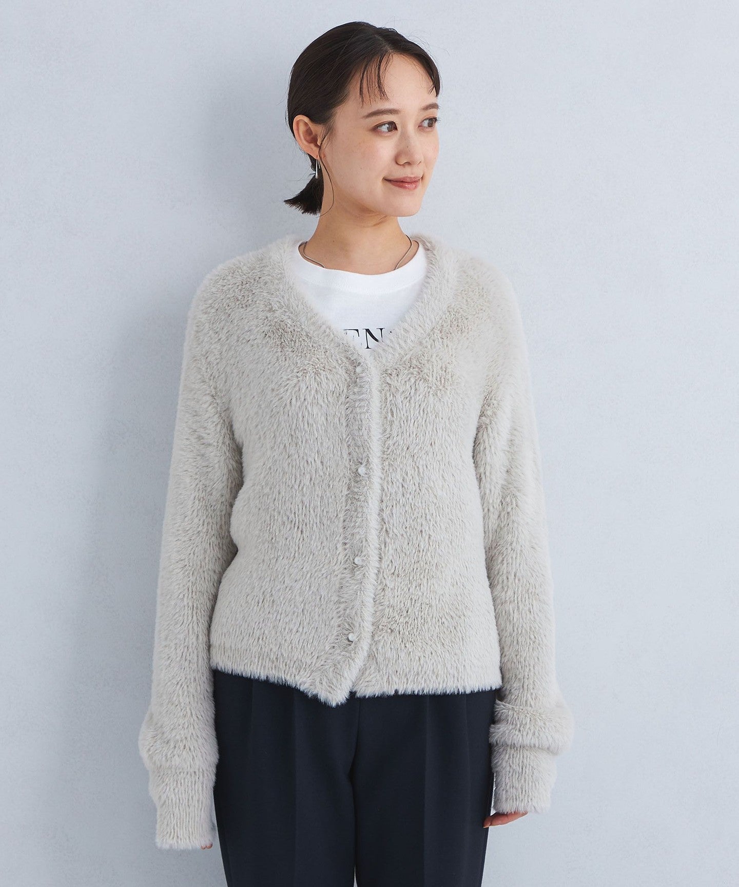 A knit cardigan with an attractive, fluffy, long-pile material.