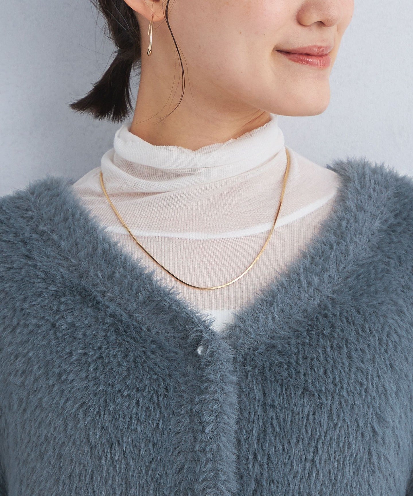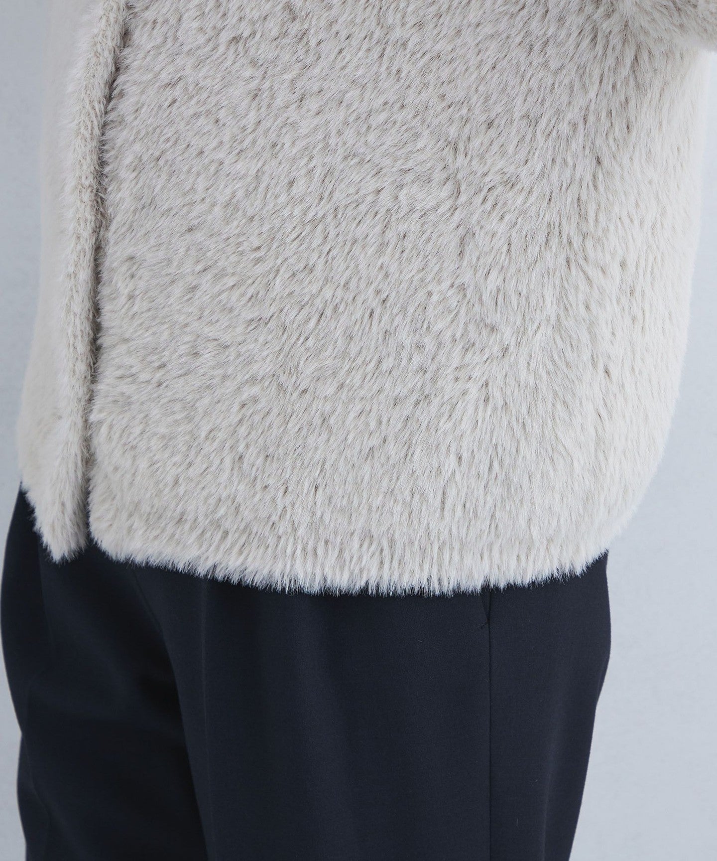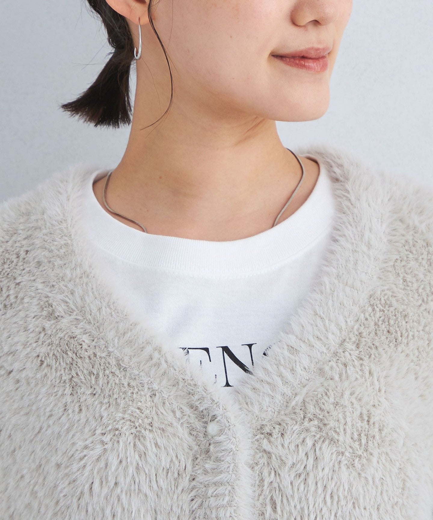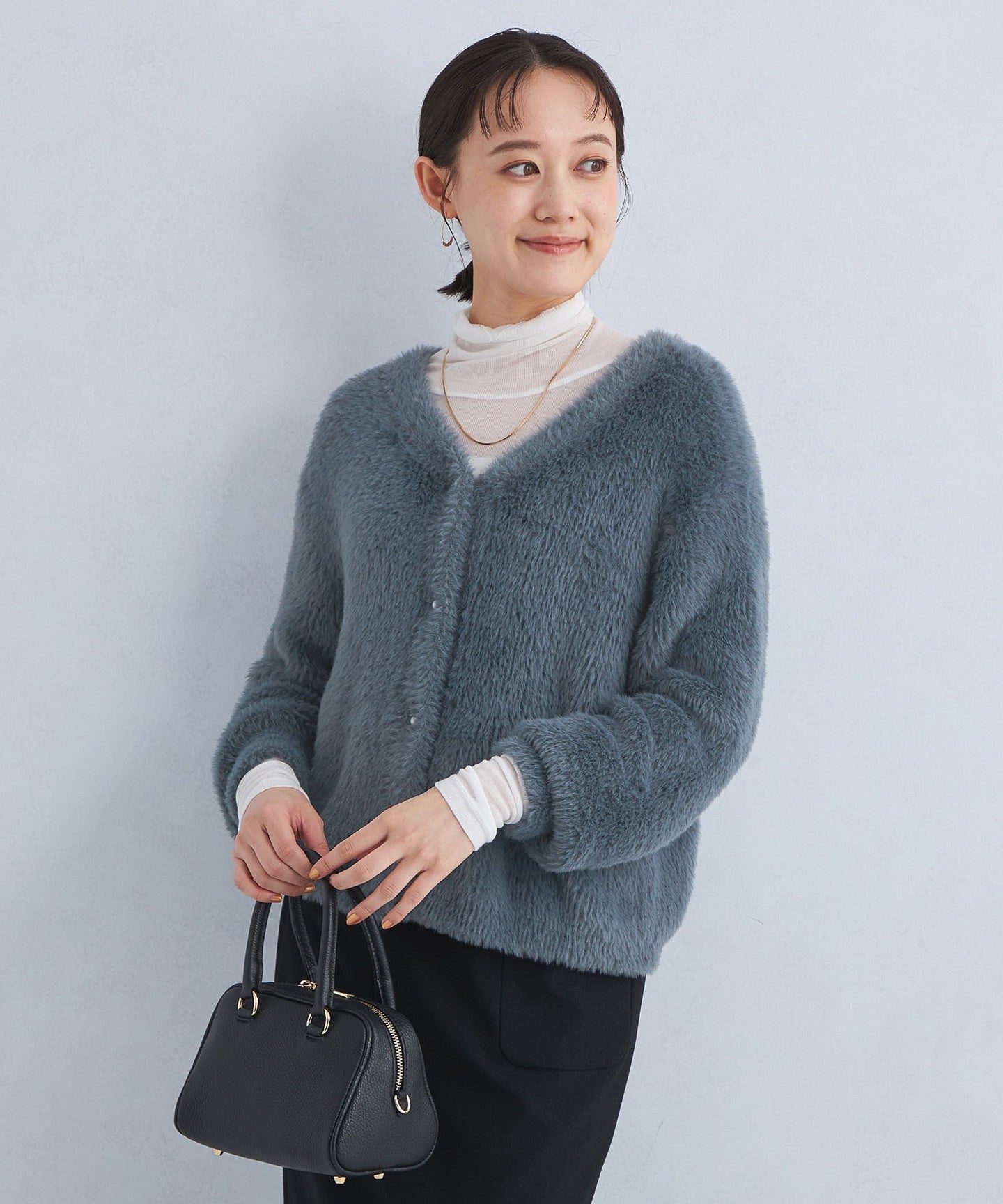 A knit cardigan with an attractive, fluffy, long-pile material.