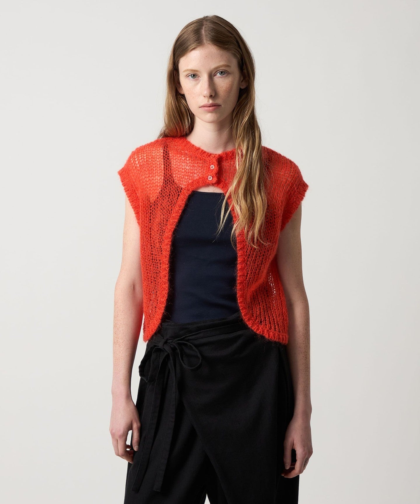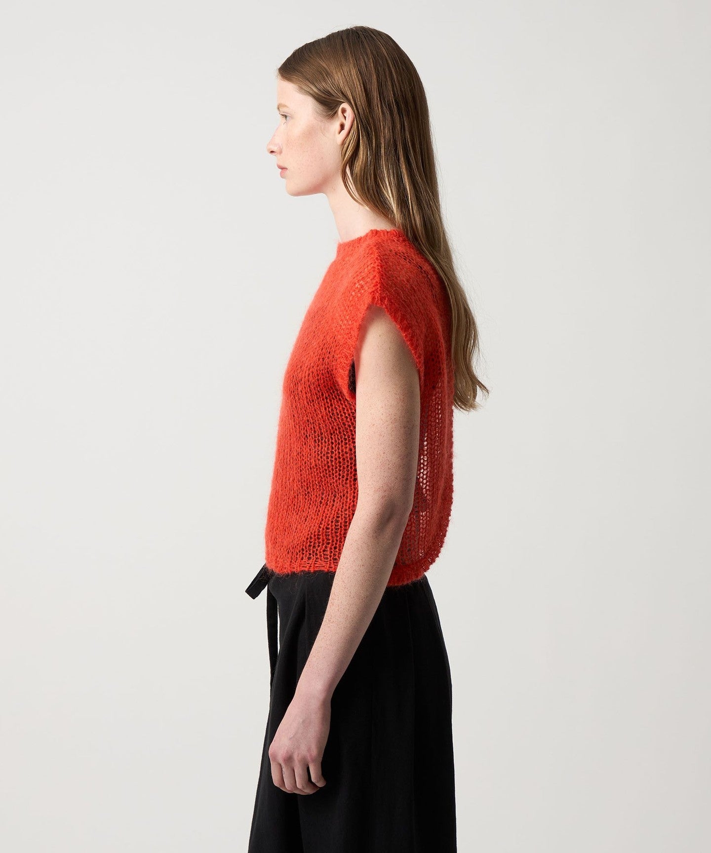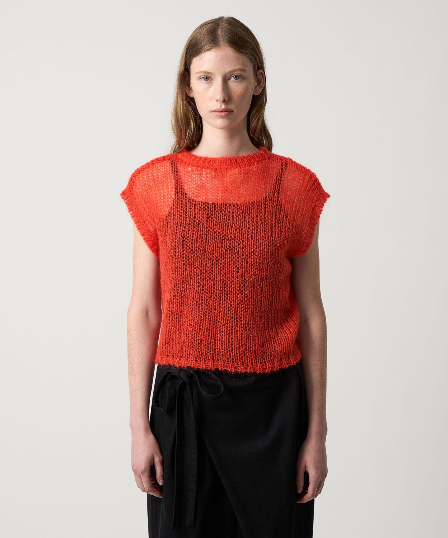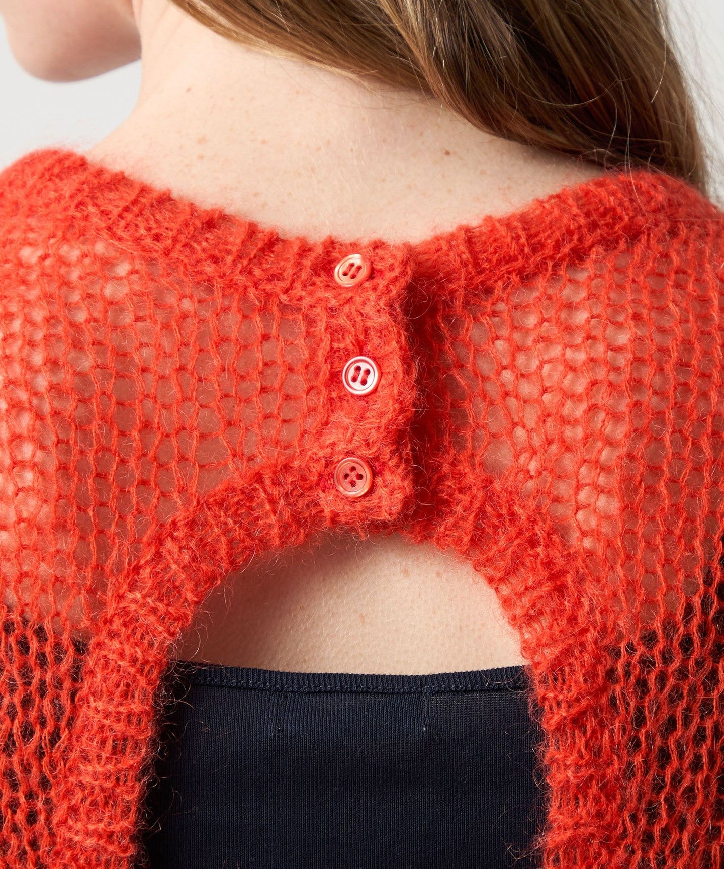 This piece is made of a mohair blend material that has a soft and fluffy texture, and the contrast of bright colors gives it a striking look.