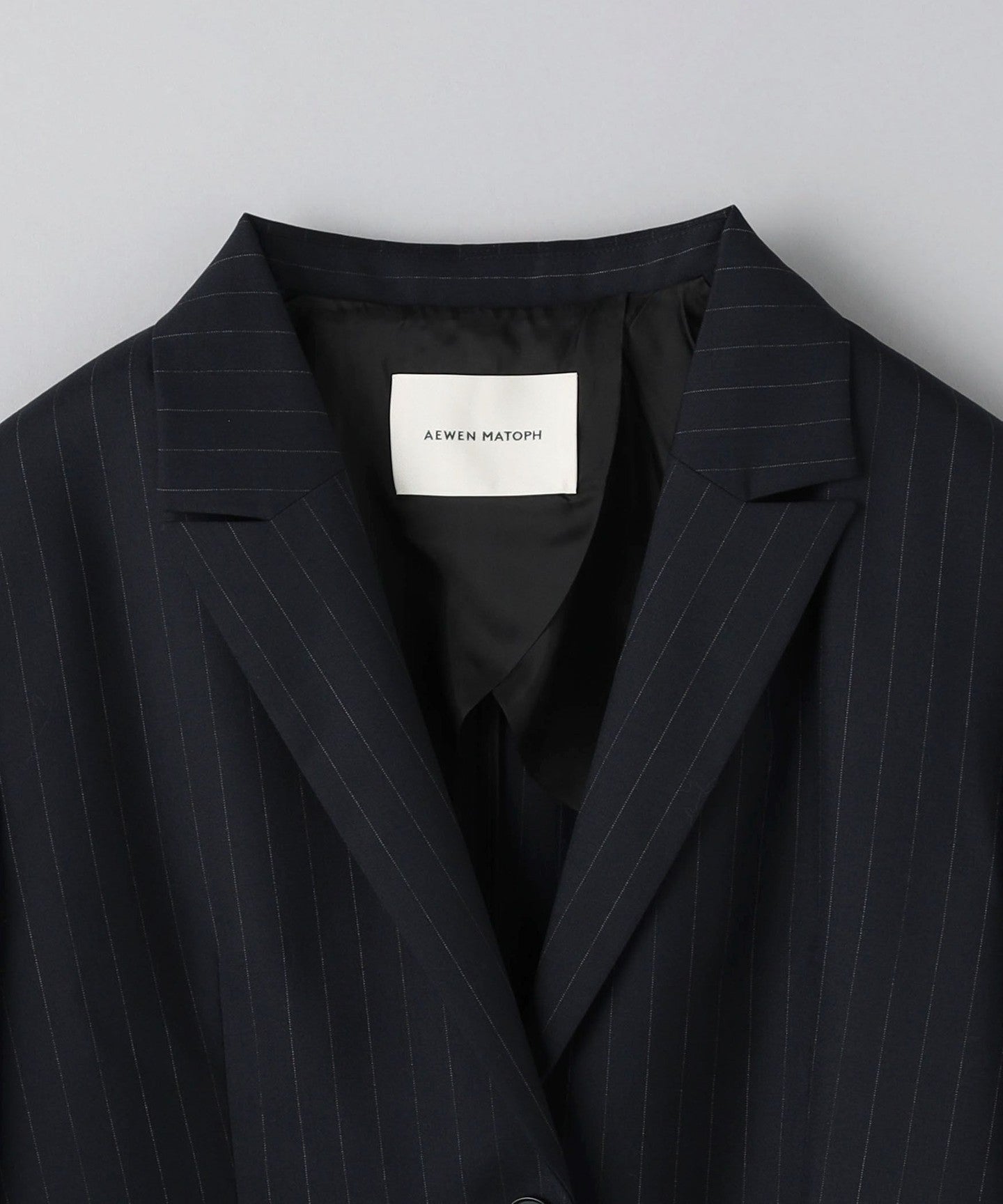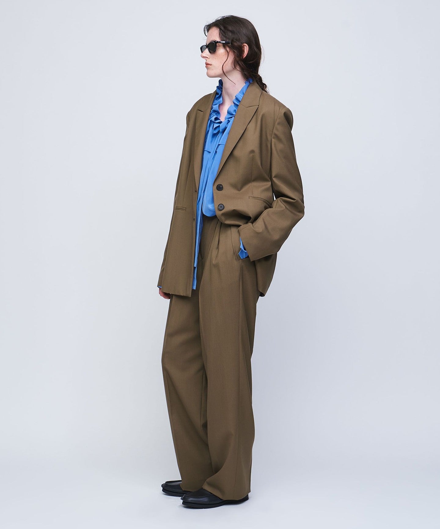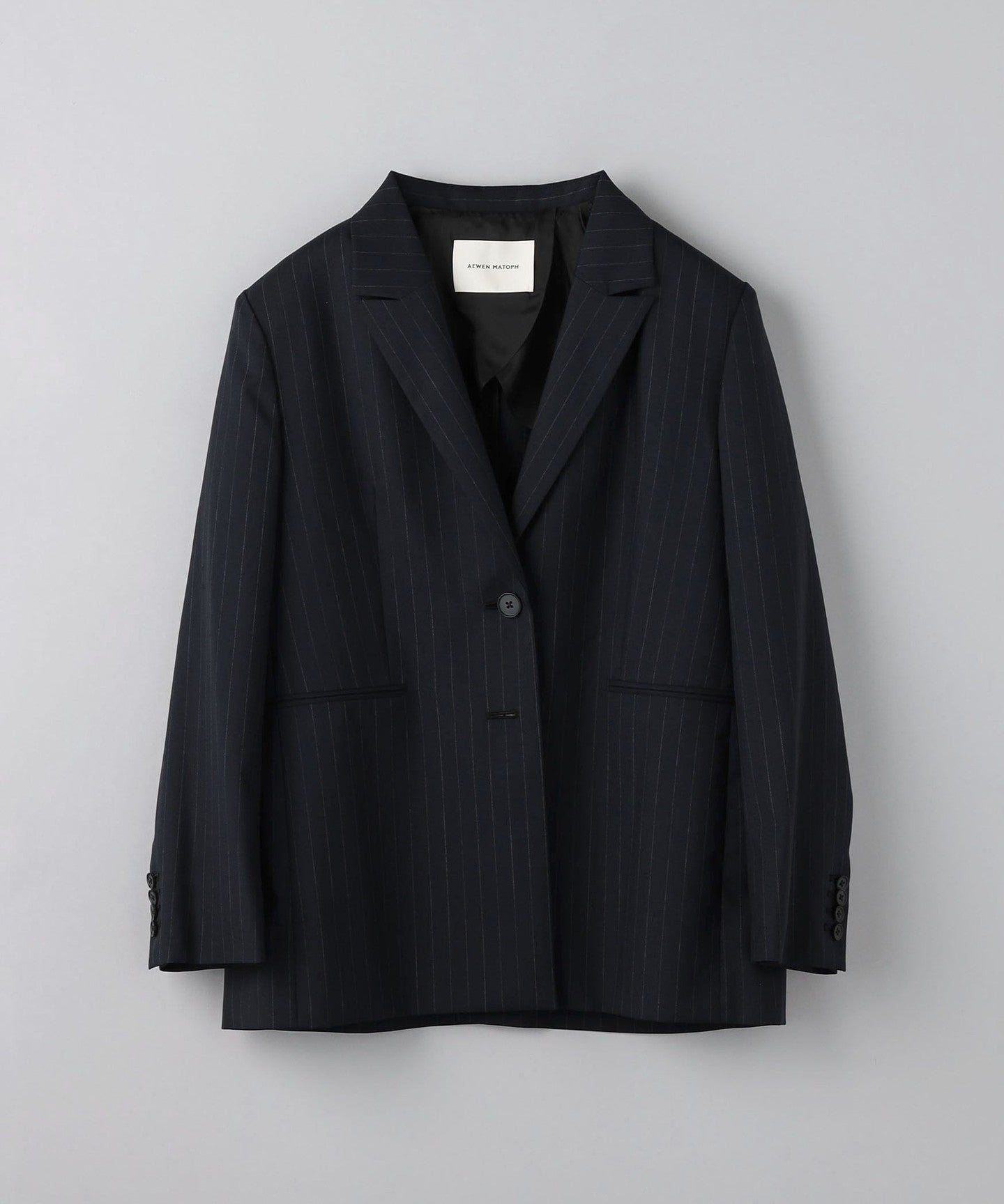 It features a masculine peak lapel and a fashionable wide silhouette.