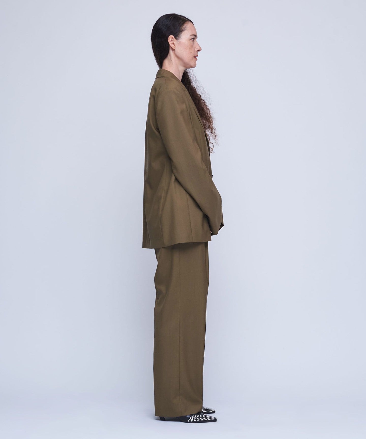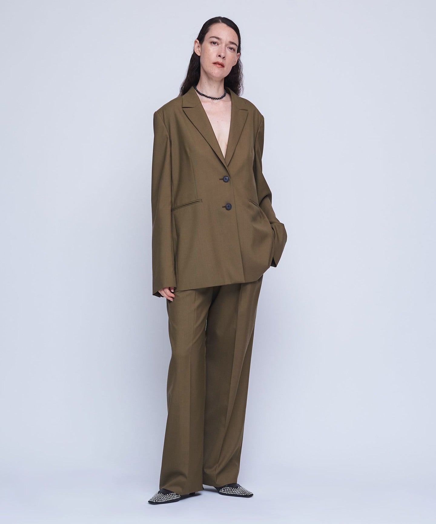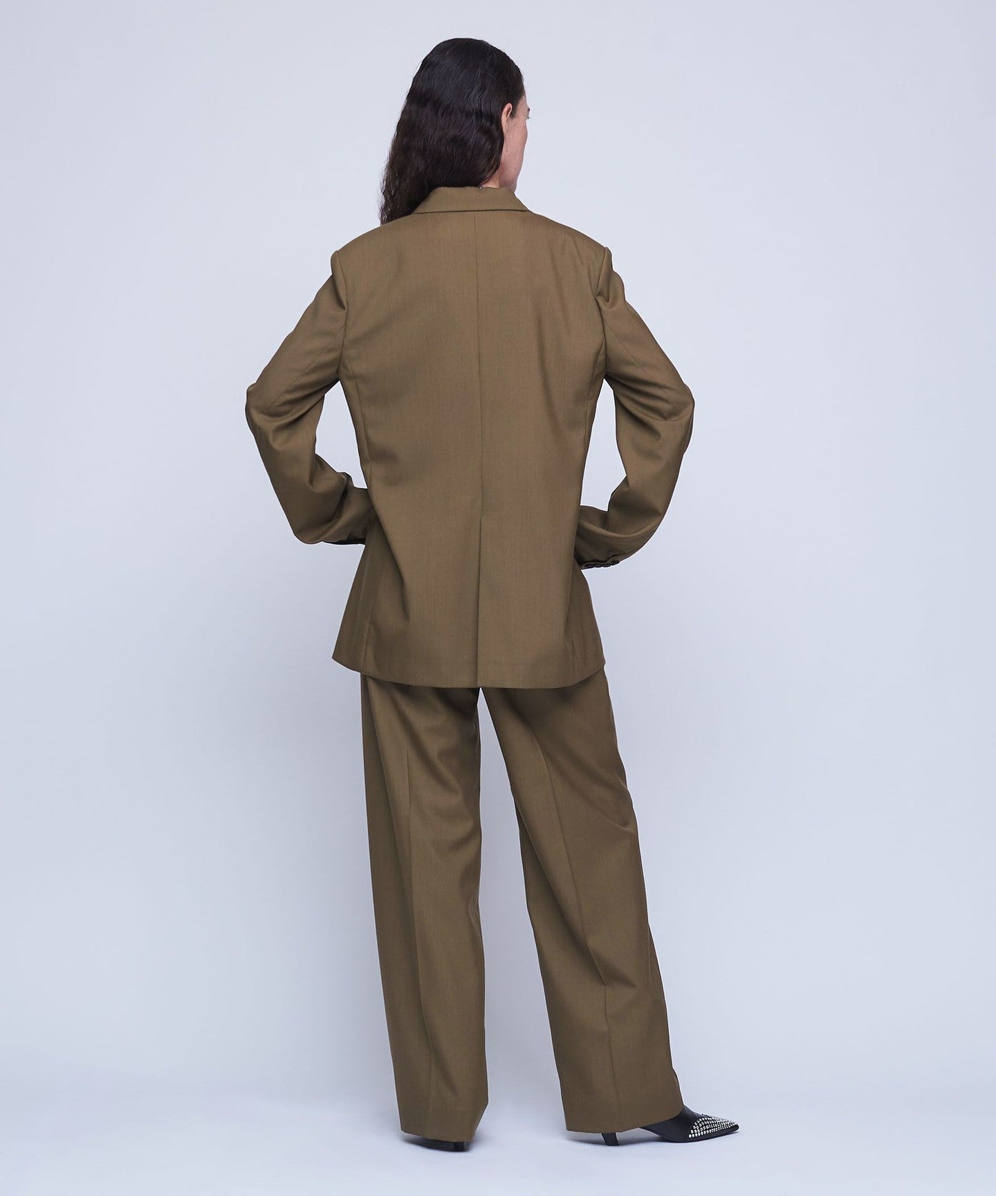 It features a masculine peak lapel and a fashionable wide silhouette.