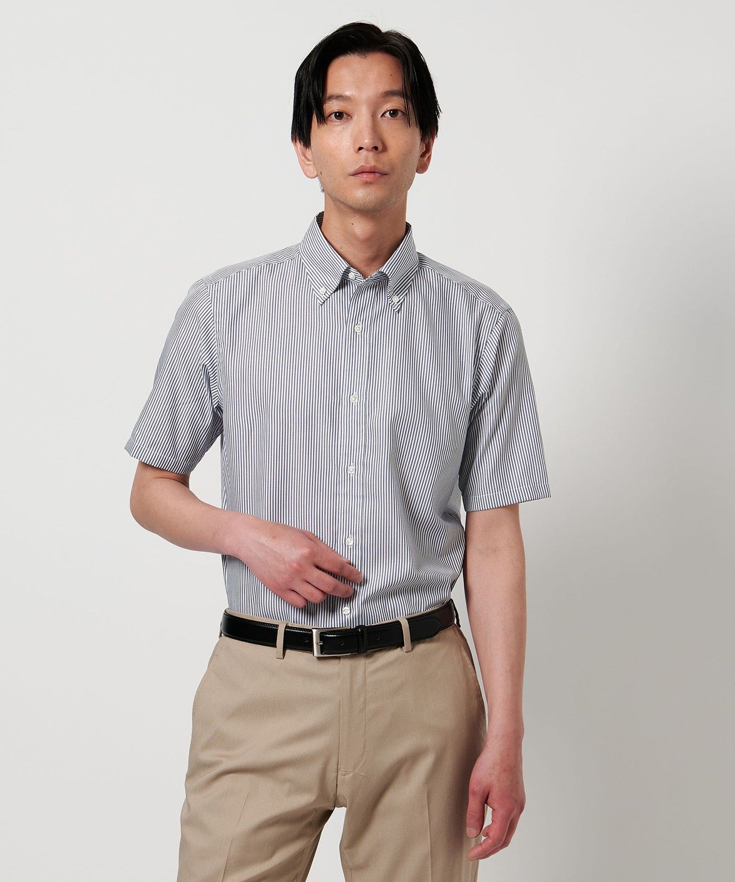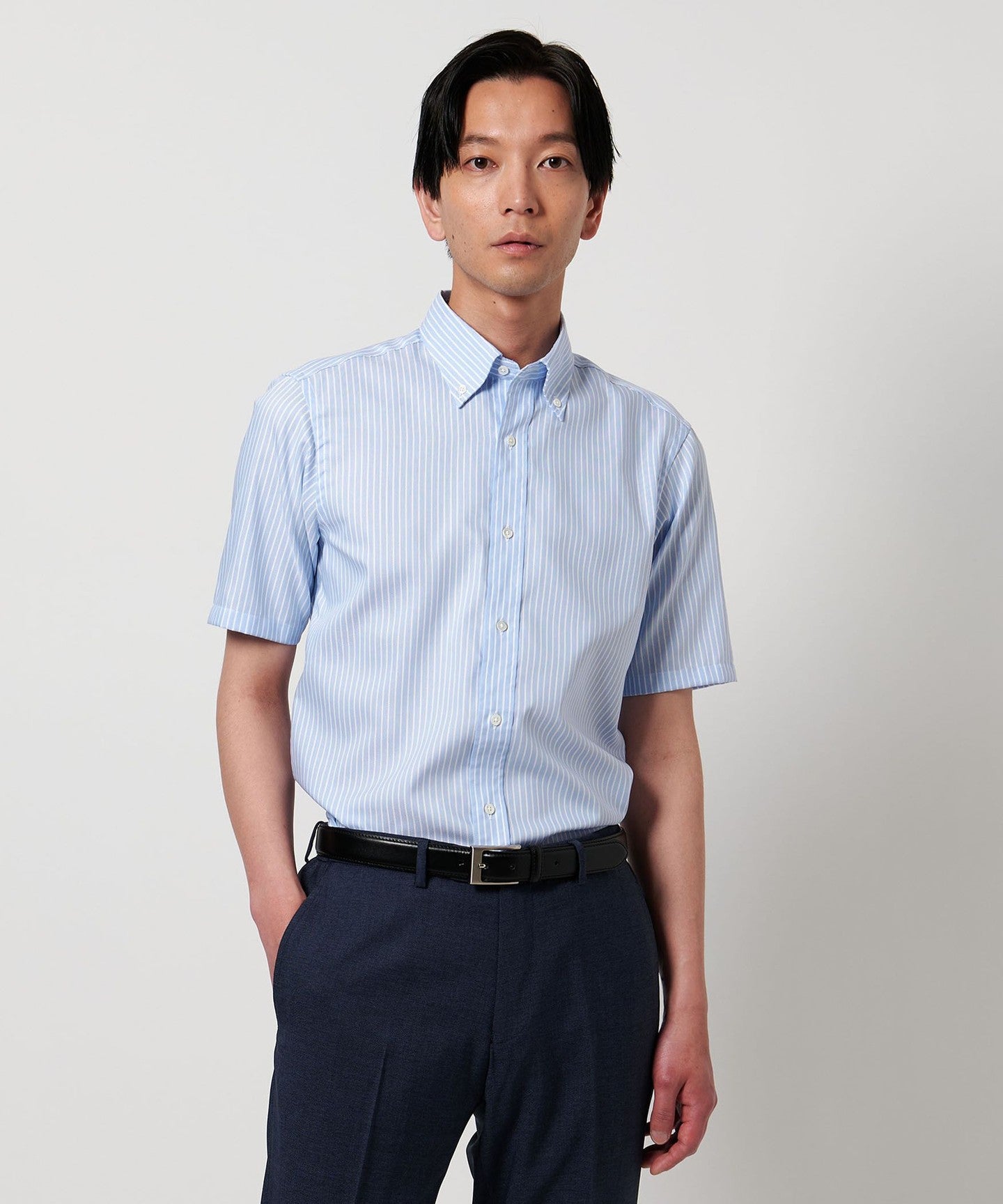 A short-sleeved shirt with a button-down collar that can be worn in a traditional style.