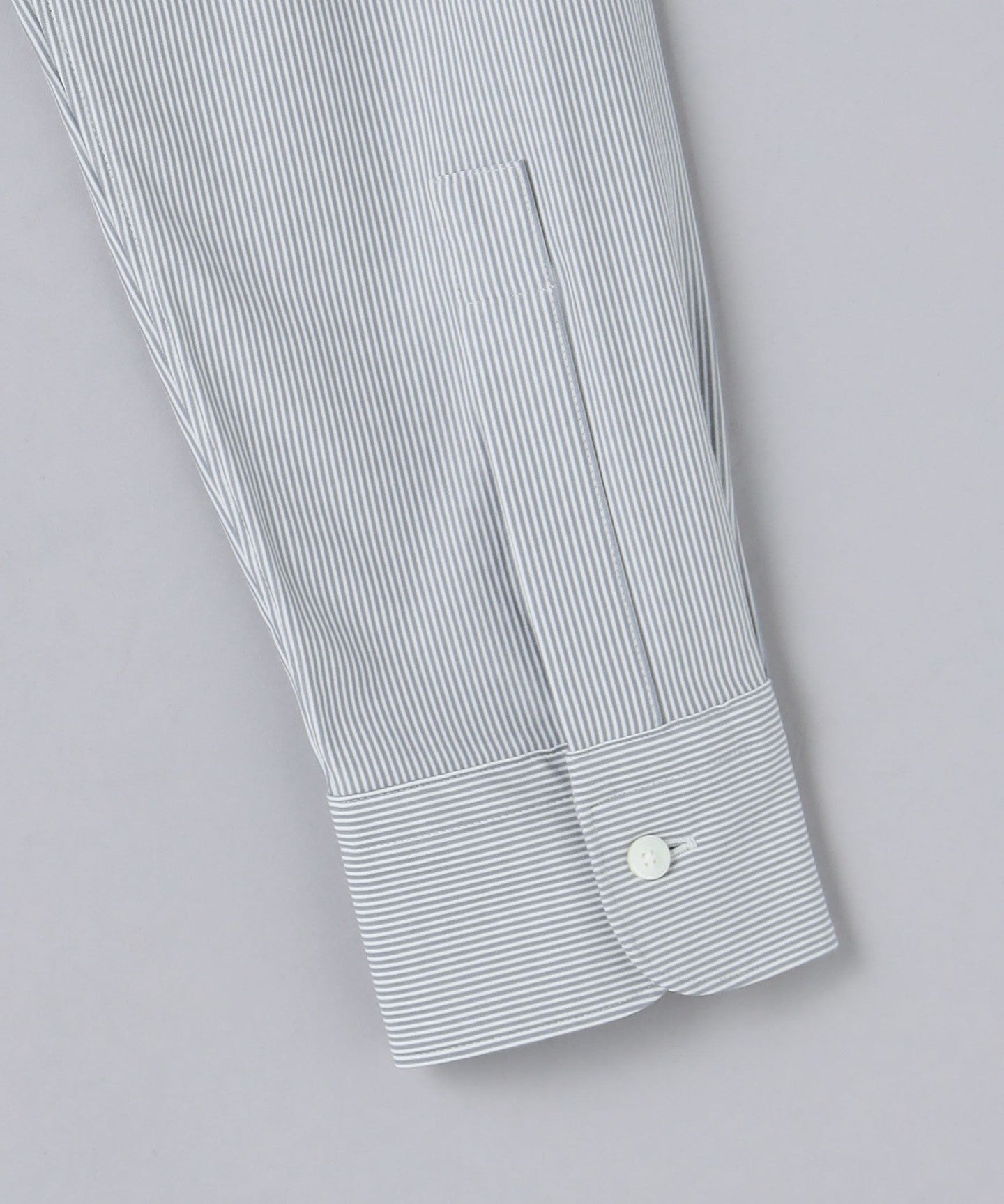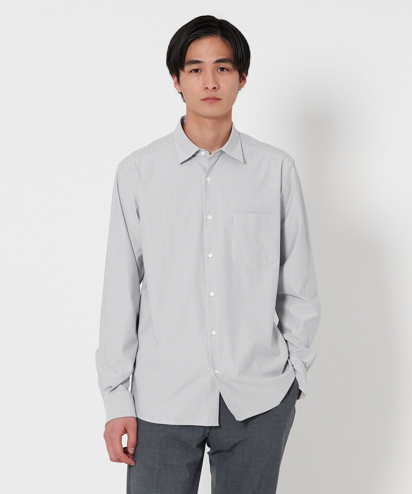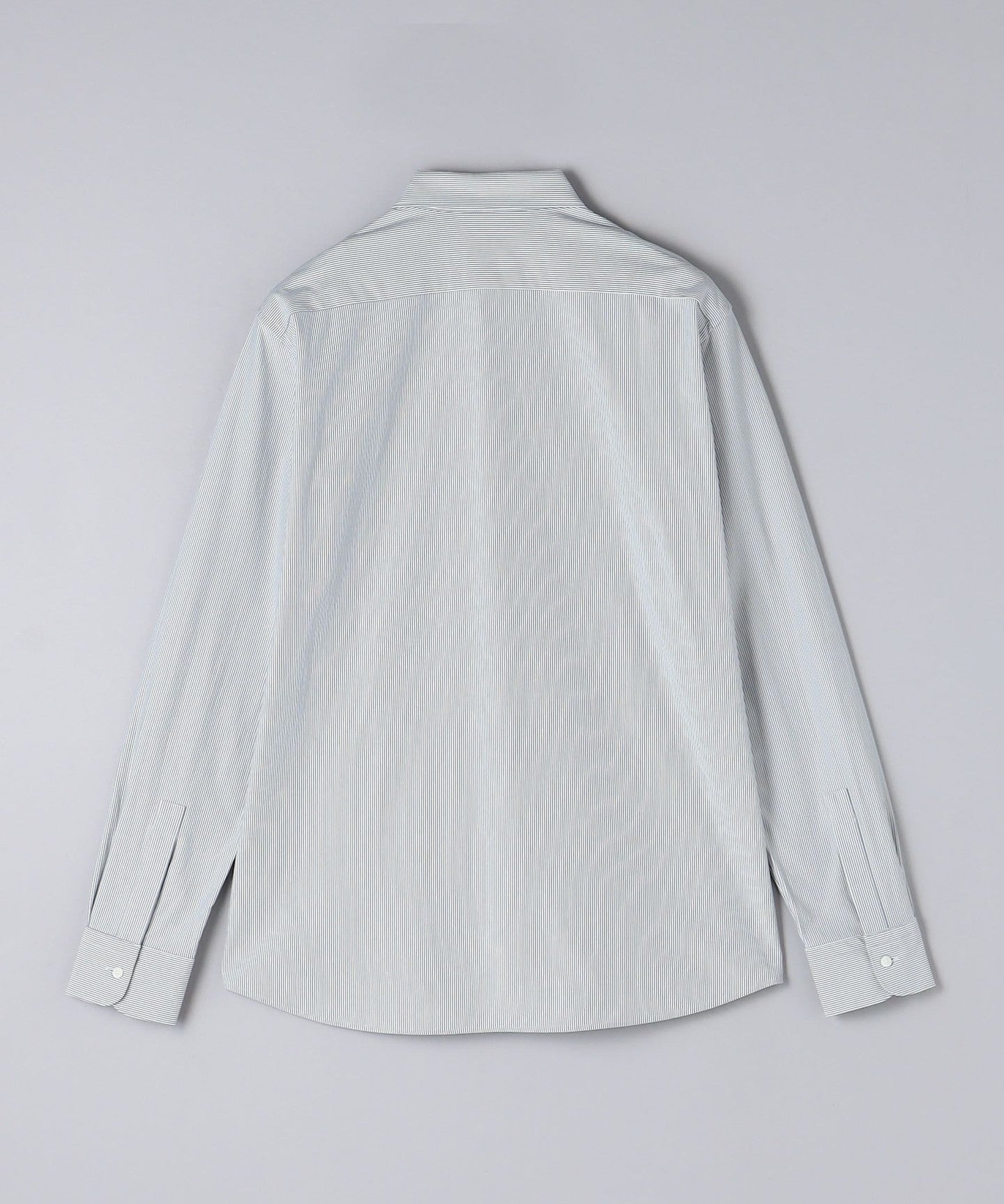 The length is mid-length and can be tucked in or out, and it features a slim width and sleeve circumference, and a moderately small, modern collar.