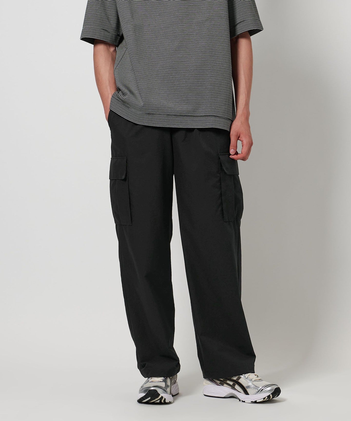 It has a slightly thick tapered silhouette with an elastic gathered waist.