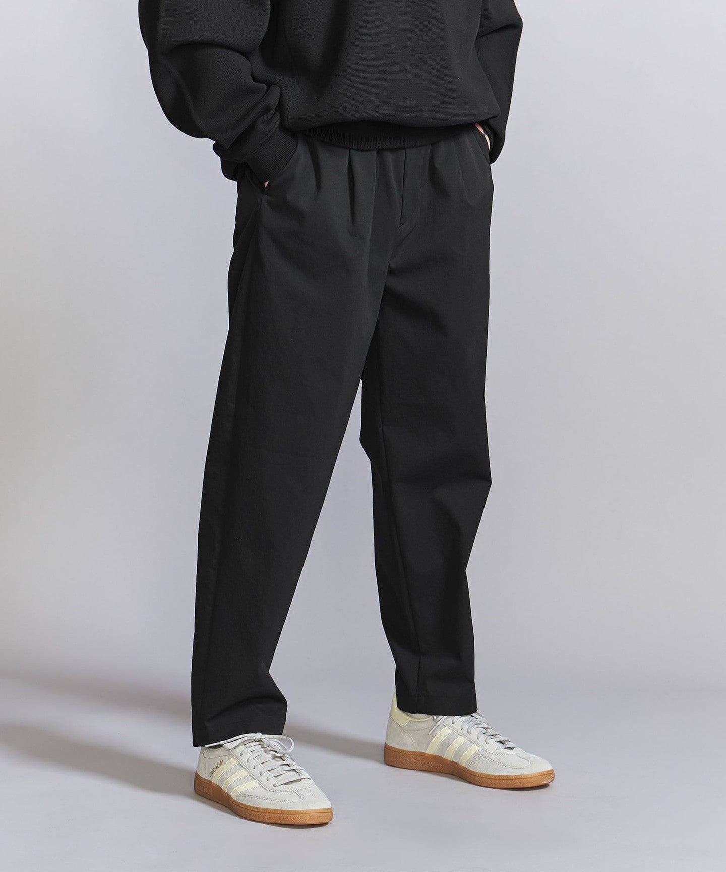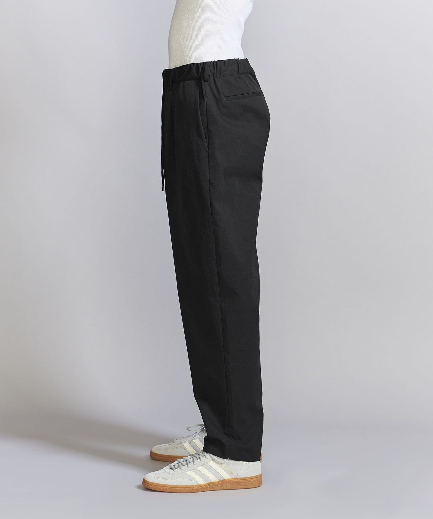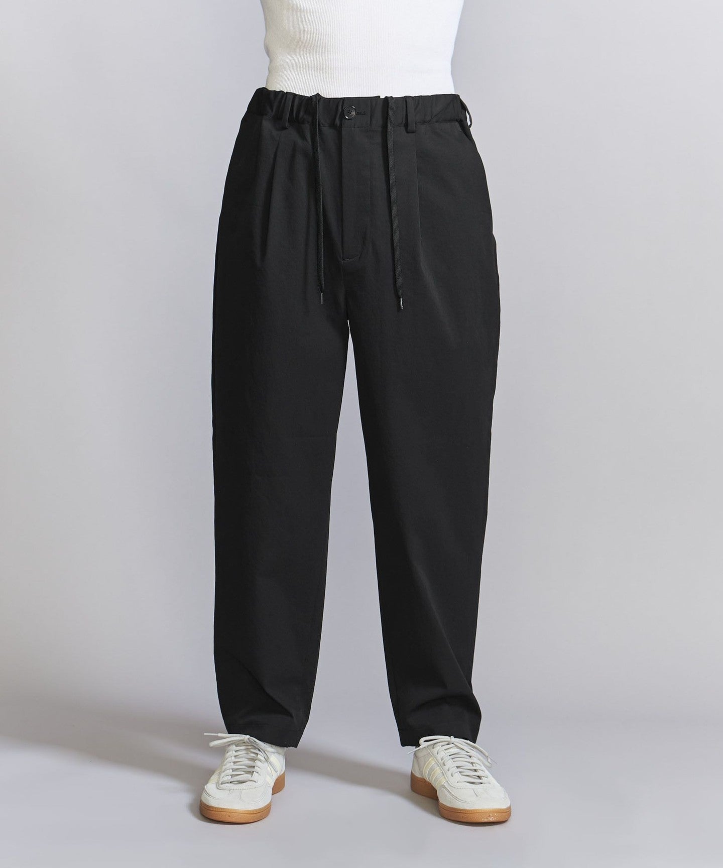 The pants have a moderately tapered line towards the hem, creating a neat silhouette that is not too loose overall.