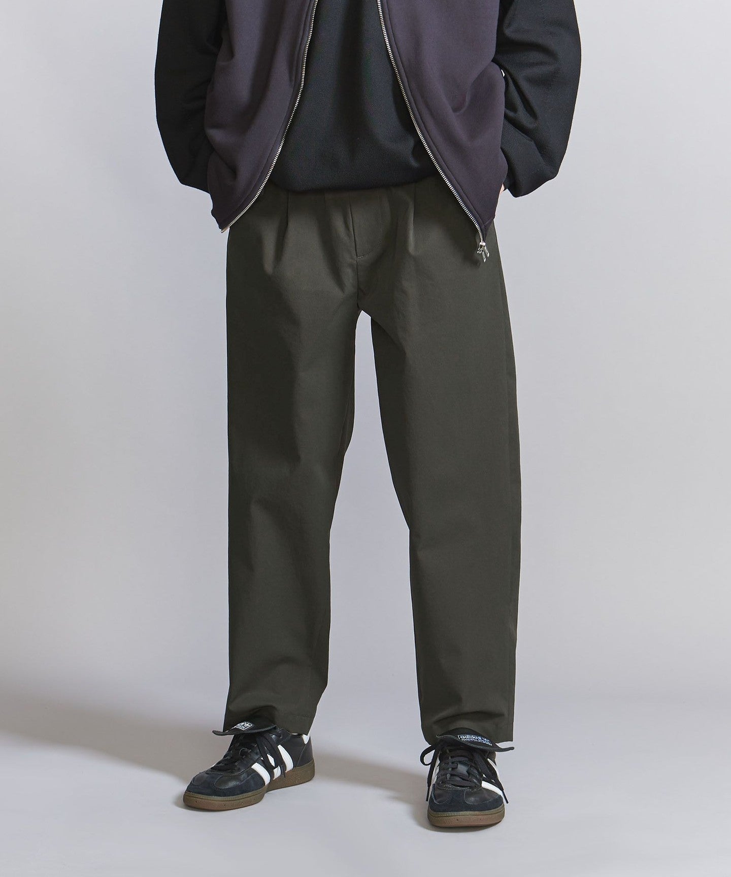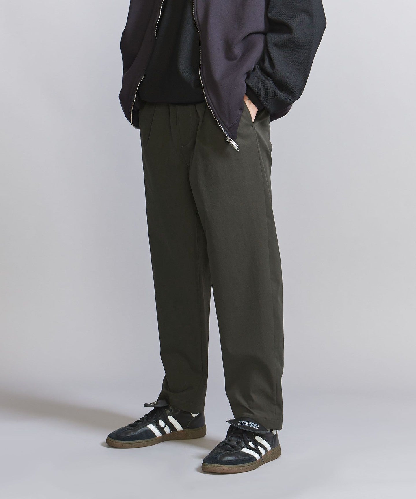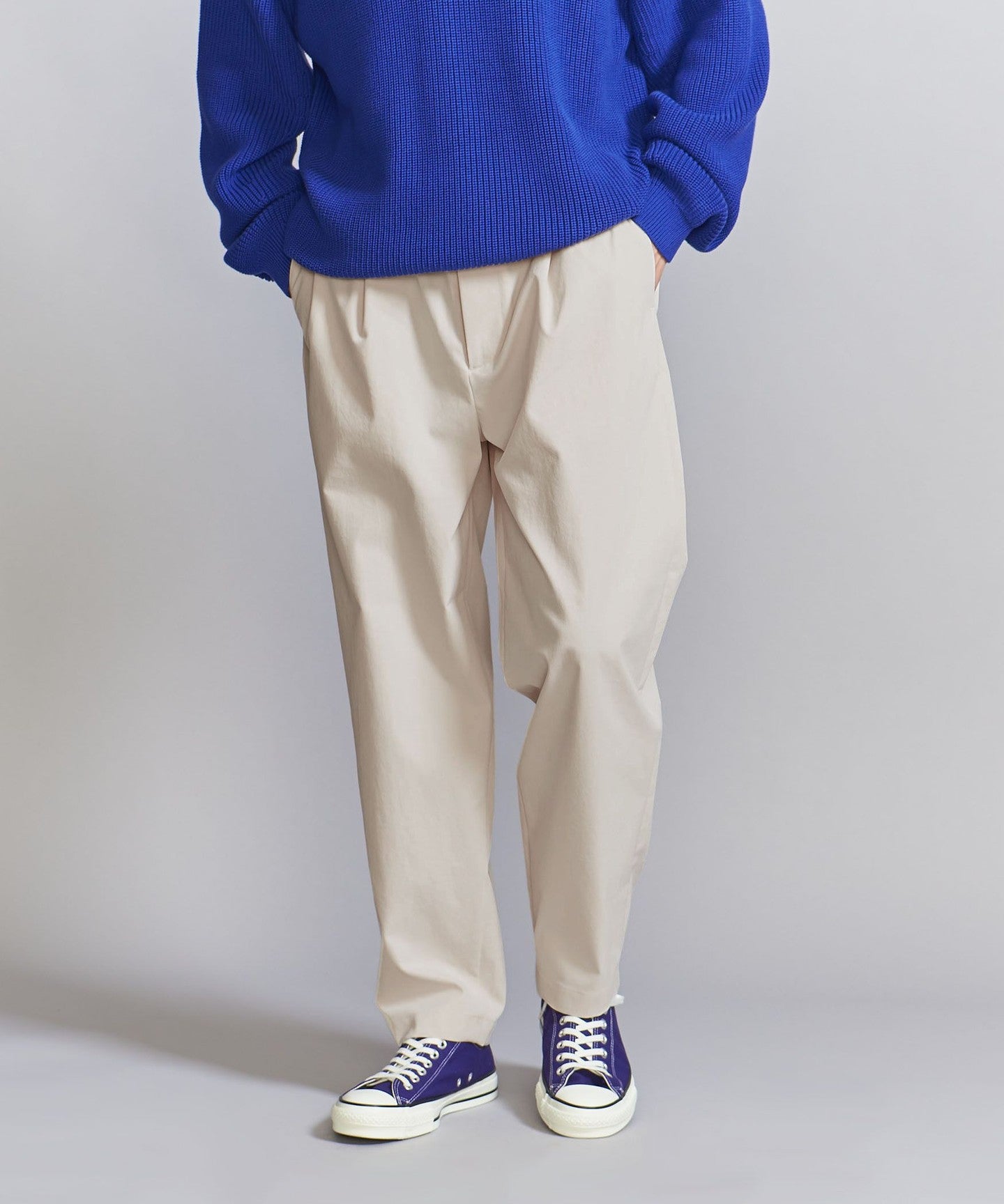 The pants have a moderately tapered line towards the hem, creating a neat silhouette that is not too loose overall.