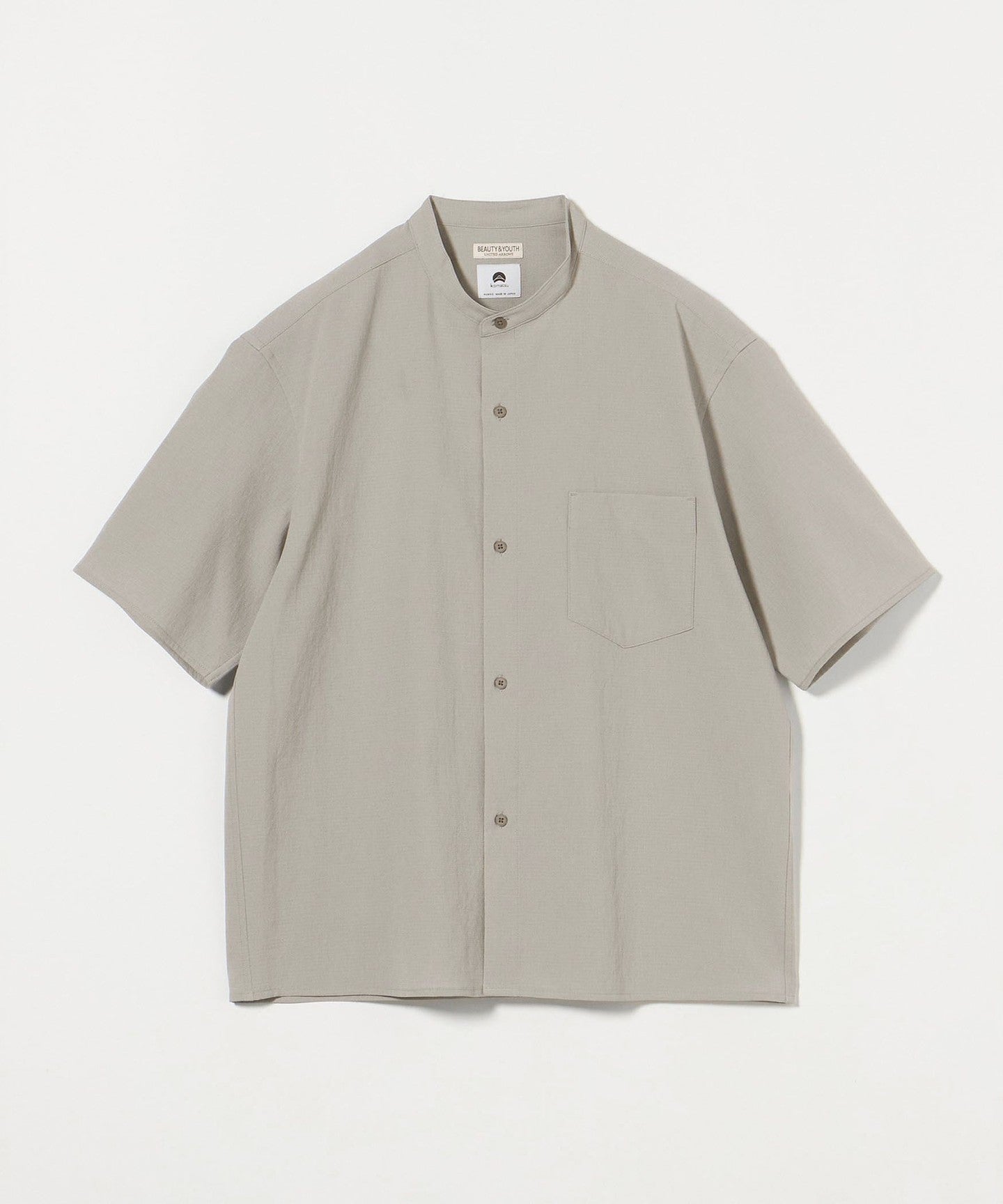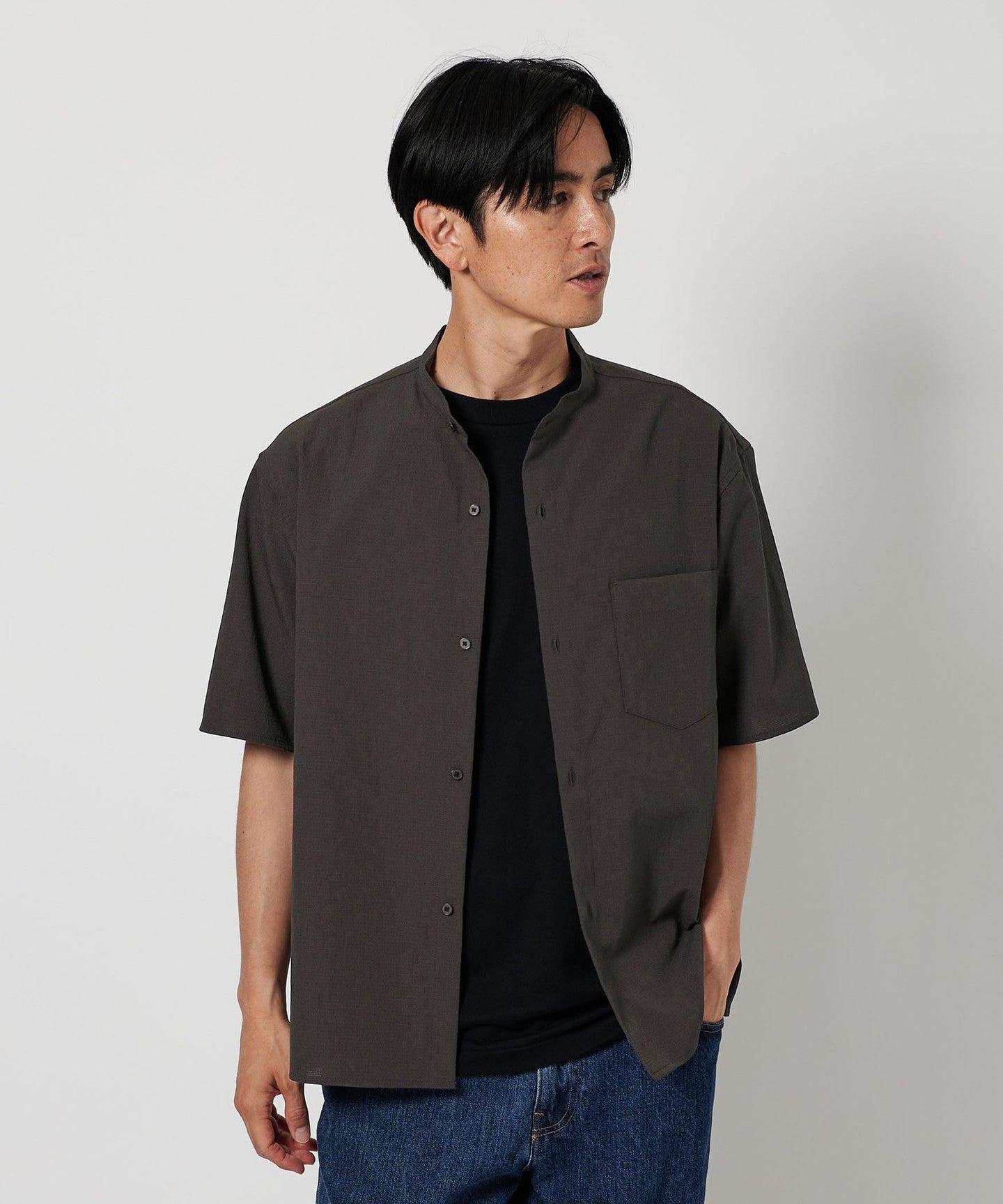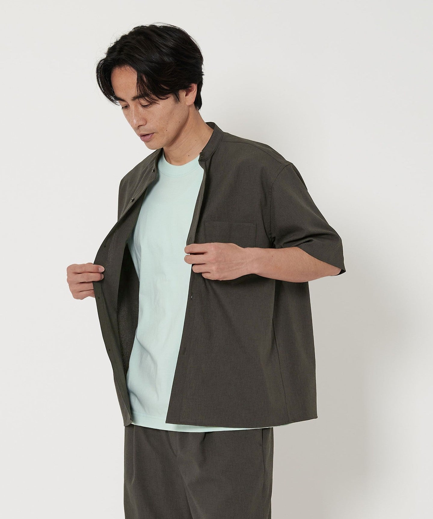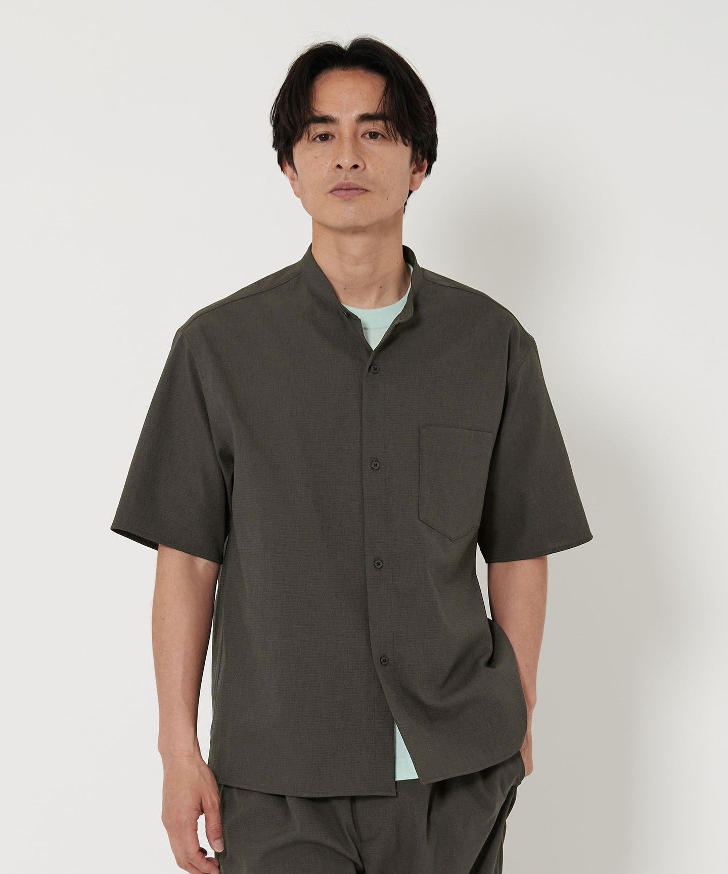 A boxy silhouette short-sleeved band collar shirt that looks great on its own.