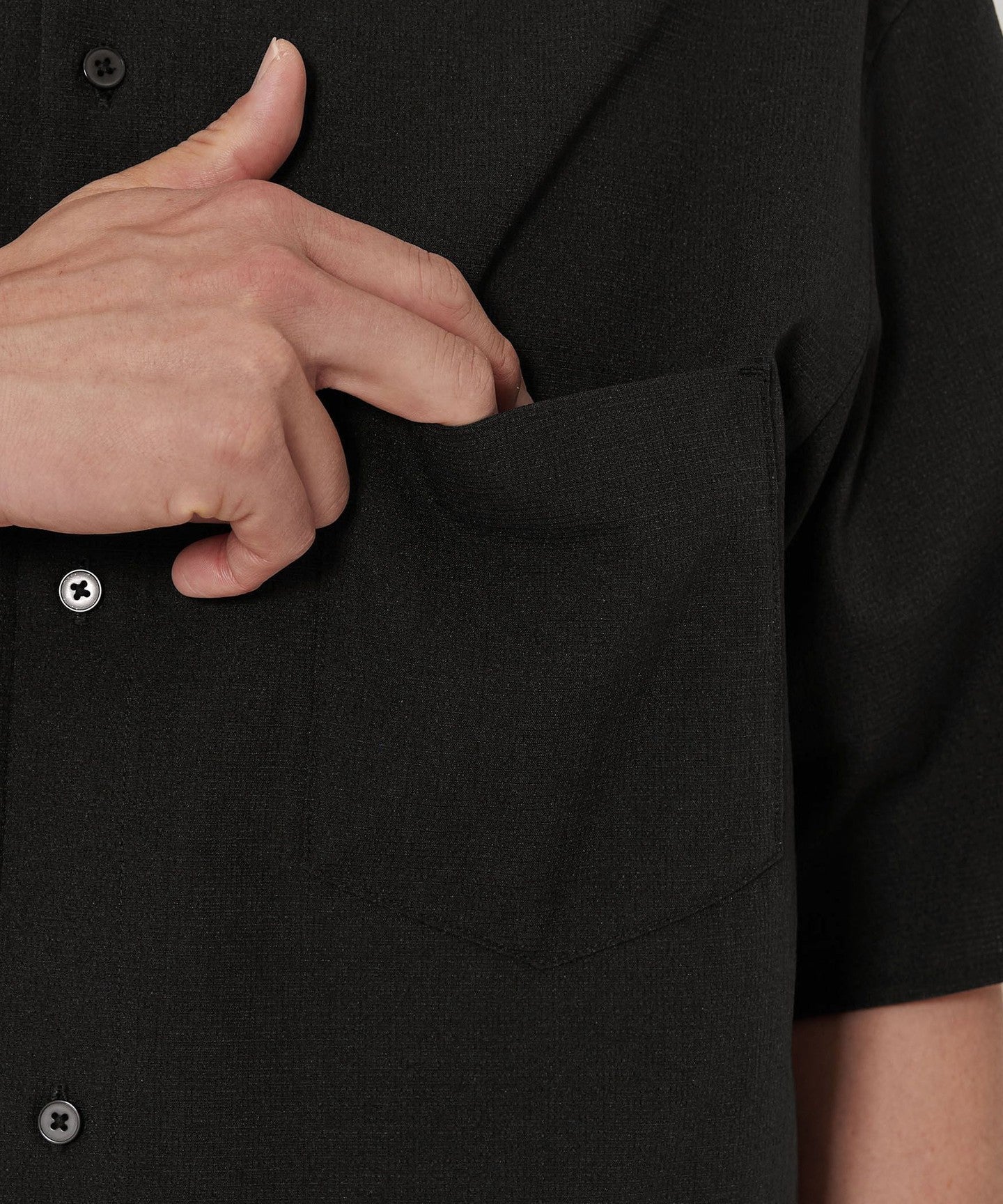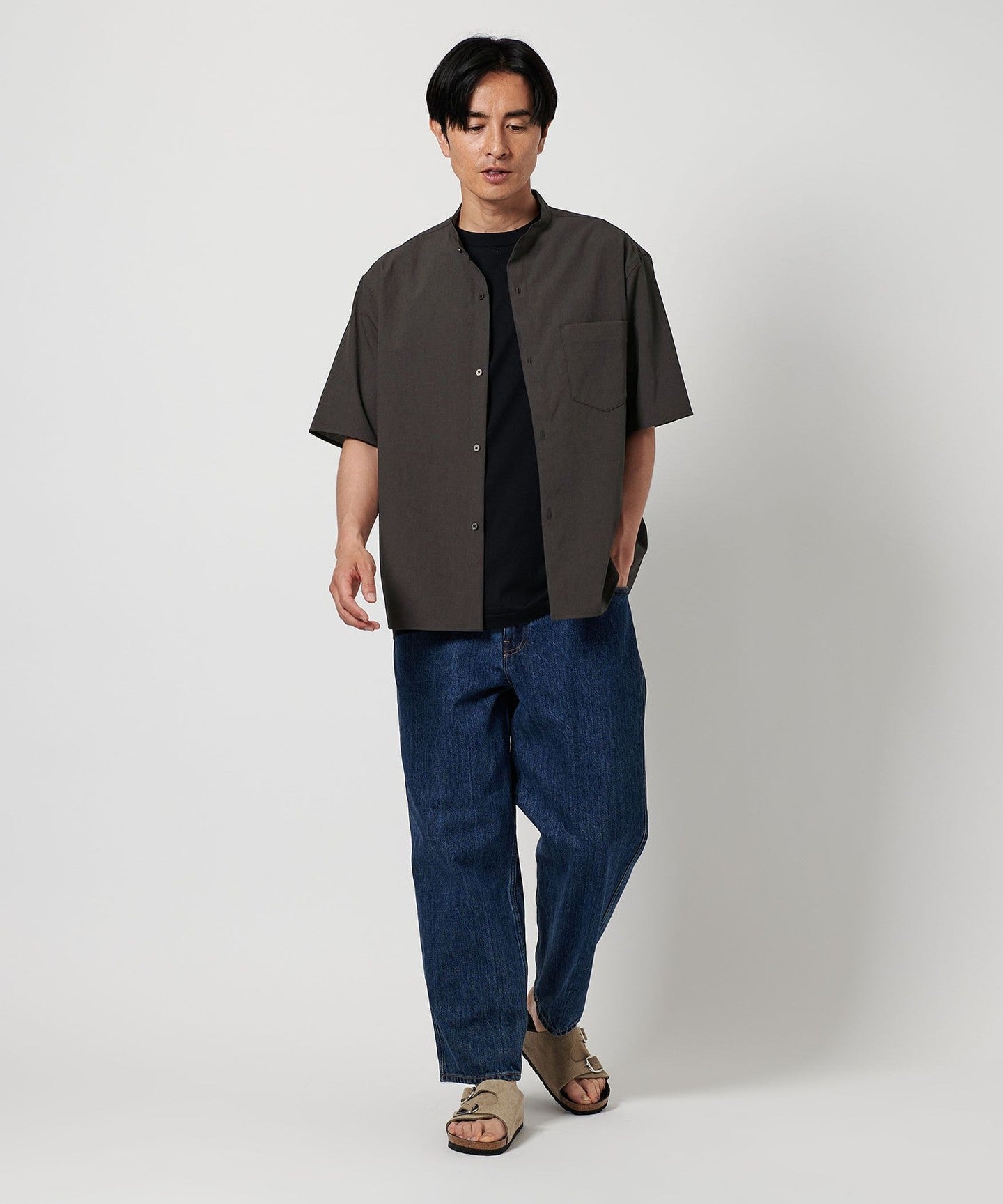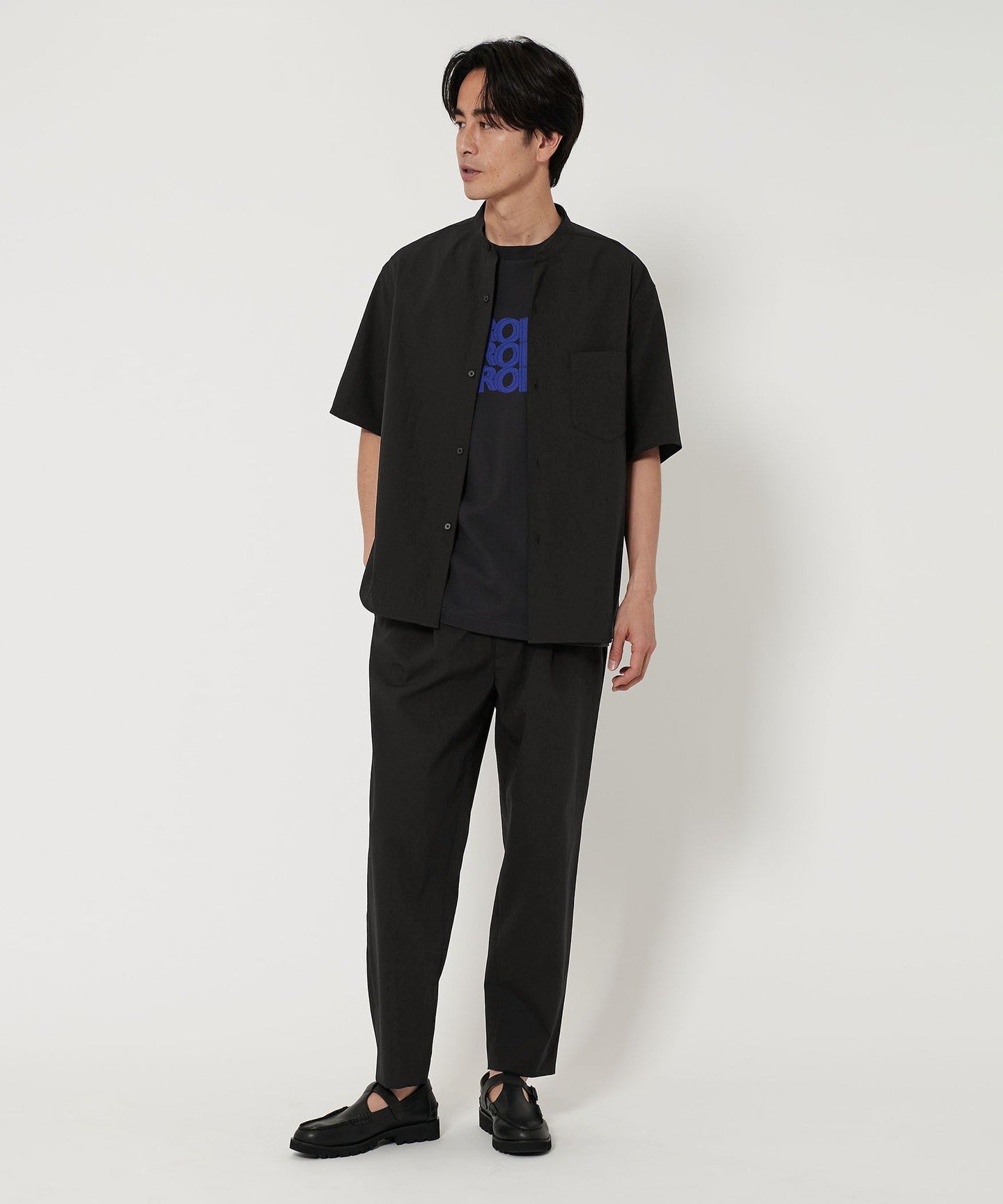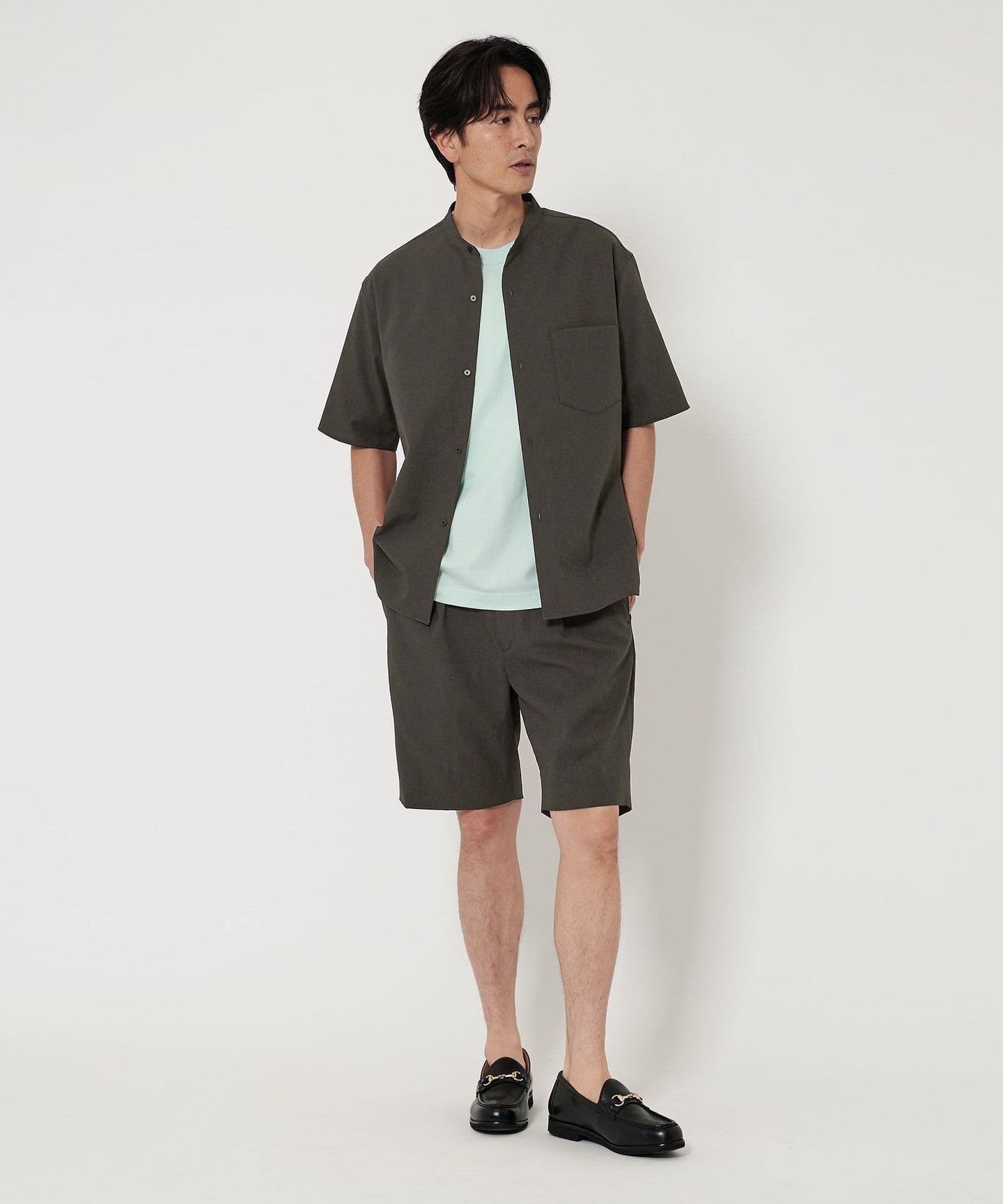A boxy silhouette short-sleeved band collar shirt that looks great on its own.