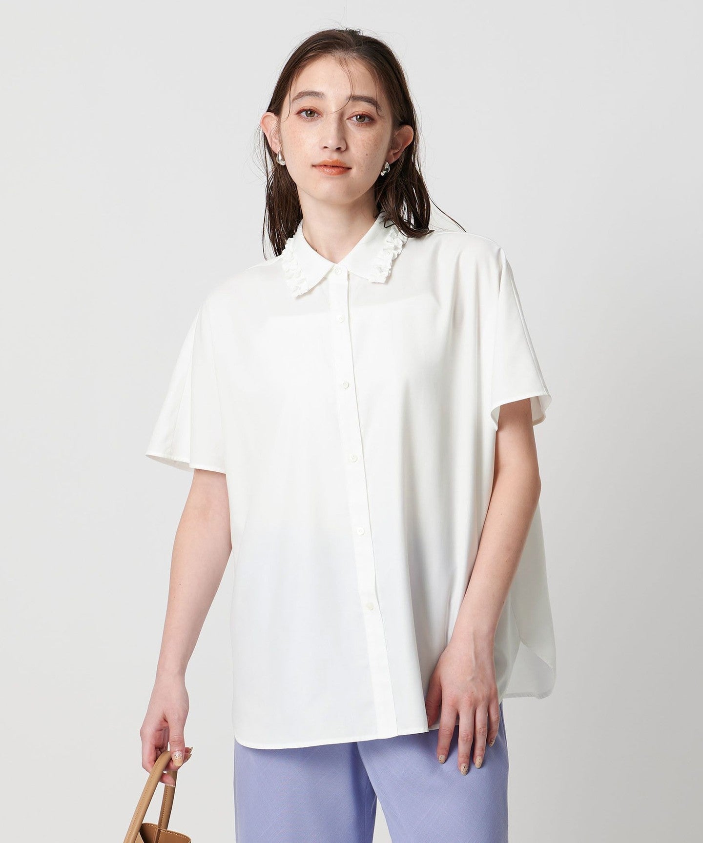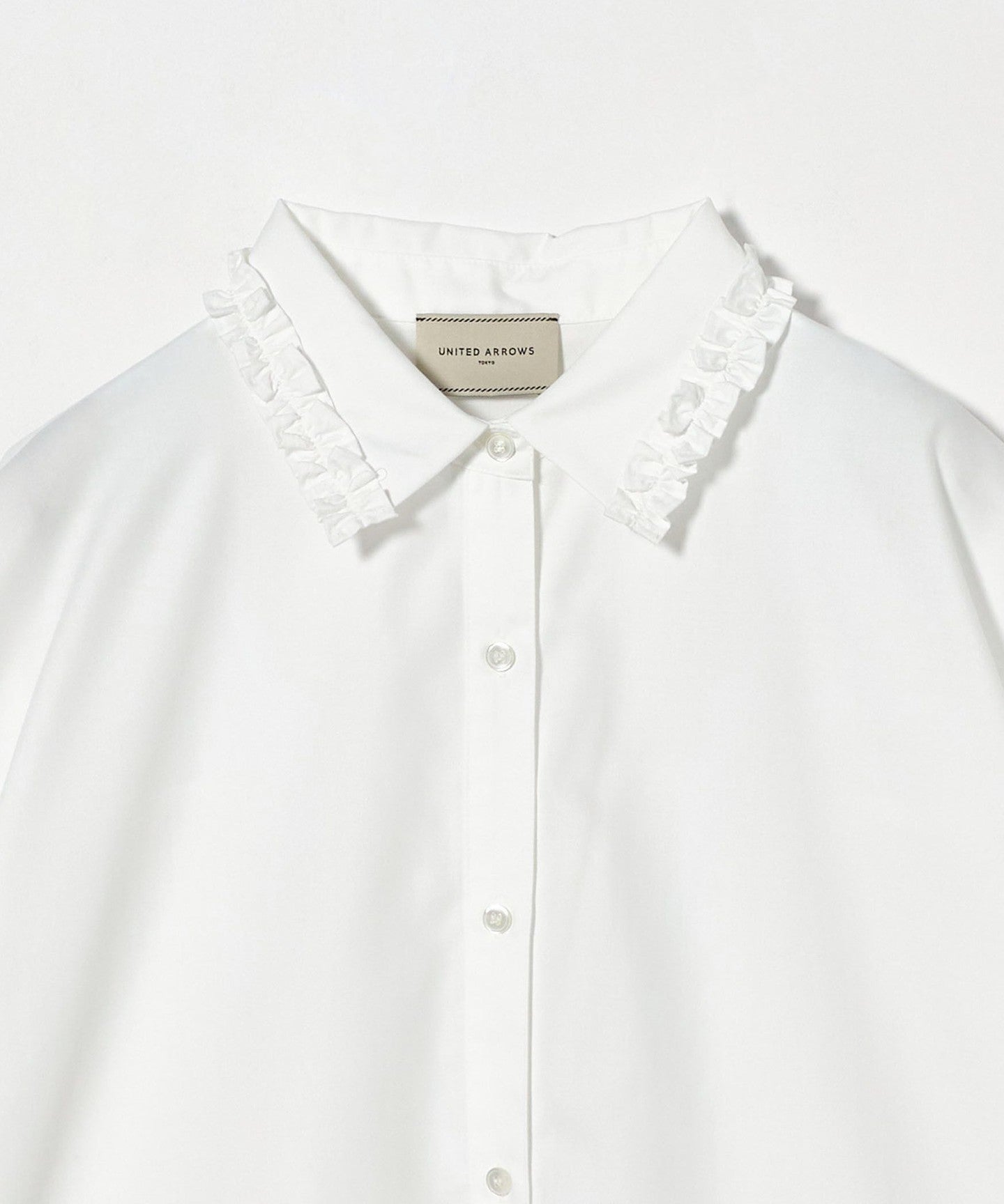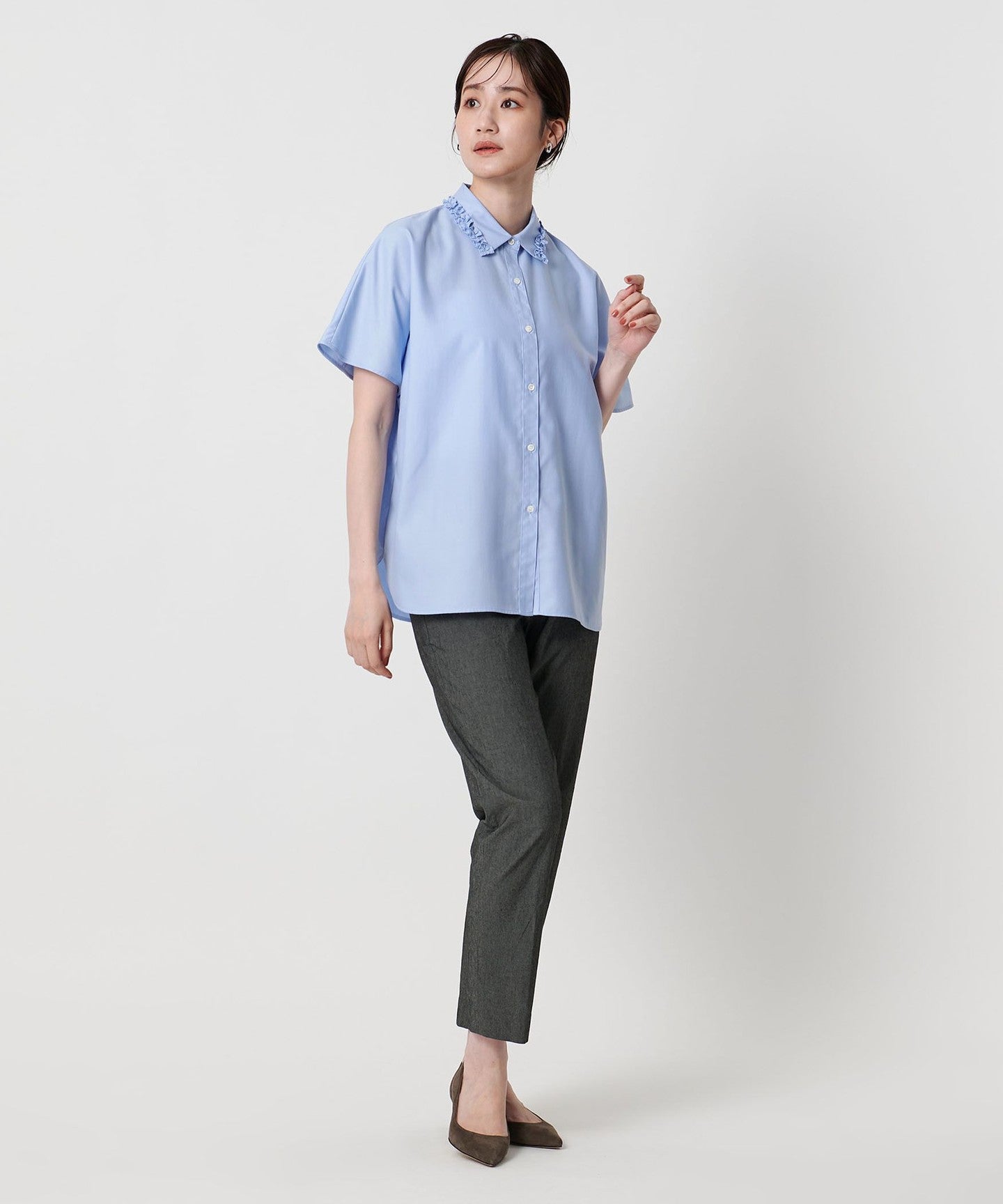 A shirt blouse with a gorgeous mini ruffle at the collar.