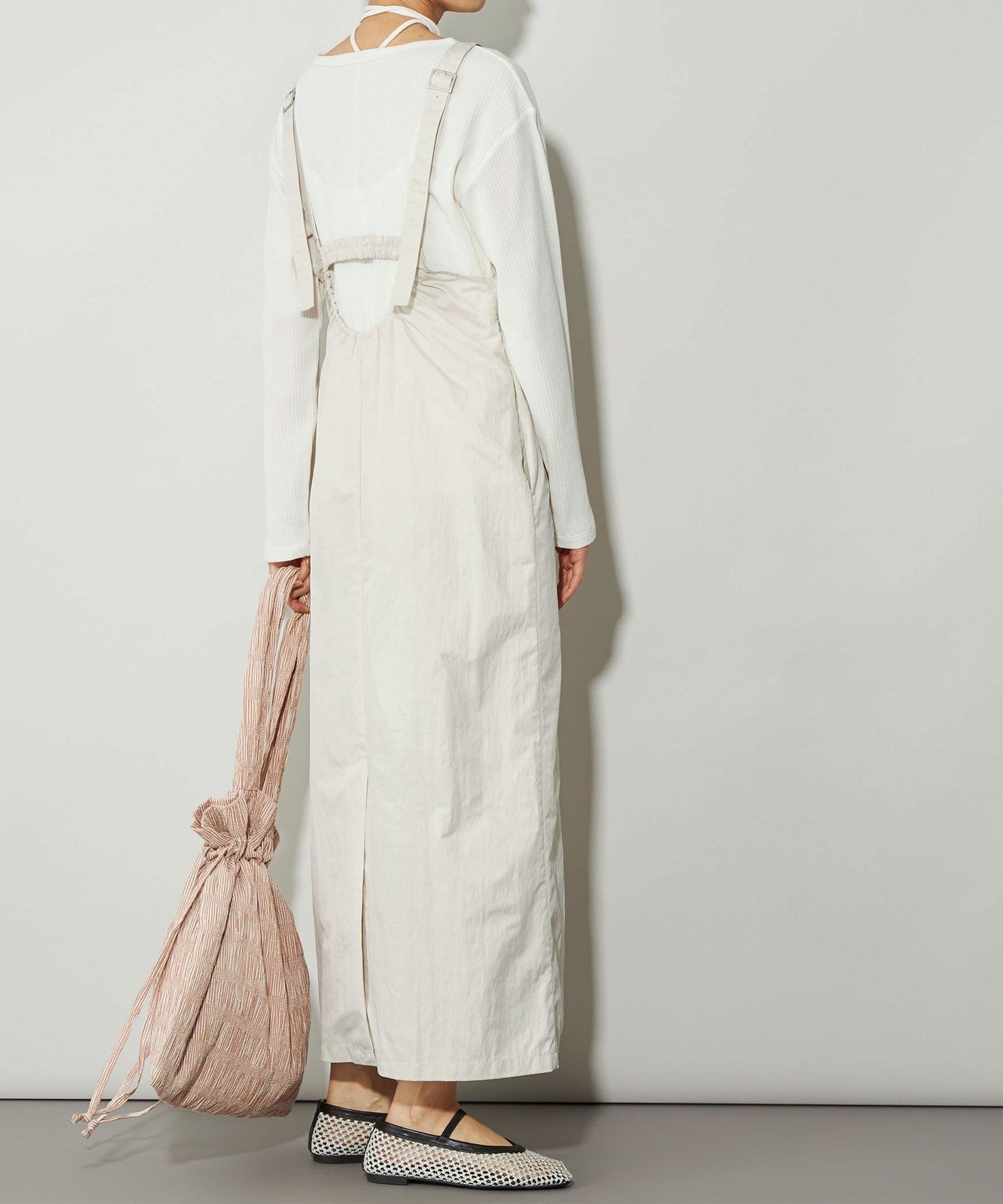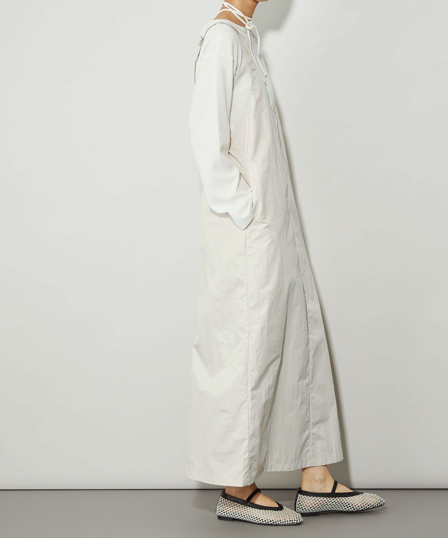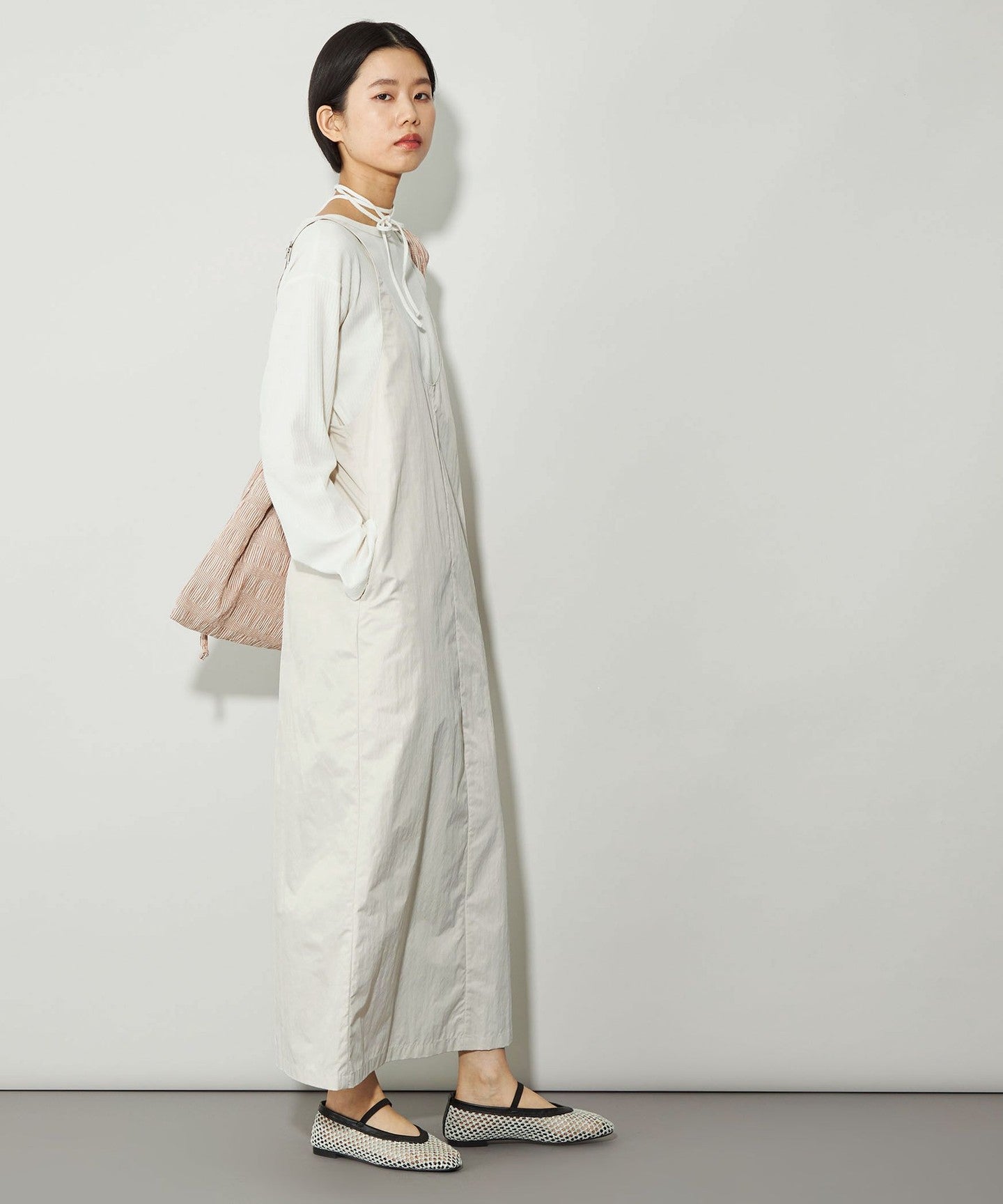 The fabric is a slightly crinkly nylon blend that gives it a casual feel, and has a firm texture that does not cling to the body.