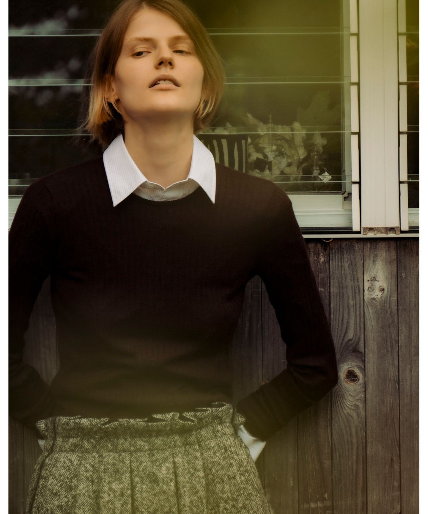 A crew neck knit with a popular wide rib knit design.
