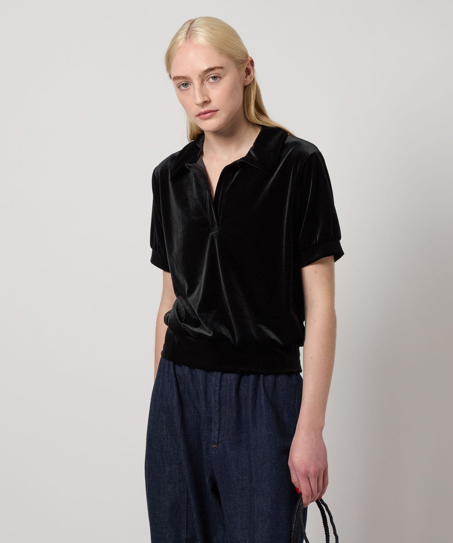 A cut-and-sew top made from velour fabric, which has an elegant sheen.