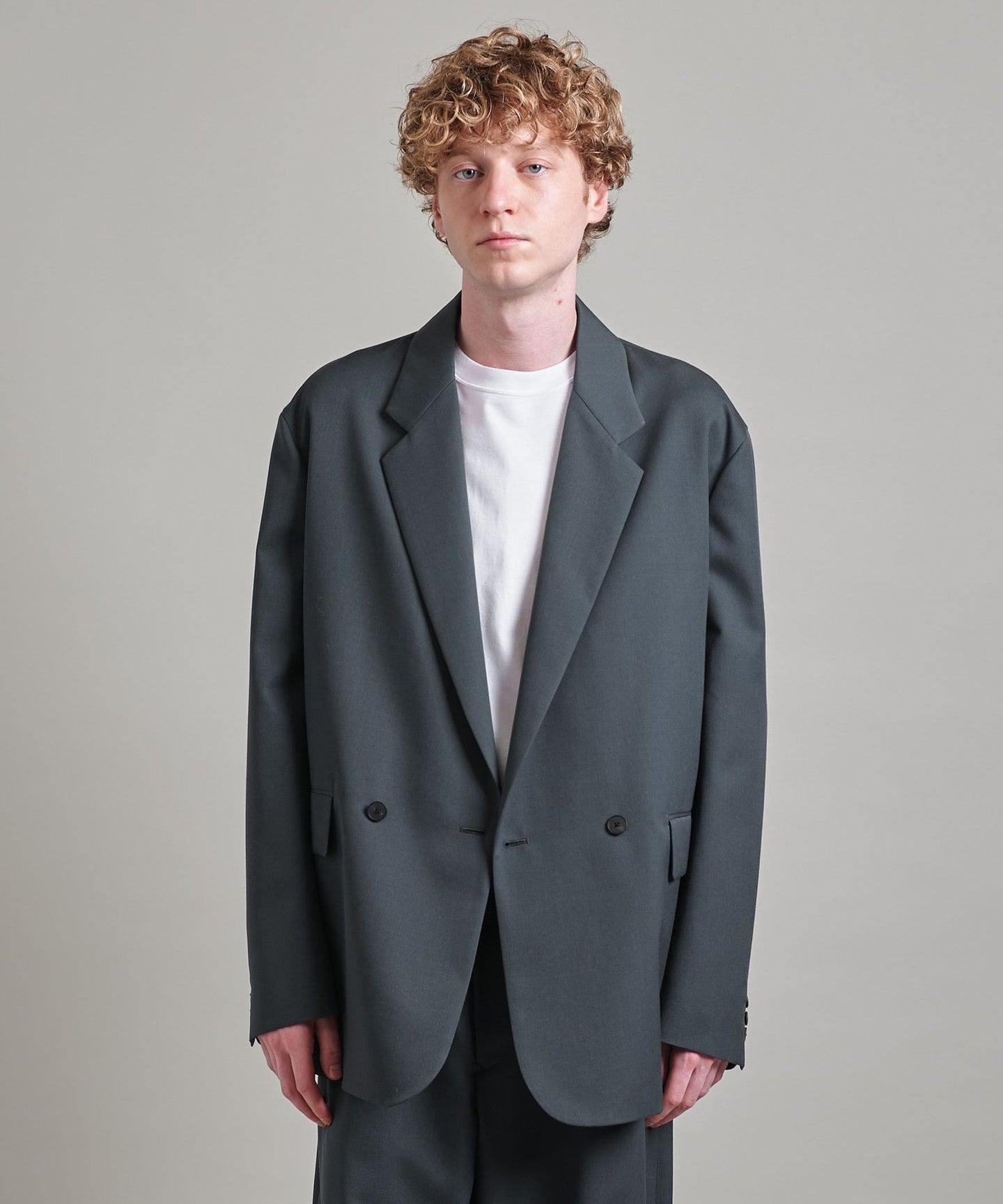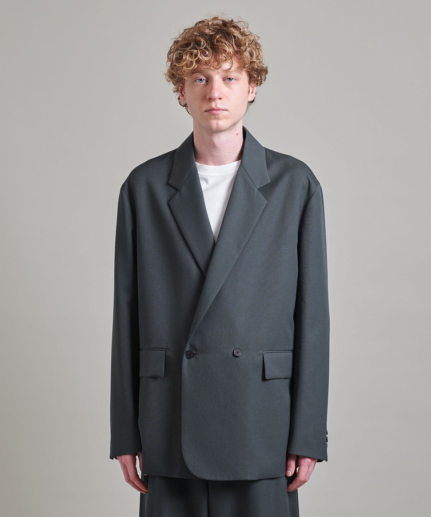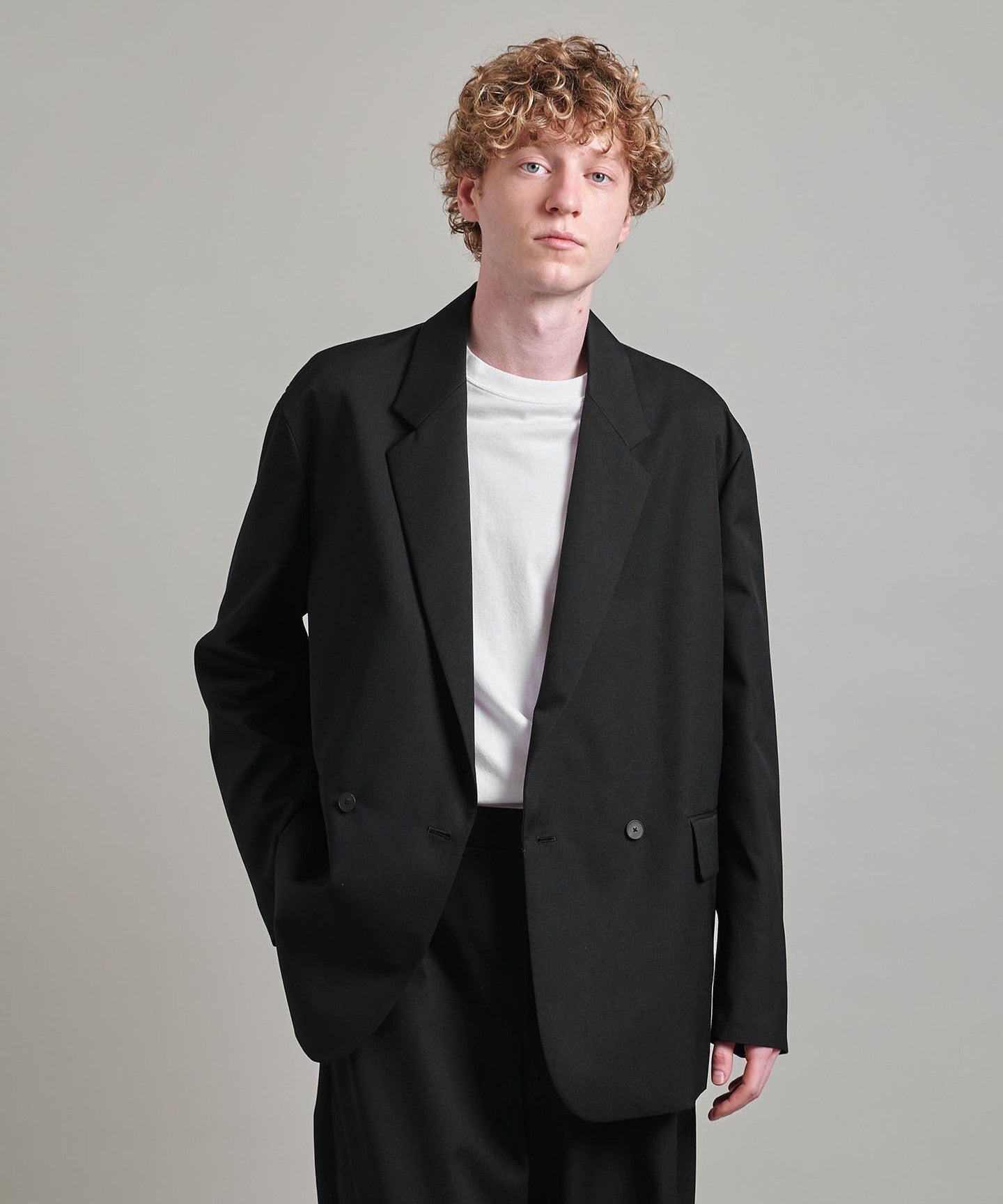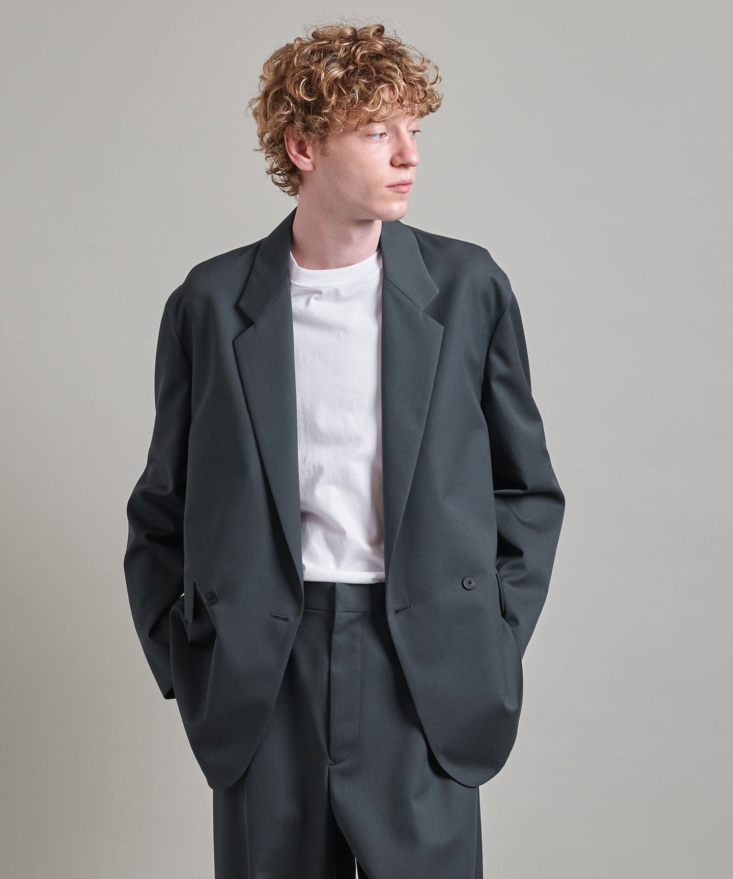 The jacket has a double front and a loose, boxy silhouette, giving it a relaxed yet sharp impression without being too stiff.