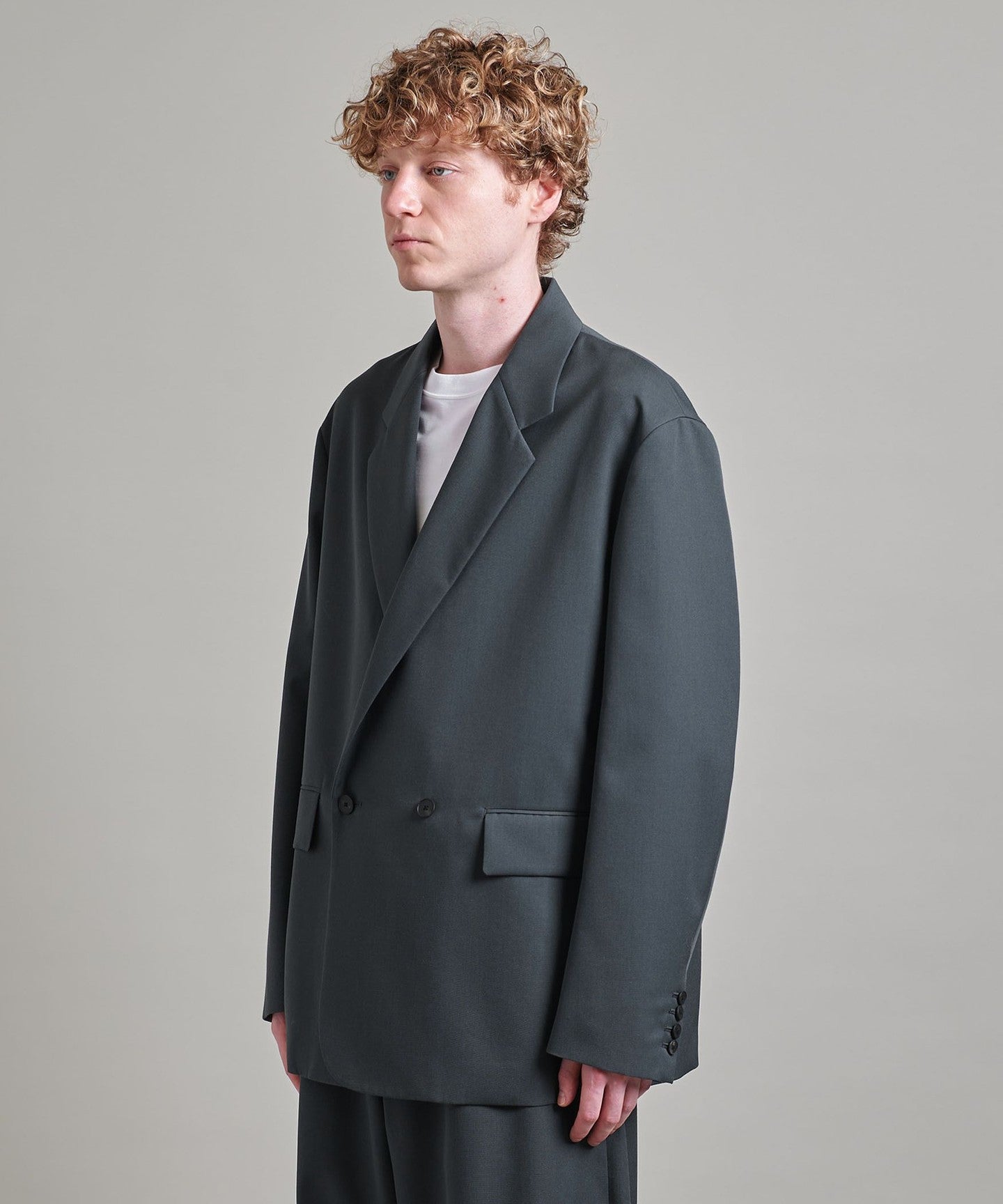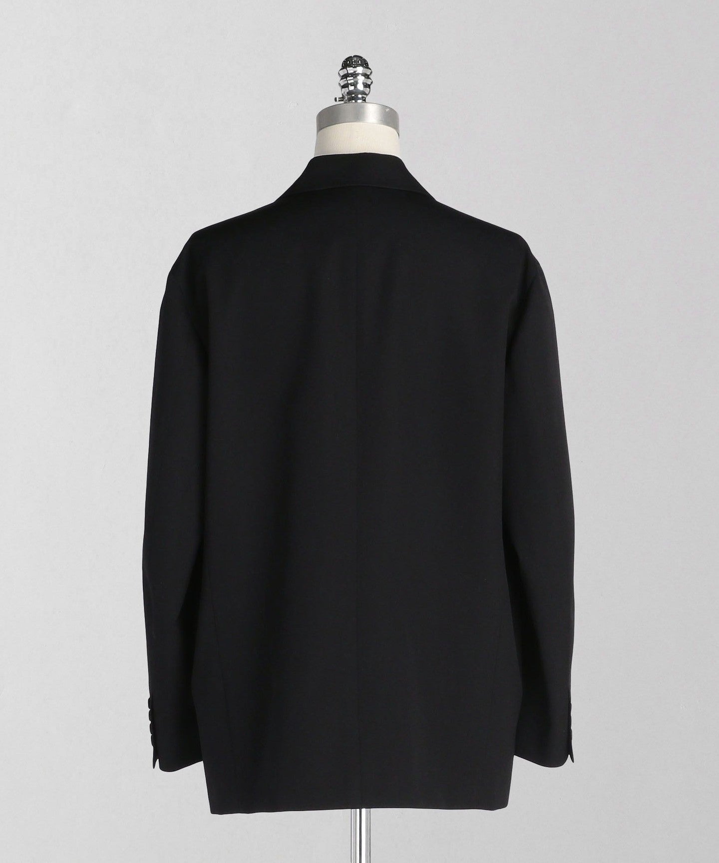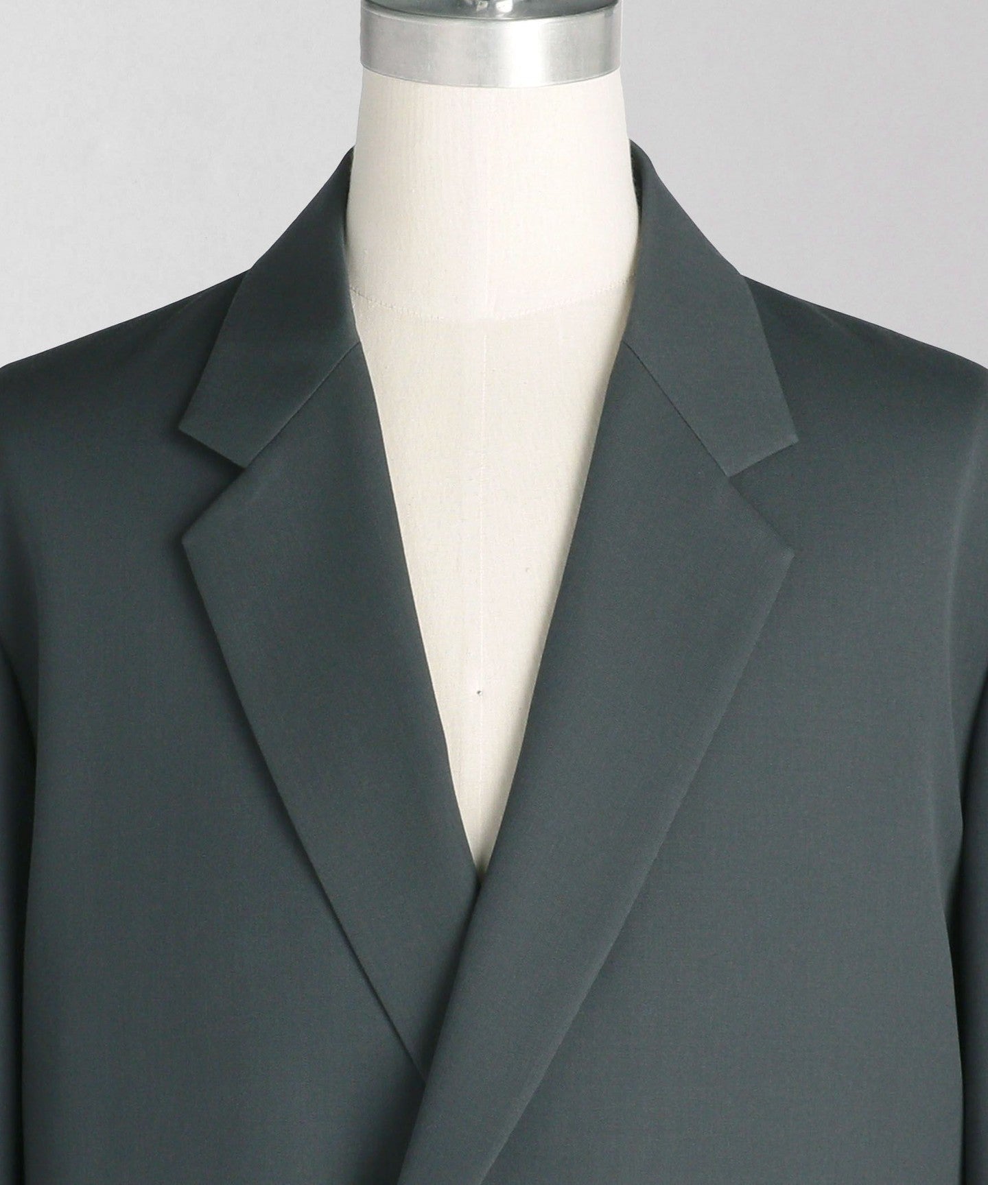 The jacket has a double front and a loose, boxy silhouette, giving it a relaxed yet sharp impression without being too stiff.