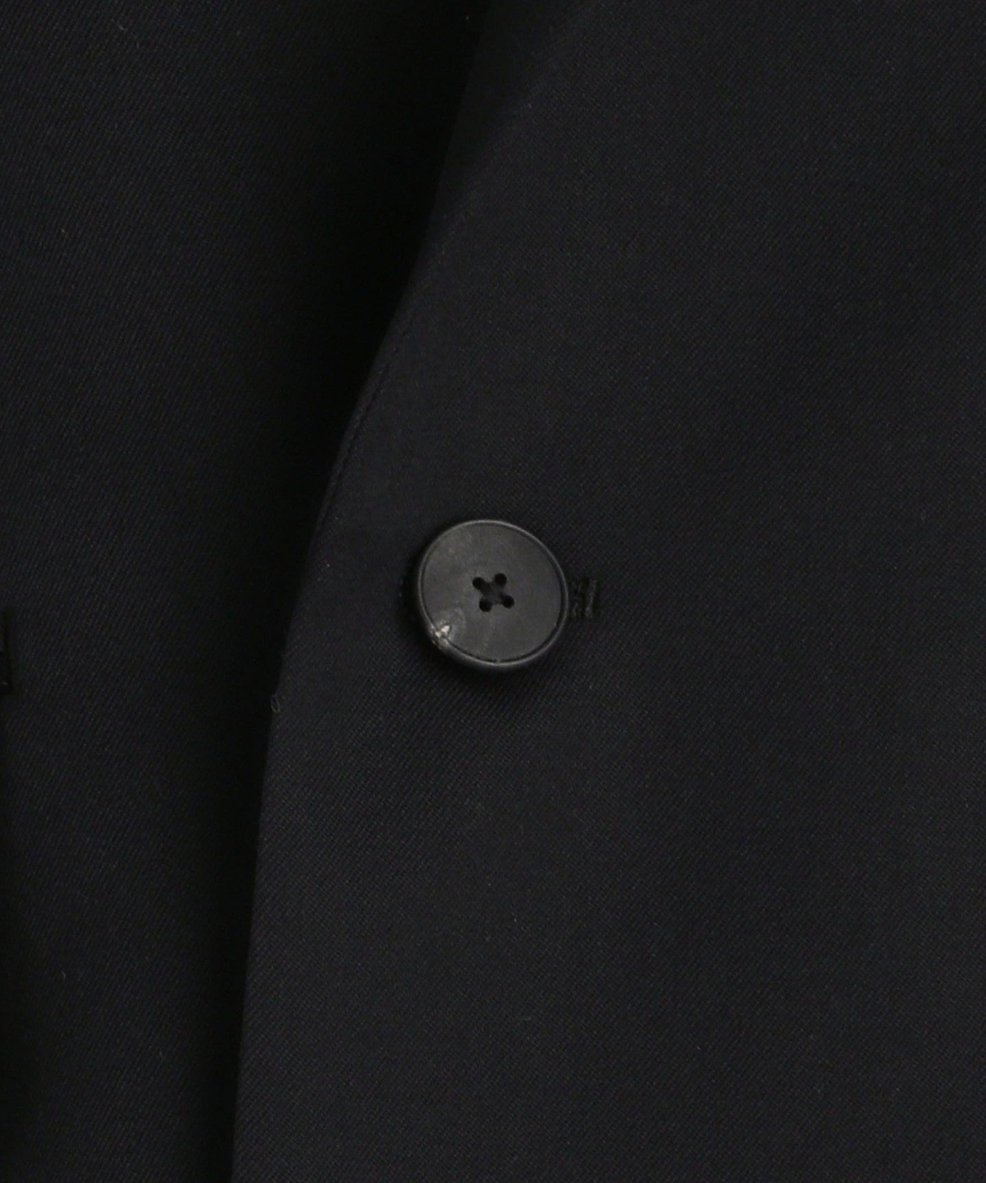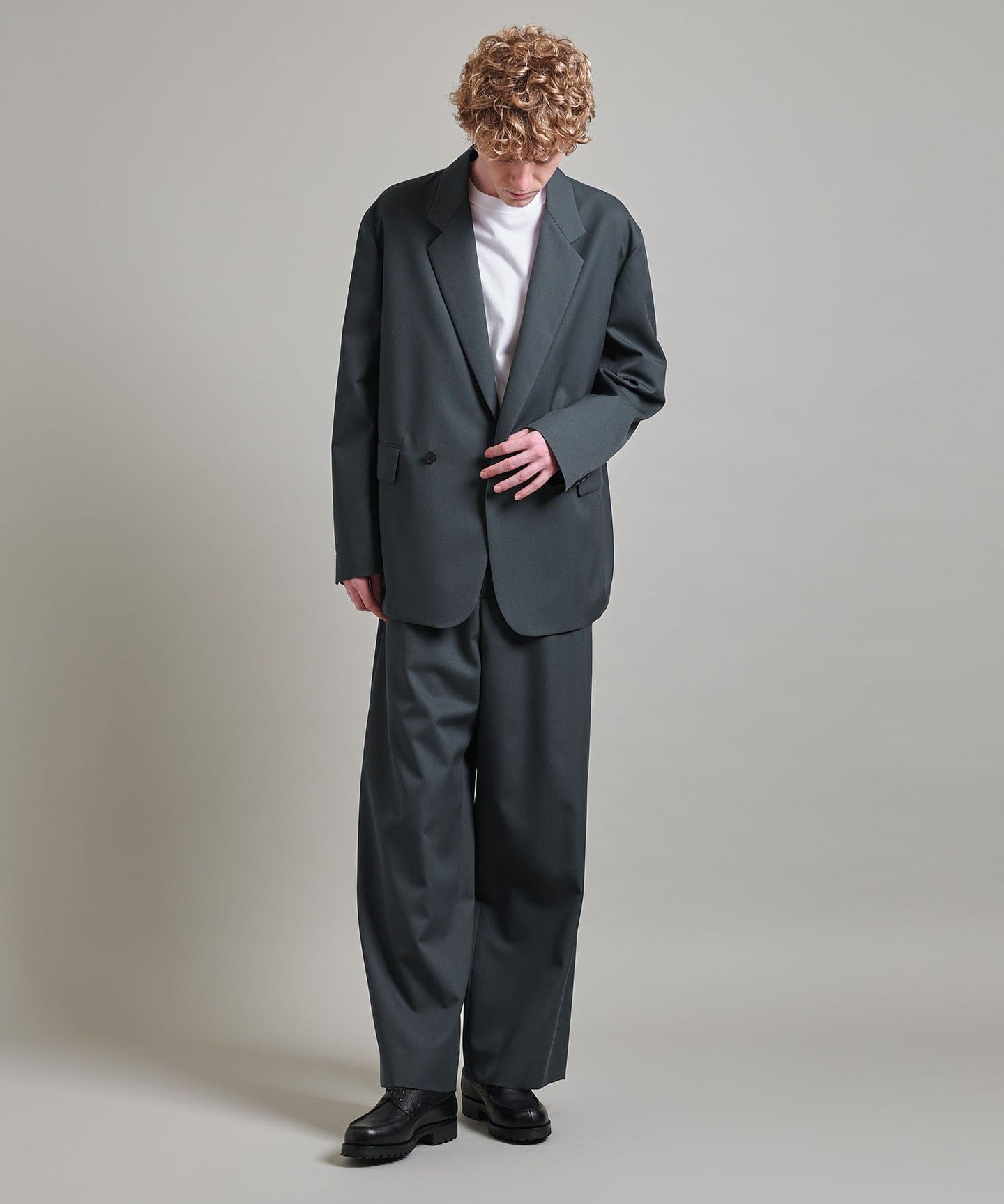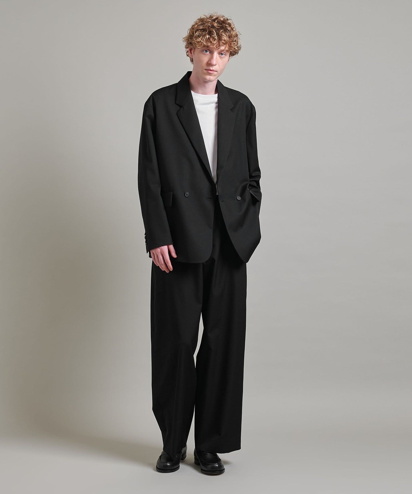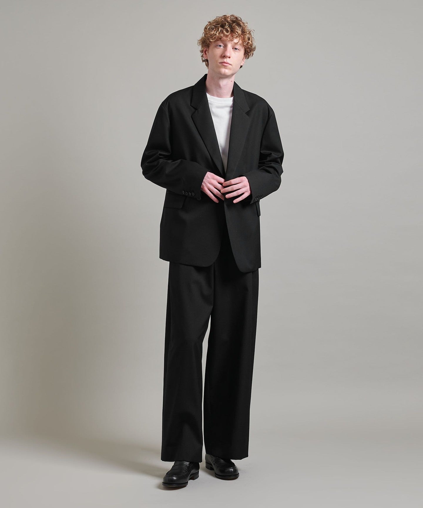 The jacket has a double front and a loose, boxy silhouette, giving it a relaxed yet sharp impression without being too stiff.
