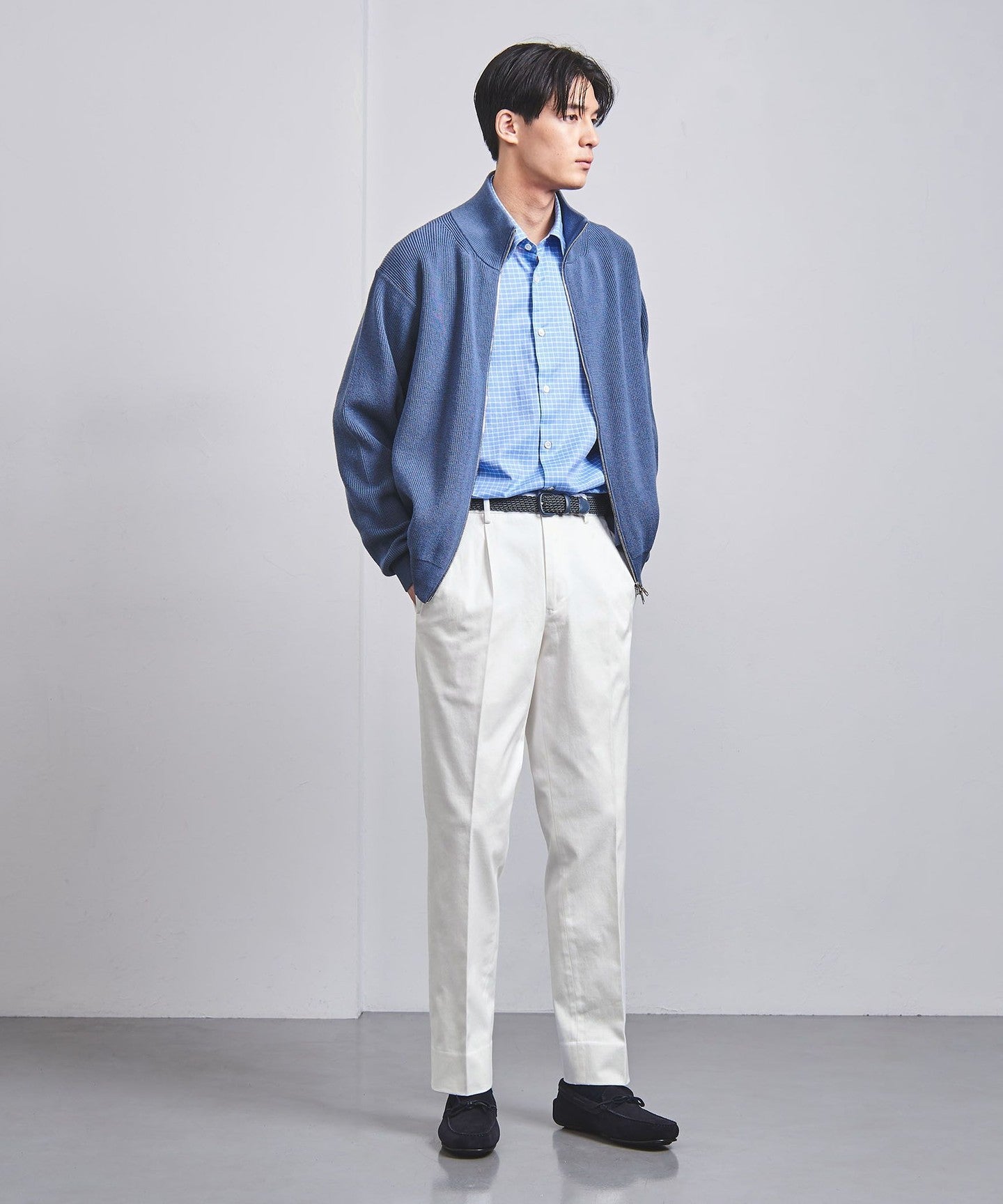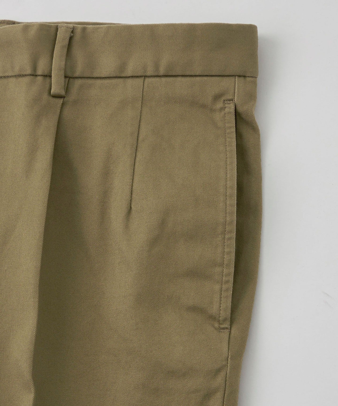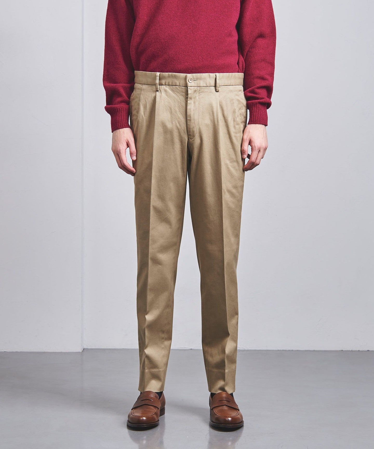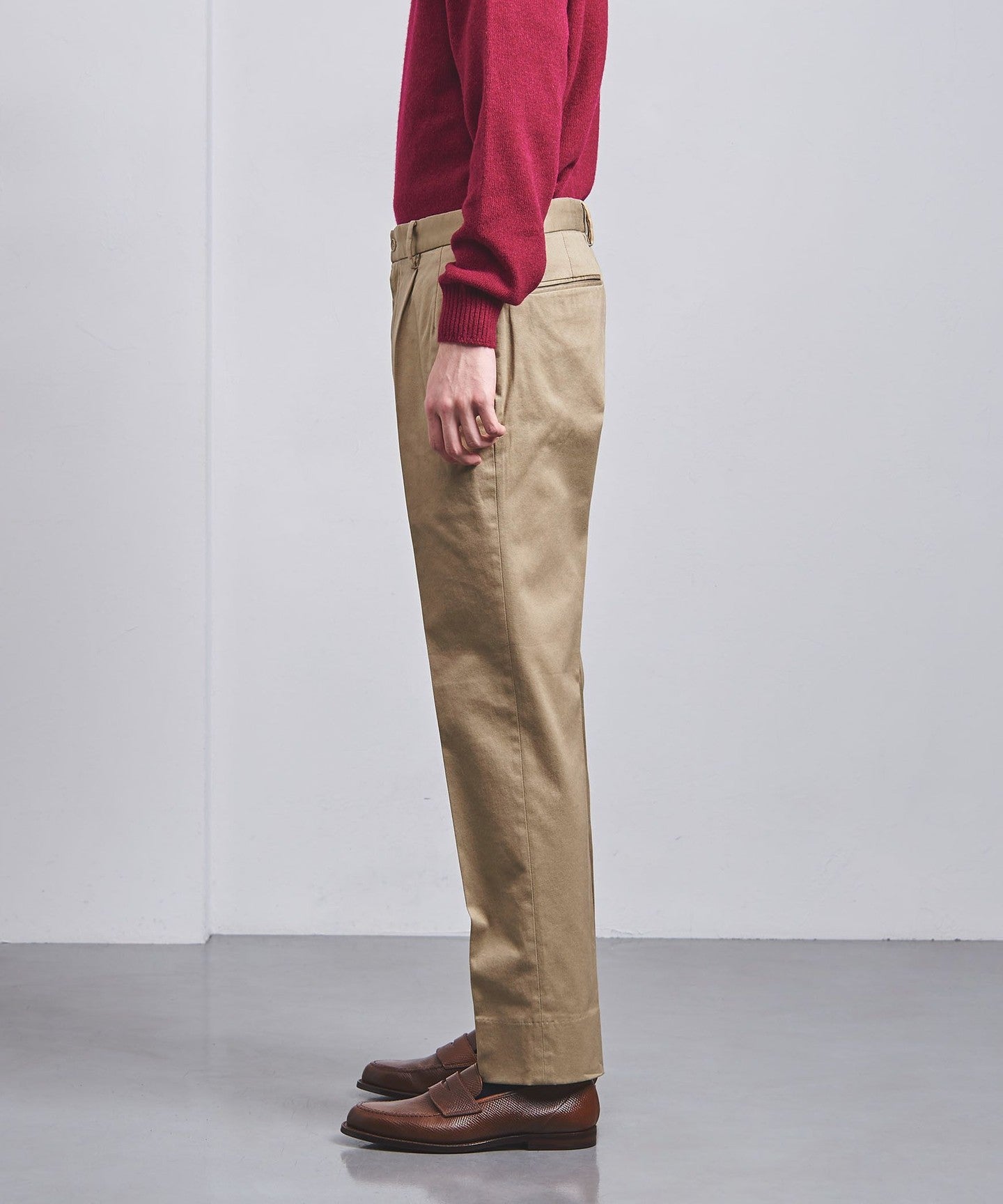 The deep pleats create a slightly loose fit around the waist, while the legs have a moderate tapered silhouette that is neither too narrow nor too wide.