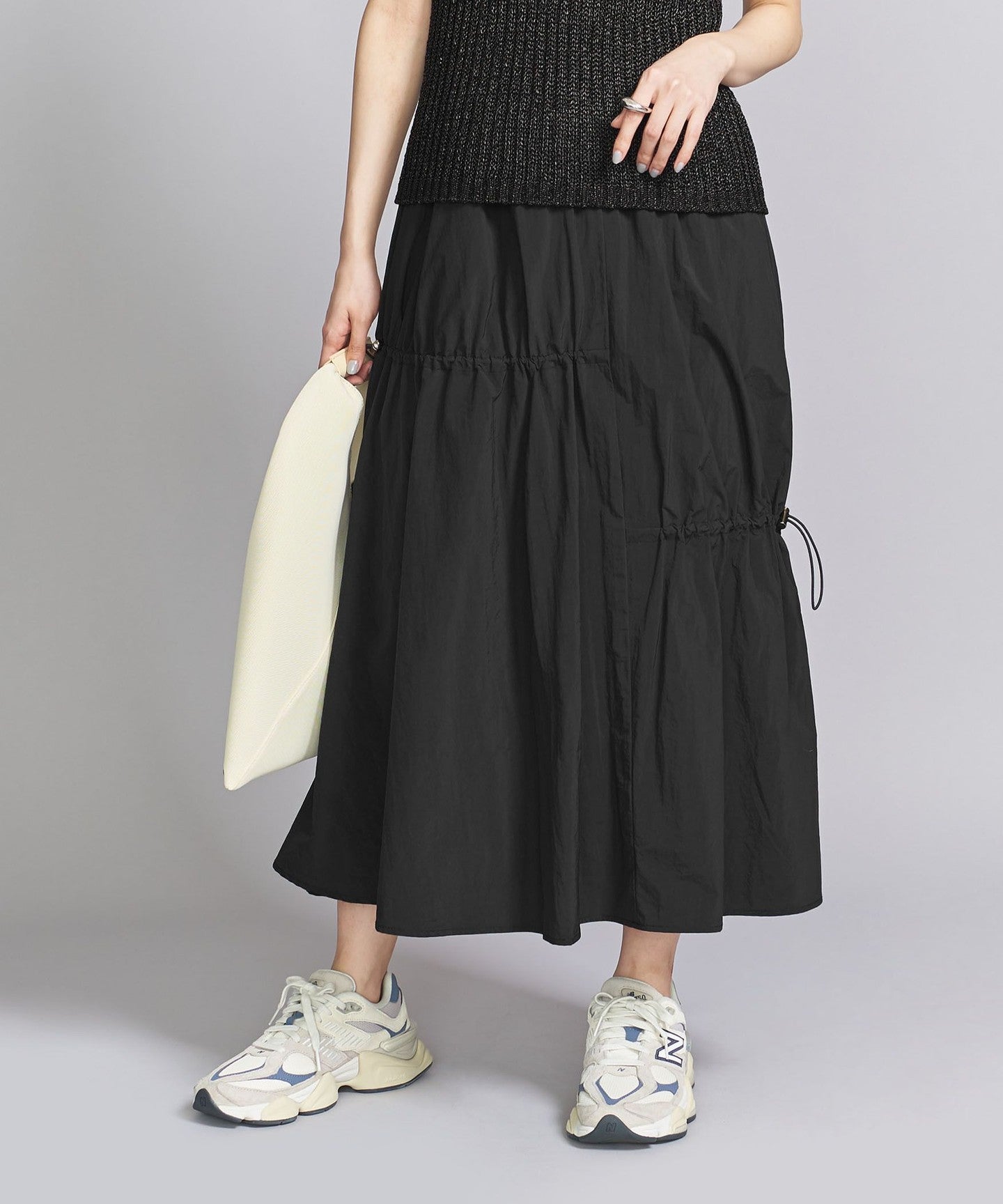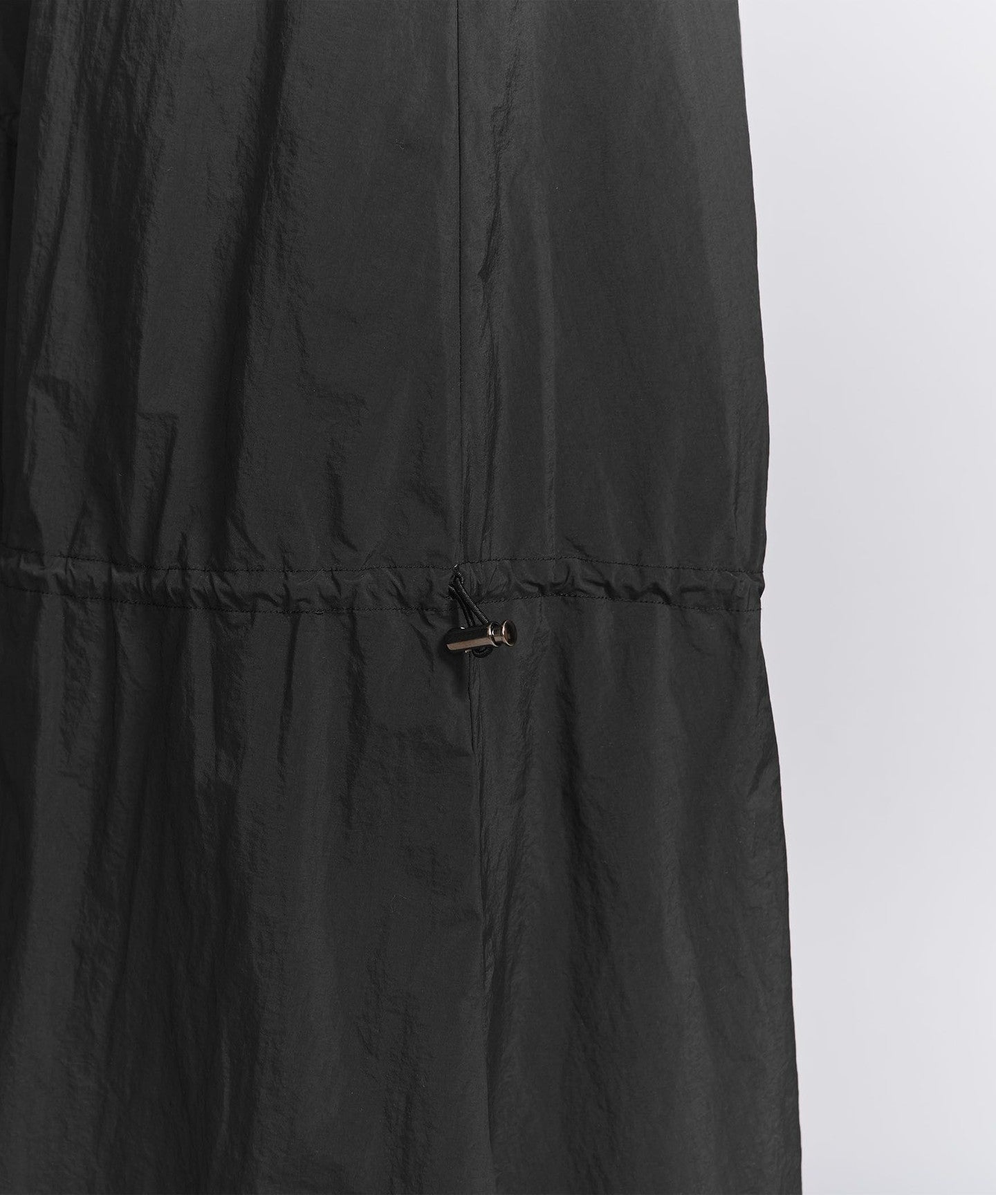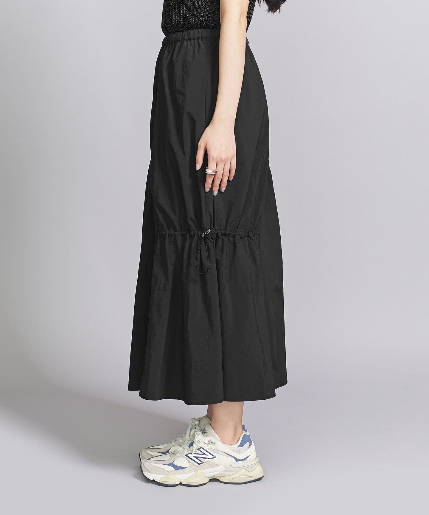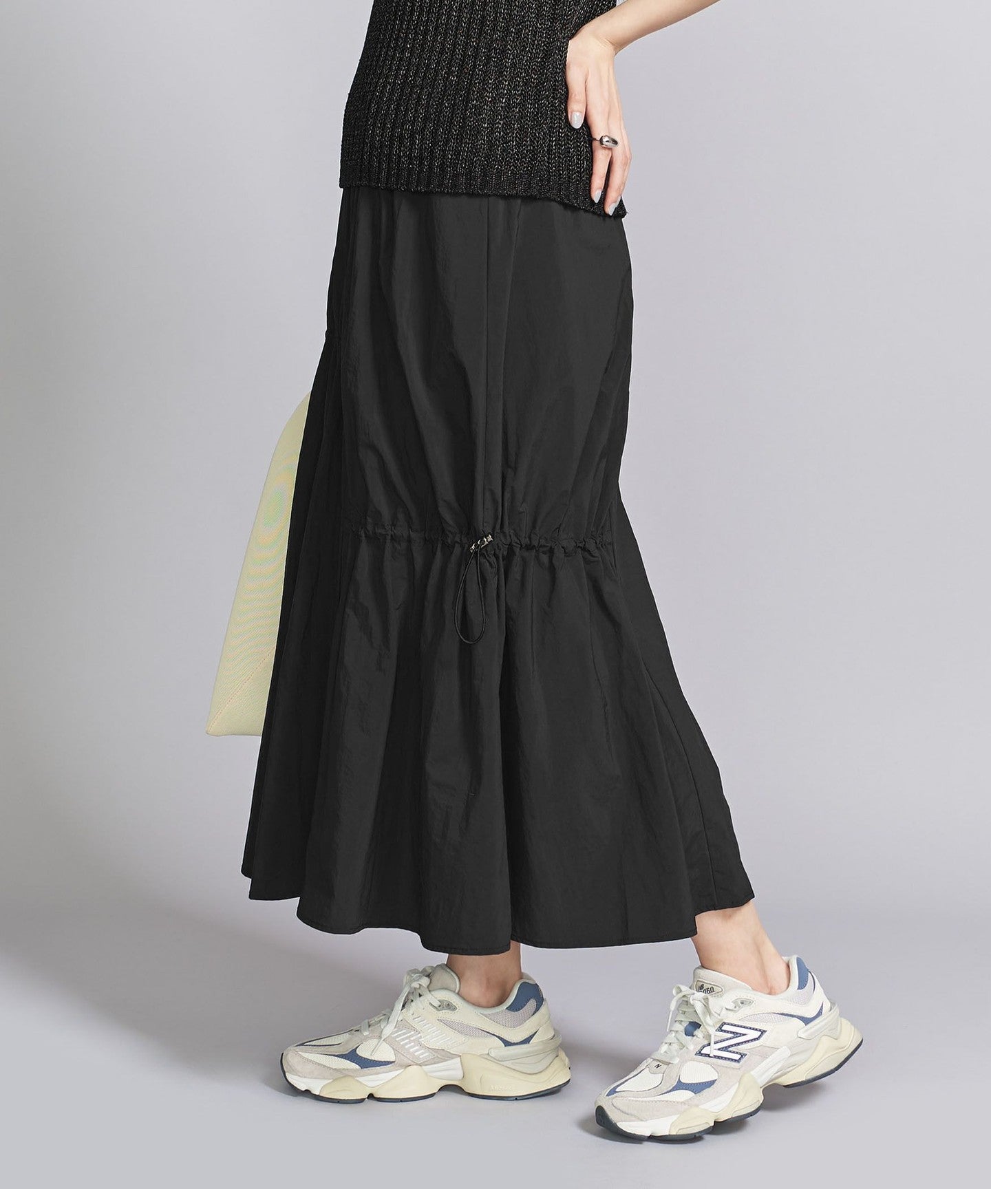 This long skirt features an eye-catching asymmetrical design with drawstrings in different positions on the left and right sides.