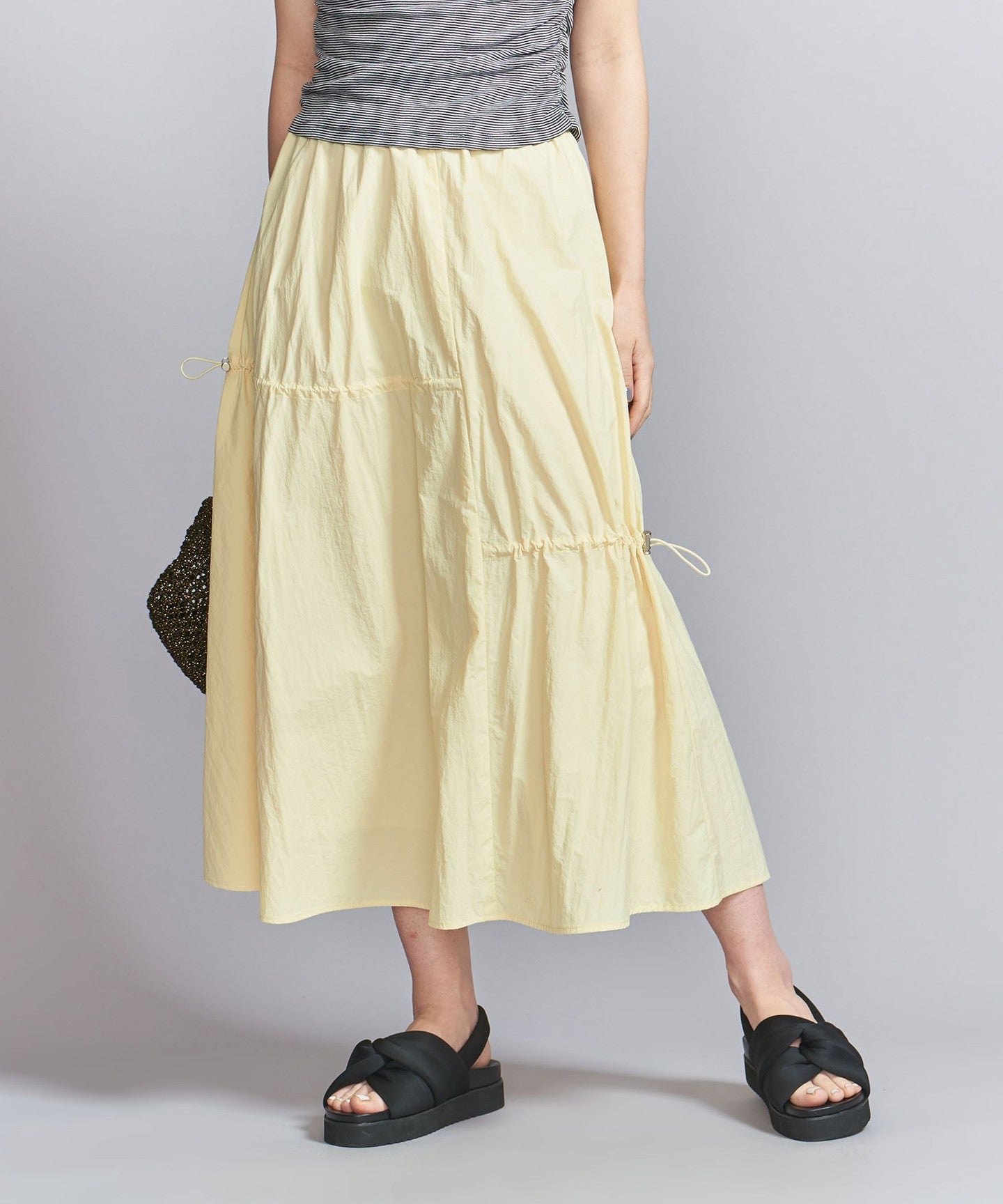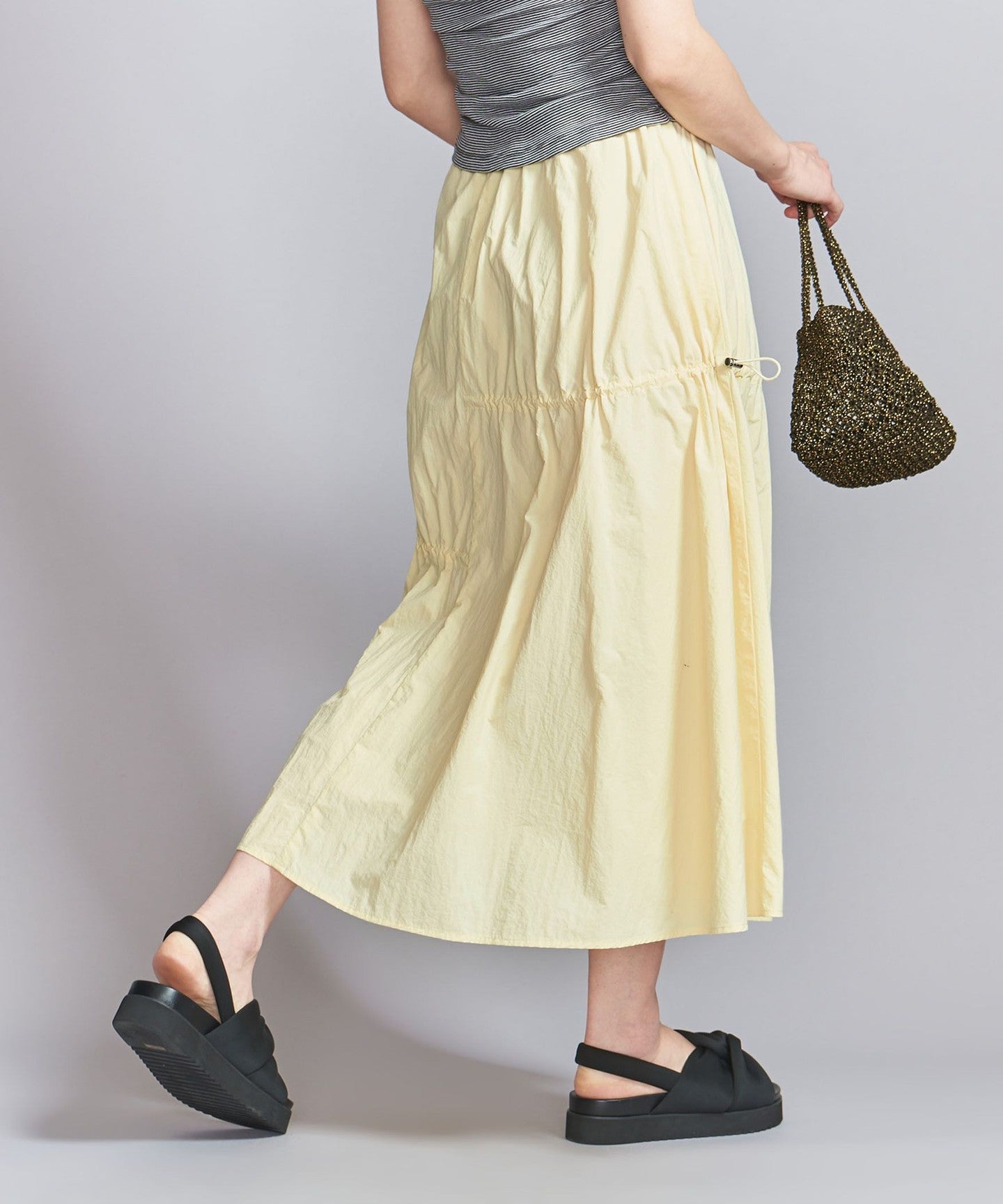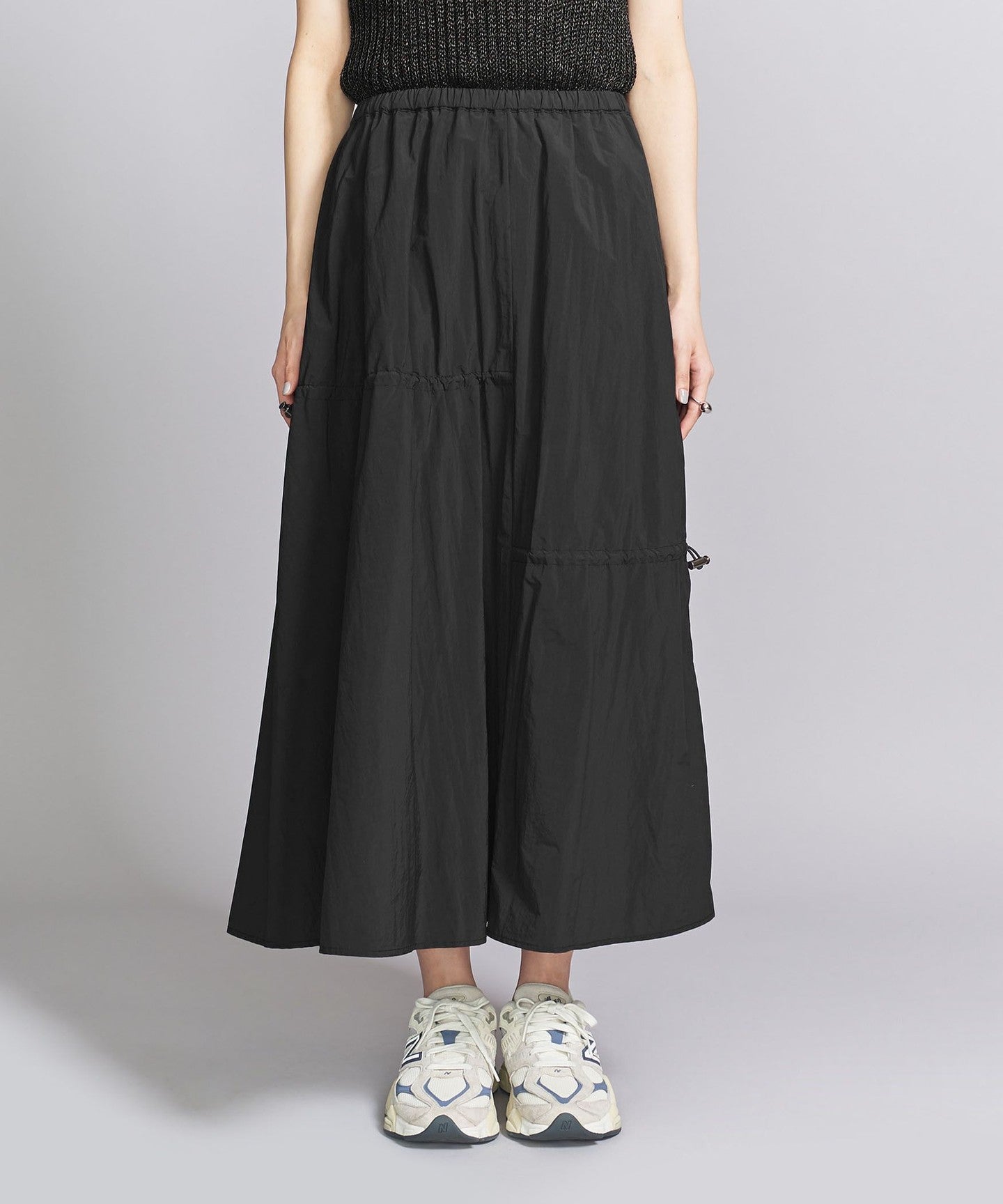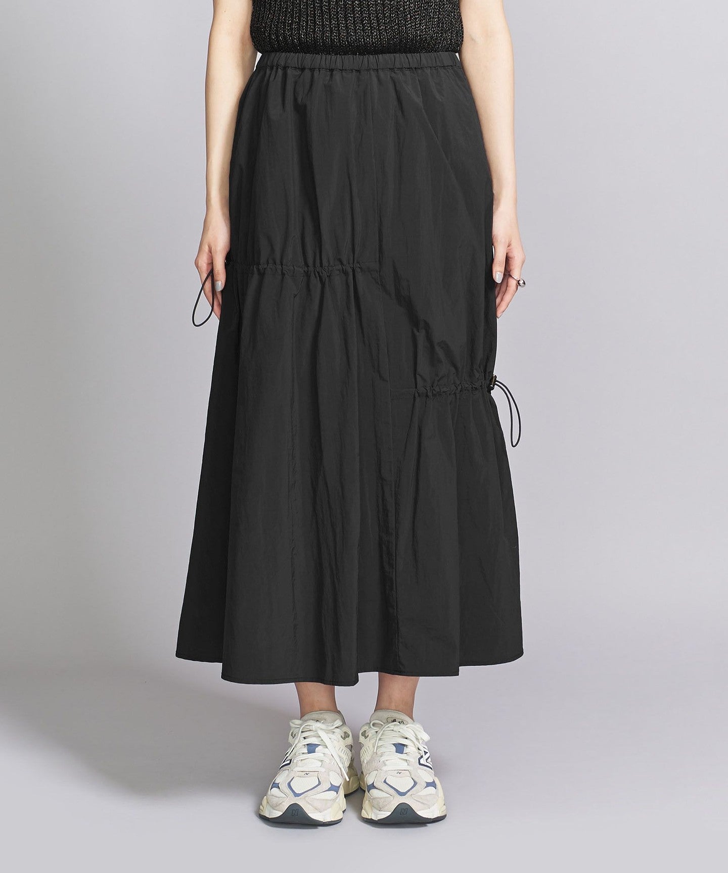 This long skirt features an eye-catching asymmetrical design with drawstrings in different positions on the left and right sides.