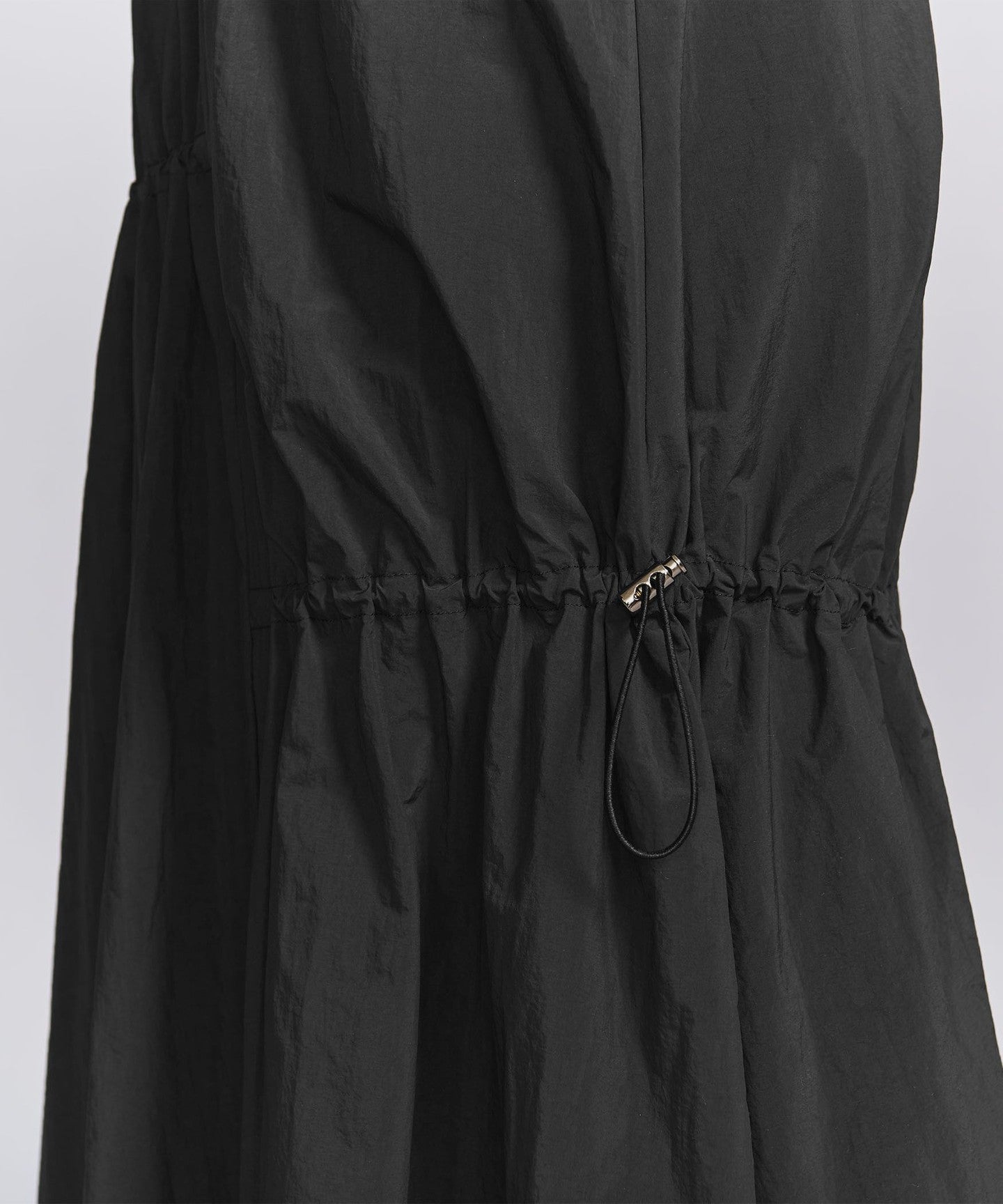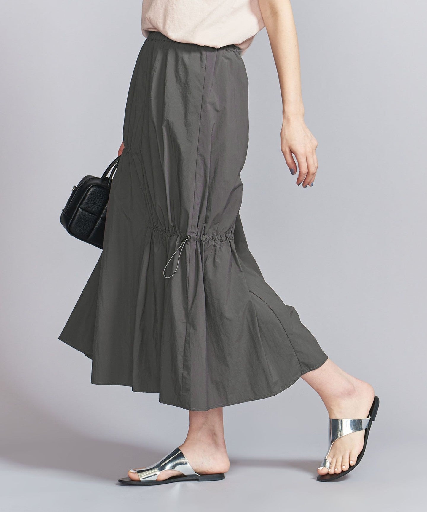 Asymmetrical gathered skirt with drawcord for easy adjustment.