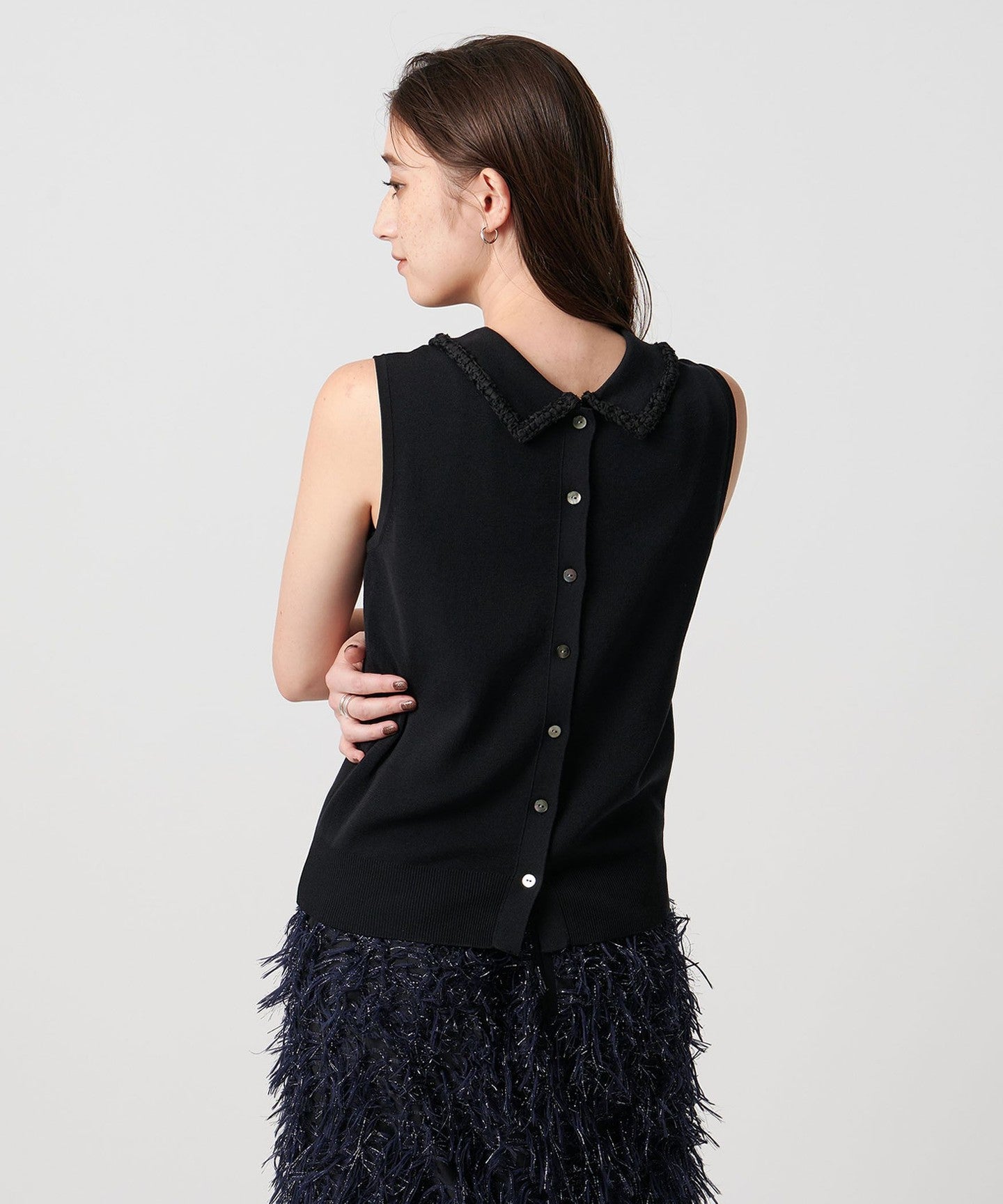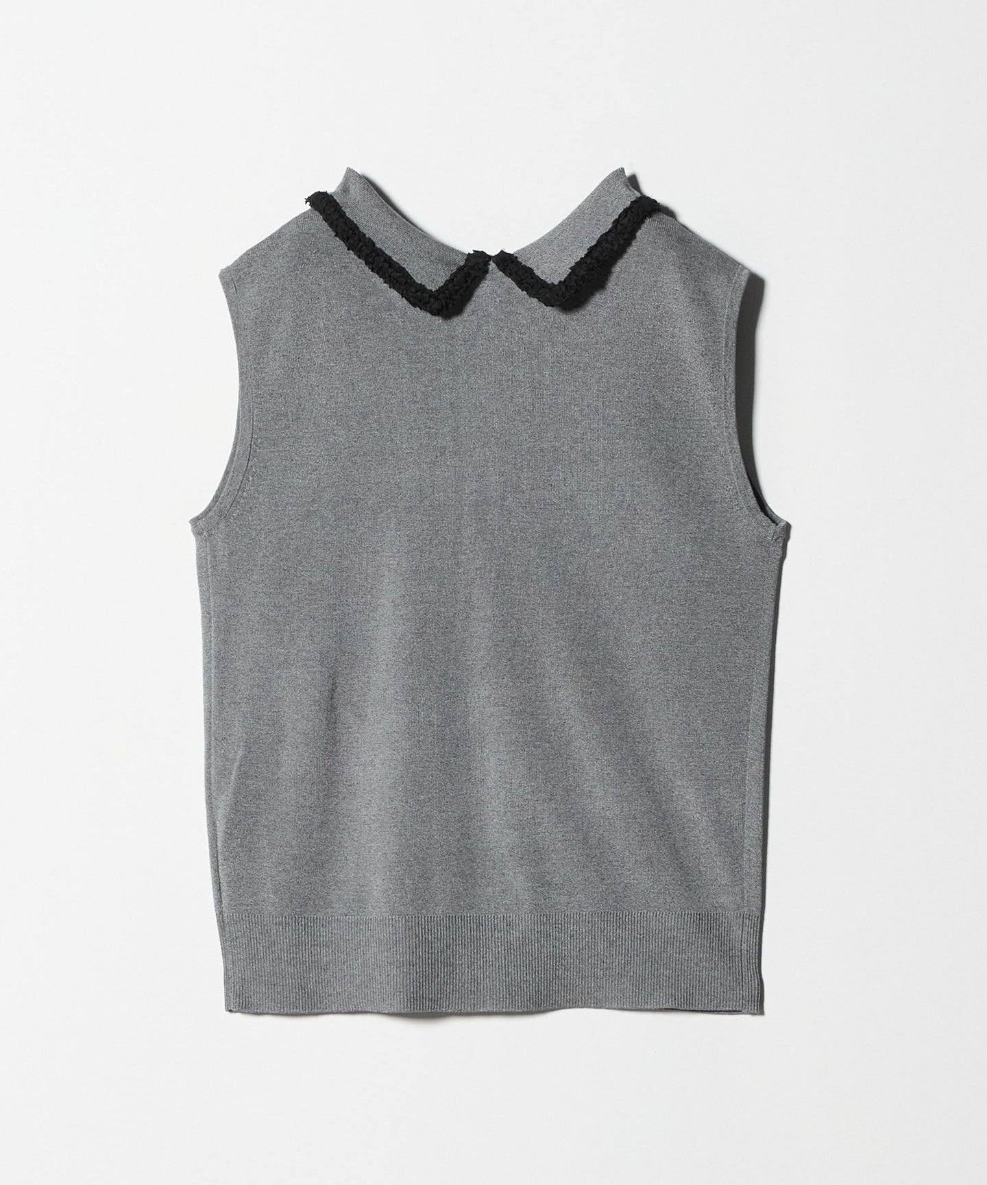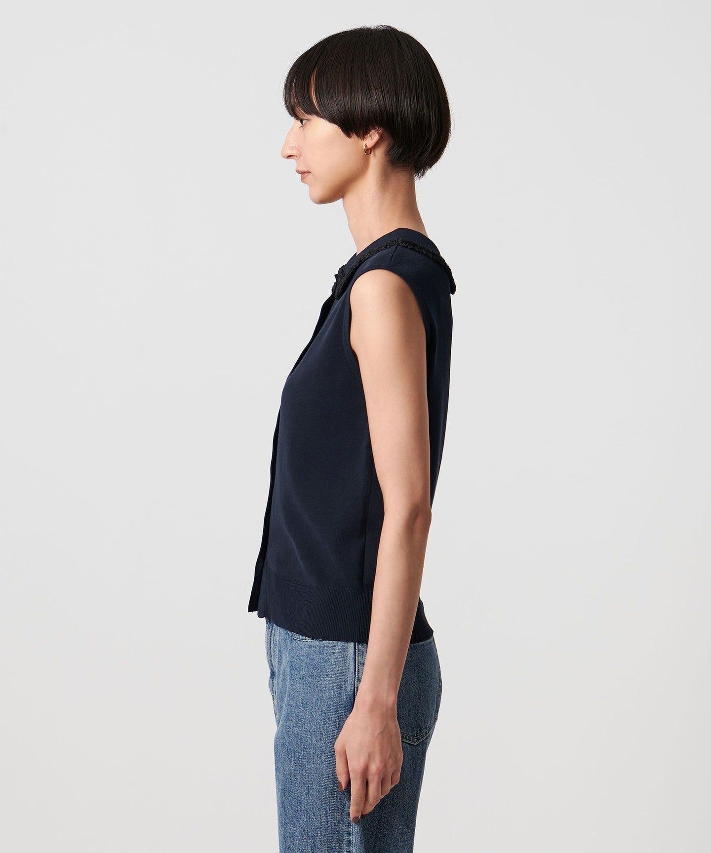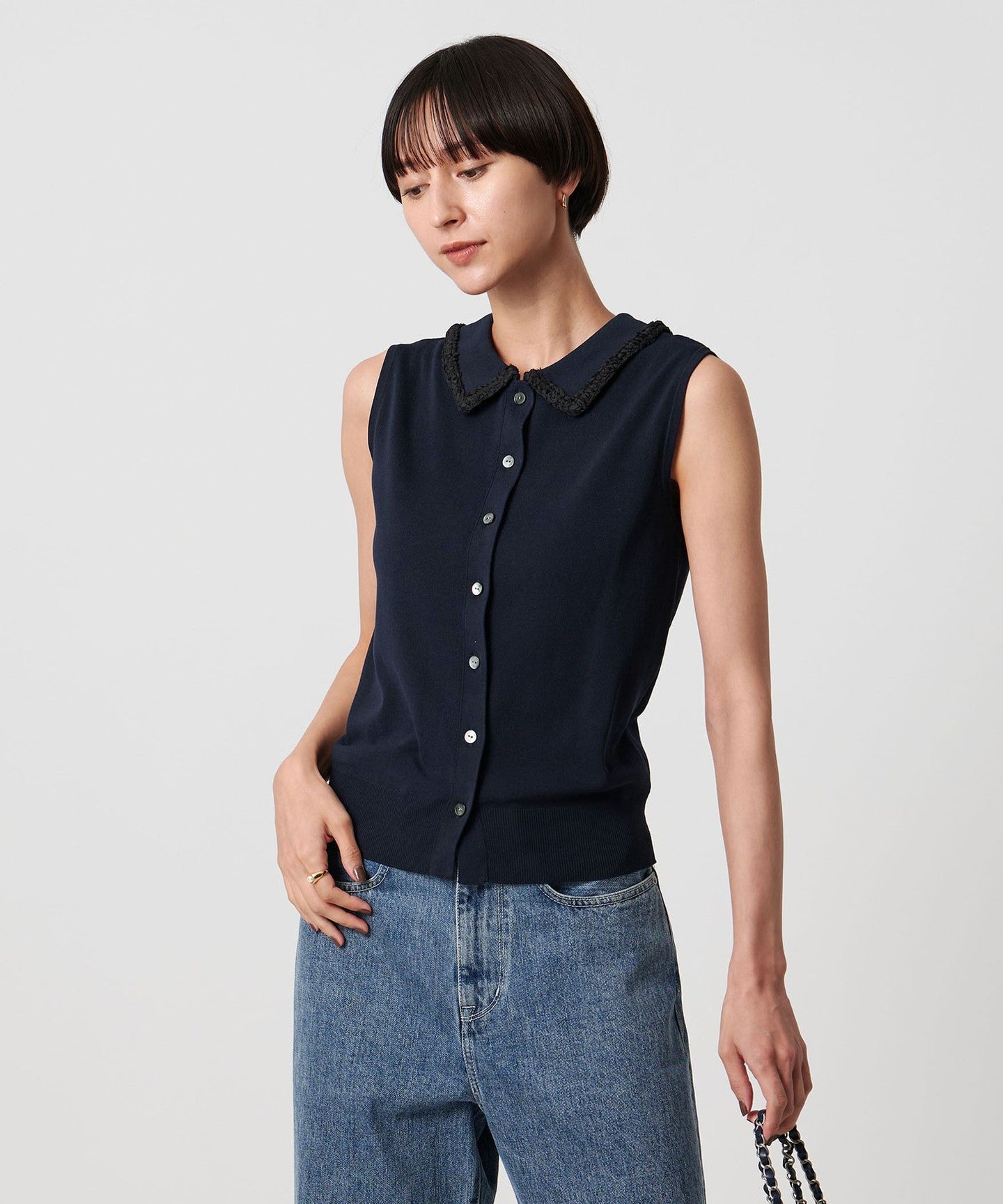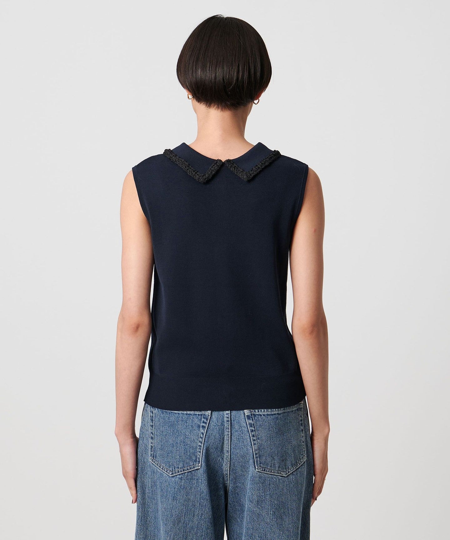 A sleeveless knit with crocheted tape around the collar as an accent design.